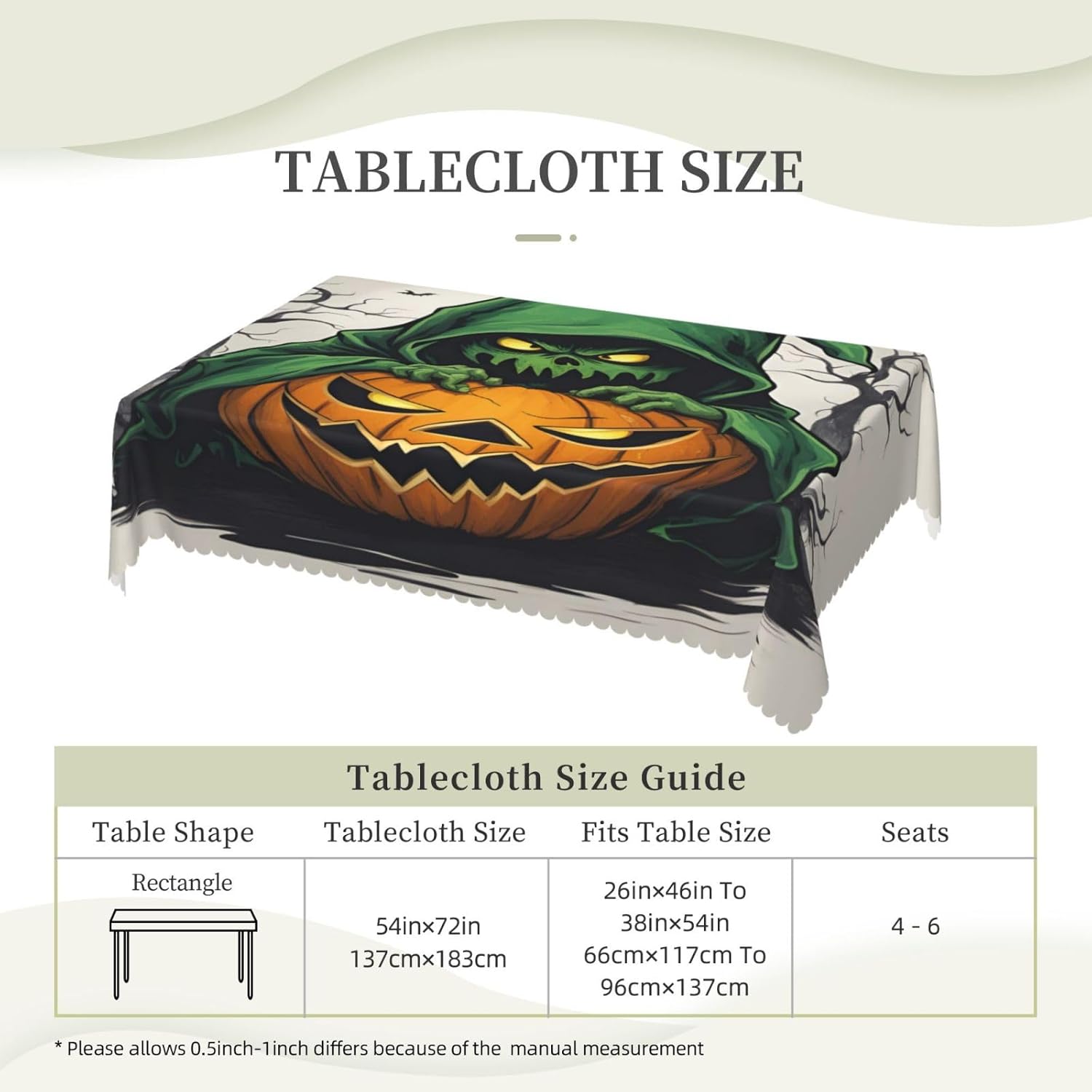 Questa tovaglia decorativa rettangolare Green Ghost Horror Halloween Pumpkin 1 Print Dimensioni 137x183 cm Green Ghost Horror Halloween Pumpkin 1 Print Tovaglia realizzata in materiale poliestere, calda e morbida, buona resistenza alle pieghe, può essere lavata e riutilizzata, protegge da polvere e ammaccature, scheggiature e graffi. Tovaglia Horror Fantasma Verde con Zucca di Halloween 1 Stampa Può essere utilizzata sia all'interno che all'esterno, ideale per feste, matrimoni, campeggio, patio, compleanno in famiglia, buffet, barbecue, tavoli da cucina ecc. Tovaglia Horror Fantasma Verde Quadrata con Zucca di Halloween 1 Stampa Bordo semicircolare in pizzo Attenzione: Non candeggiare, non esporre alla luce solare, lavare sia a mano che in lavatrice a temperatura ambiente e stirare a bassa temperatura La temperatura è accettabile In caso di problemi o domande, contattaci, ti risponderemo entro 24 ore