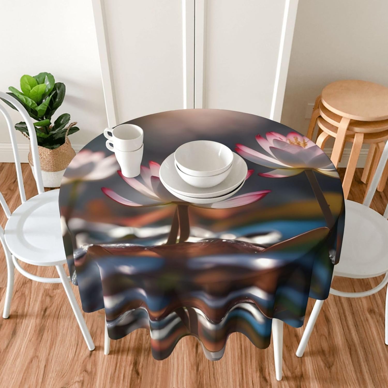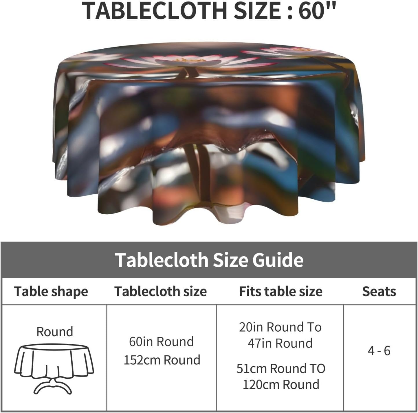 Bellissimo motivo: questa tovaglia è stampata con un bellissimo motivo a fiori di loto, che illuminerà la tua sala da pranzo, il soggiorno e il patio con un aspetto fresco. MATERIALE DI ALTA QUALITÀ: questa tovaglia da 60" x 60" è realizzata in tessuto di poliestere di alta qualità, resistente alle pieghe, alle macchie, all'acqua e durevole. Proteggi la tavola: Con questa tovaglia la tua tavola non si sporcherà facilmente con oli e salse. Inoltre protegge il tuo tavolo da graffi e urti e lo fa sembrare nuovo. Adatto a molteplici occasioni: adatto per ogni occasione a casa, festa, hotel, ristorante, bar, cucina, patio o sala da pranzo. Puoi trovare la tovaglia giusta da abbinare a stoviglie, posate, tovaglioli, tovagliette e altre decorazioni. Durevole e adatto per uso interno ed esterno. Istruzioni per la cura: basta pulire con un panno umido per mantenere la tovaglia fresca e pulita. Lavare in lavatrice in acqua fredda, non candeggiare. Se necessario stirare a bassa temperatura dal rovescio della tovaglia.