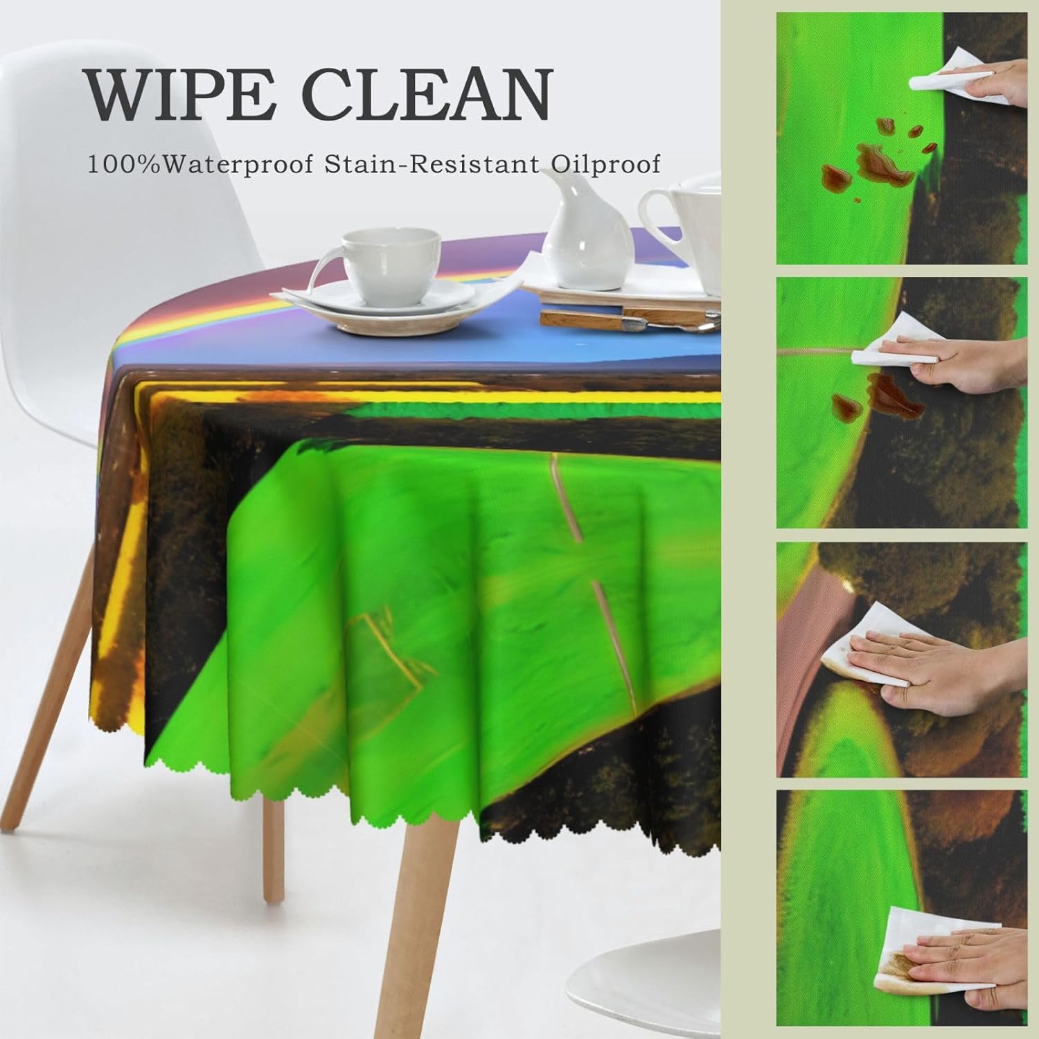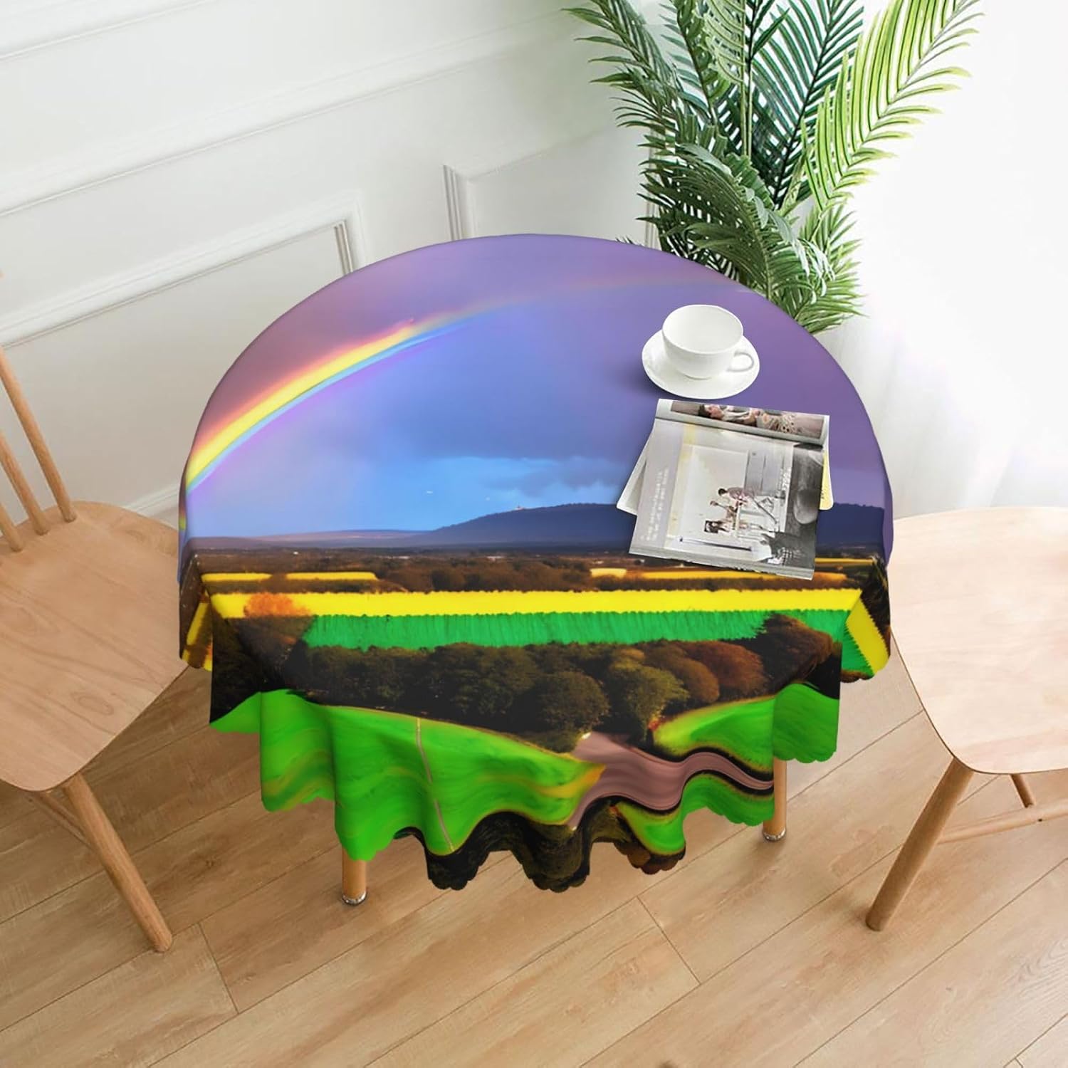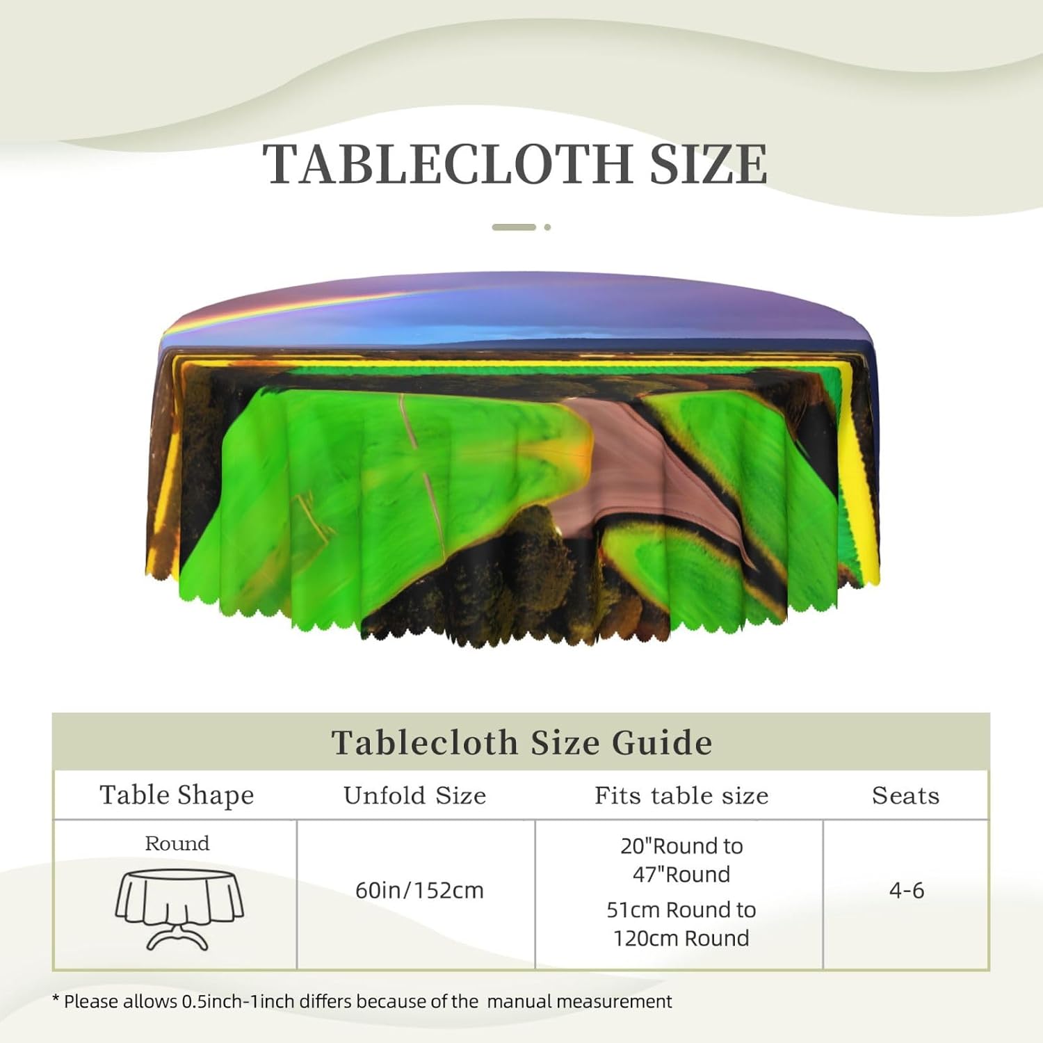 【Tovaglia rotonda da sera arcobaleno da 60 pollici】 Questa tovaglia ha un fascino unico e prestazioni eccellenti, rendendola la prima scelta per molte famiglie e luoghi. Utilizza la stampa transfer, con motivi chiari e delicati, aggiunge un tocco artistico al tavolo da pranzo. 【Tessuto di alta qualità】 Realizzato al 100% in poliestere, è idrorepellente e morbido al tatto. È resistente alle pieghe e può essere lavato e riutilizzato, il che può proteggere il tavolo da pranzo da graffi e macchie, facendolo sembrare nuovo. Ampia gamma di scenari applicativi: varie occasioni di pranzo e riunioni di tavole rotonde interne ed esterne. Che si tratti di una riunione di famiglia o di un luogo commerciale, può mostrare un fascino unico.,Misura applicabile: la nostra tovaglia ha un diametro di 60 pollici (152 cm). A causa dei diversi metodi di misurazione, la dimensione può variare di 2-4 cm. Scegli l'acquisto in base alla tua tabella,Facile da riporre e mantenere: gli accessori includono solo una tovaglia, semplice e facile da riporre. Lavare a mano o in lavatrice a temperatura ambiente. Fare attenzione a non candeggiare o esporre al sole e stirare a bassa temperatura per mantenerlo in buone condizioni