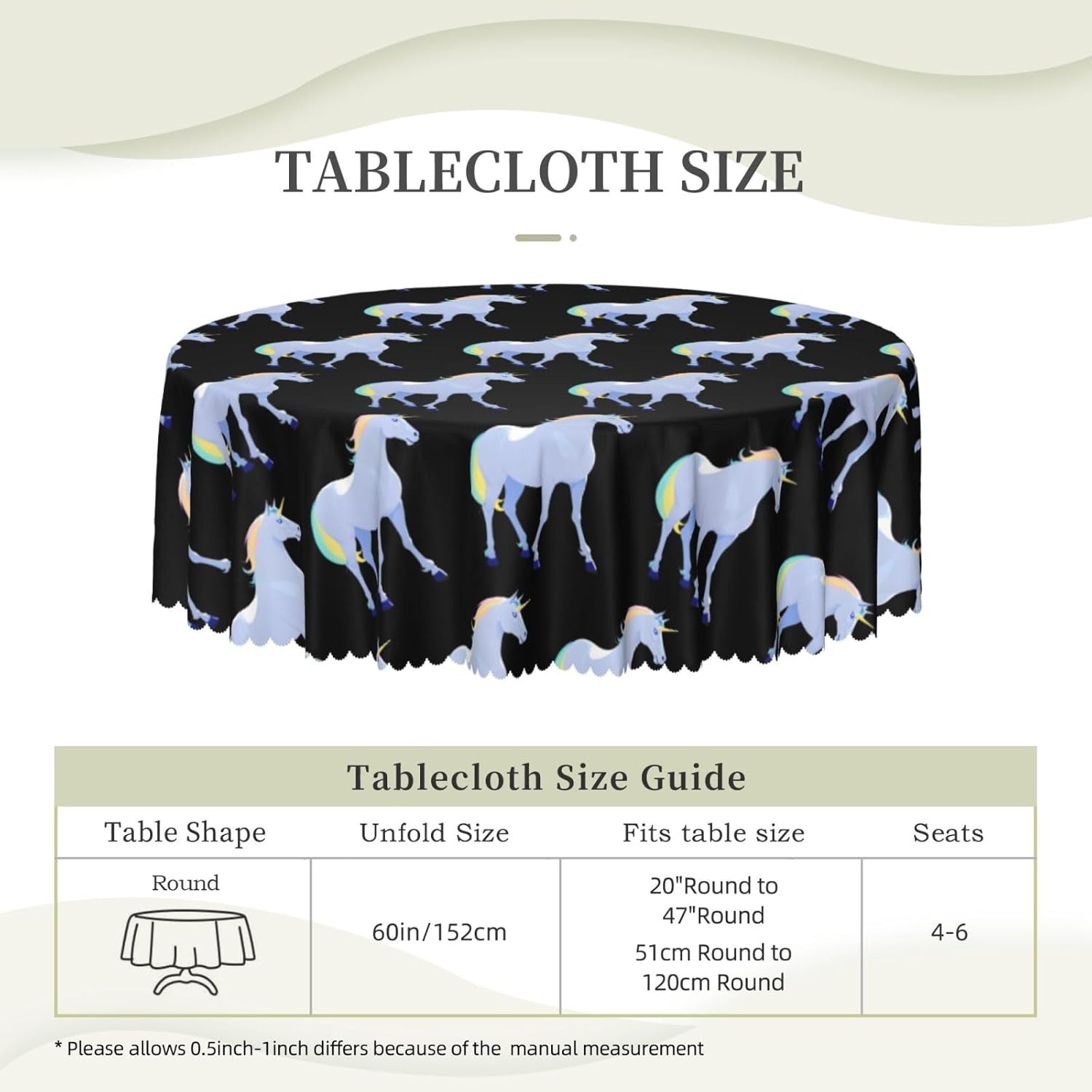 【Tovaglia rotonda da 60 pollici con sagoma di unicorno】 Questa tovaglia ha un fascino unico e prestazioni eccellenti, rendendola la prima scelta per molte famiglie e luoghi. Utilizza la stampa transfer, con motivi chiari e delicati, aggiunge un tocco artistico al tavolo da pranzo. 【Tessuto di alta qualità】 Realizzato al 100% in poliestere, è idrorepellente e morbido al tatto. È resistente alle pieghe e può essere lavato e riutilizzato, il che può proteggere il tavolo da pranzo da graffi e macchie, facendolo sembrare nuovo. Ampia gamma di scenari applicativi: varie occasioni di pranzo e riunioni di tavole rotonde interne ed esterne. Che si tratti di una riunione di famiglia o di un luogo commerciale, può mostrare un fascino unico.,Misura applicabile: la nostra tovaglia ha un diametro di 60 pollici (152 cm). A causa dei diversi metodi di misurazione, la dimensione può variare di 2-4 cm. Scegli l'acquisto in base alla tua tabella,Facile da riporre e mantenere: gli accessori includono solo una tovaglia, semplice e facile da riporre. Lavare a mano o in lavatrice a temperatura ambiente. Fare attenzione a non candeggiare o esporre al sole e stirare a bassa temperatura per mantenerlo in buone condizioni