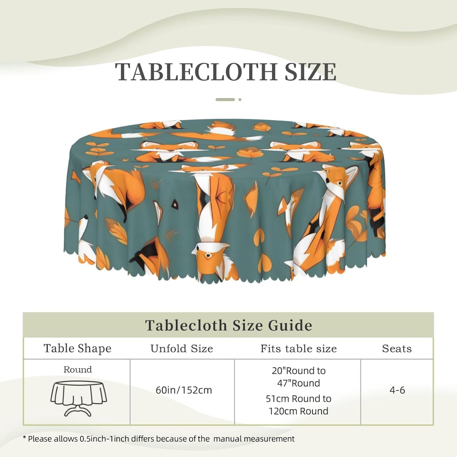 【Tovaglia rotonda da 60 pollici Yellow Fox】 Questa tovaglia ha un fascino unico e prestazioni eccellenti, rendendola la prima scelta per molte famiglie e luoghi. Utilizza la stampa transfer, con motivi chiari e delicati, aggiunge un tocco artistico al tavolo da pranzo. 【Tessuto di alta qualità】 Realizzato al 100% in poliestere, è idrorepellente e morbido al tatto. È resistente alle pieghe e può essere lavato e riutilizzato, il che può proteggere il tavolo da pranzo da graffi e macchie, facendolo sembrare nuovo. Ampia gamma di scenari applicativi: varie occasioni di pranzo e riunioni di tavole rotonde interne ed esterne. Che si tratti di una riunione di famiglia o di un luogo commerciale, può mostrare un fascino unico.,Misura applicabile: la nostra tovaglia ha un diametro di 60 pollici (152 cm). A causa dei diversi metodi di misurazione, la dimensione può variare di 2-4 cm. Scegli l'acquisto in base alla tua tabella,Facile da riporre e mantenere: gli accessori includono solo una tovaglia, semplice e facile da riporre. Lavare a mano o in lavatrice a temperatura ambiente. Fare attenzione a non candeggiare o esporre al sole e stirare a bassa temperatura per mantenerlo in buone condizioni