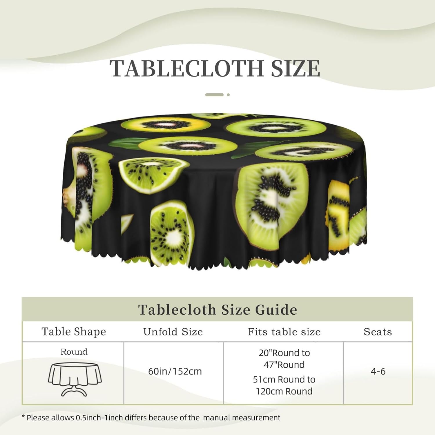 【Tovaglia rotonda da 60 pollici verde kiwi】 Questa tovaglia ha un fascino unico e prestazioni eccellenti, rendendola la prima scelta per molte famiglie e luoghi. Utilizza la stampa transfer, con motivi chiari e delicati, aggiunge un tocco artistico al tavolo da pranzo. 【Tessuto di alta qualità】 Realizzato al 100% in poliestere, è idrorepellente e morbido al tatto. È resistente alle pieghe e può essere lavato e riutilizzato, il che può proteggere il tavolo da pranzo da graffi e macchie, facendolo sembrare nuovo. Ampia gamma di scenari applicativi: varie occasioni di pranzo e riunioni di tavole rotonde interne ed esterne. Che si tratti di una riunione di famiglia o di un luogo commerciale, può mostrare un fascino unico.,Misura applicabile: la nostra tovaglia ha un diametro di 60 pollici (152 cm). A causa dei diversi metodi di misurazione, la dimensione può variare di 2-4 cm. Scegli l'acquisto in base alla tua tabella,Facile da riporre e mantenere: gli accessori includono solo una tovaglia, semplice e facile da riporre. Lavare a mano o in lavatrice a temperatura ambiente. Fare attenzione a non candeggiare o esporre al sole e stirare a bassa temperatura per mantenerlo in buone condizioni
