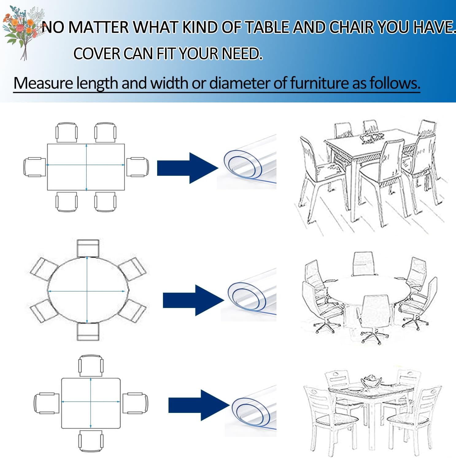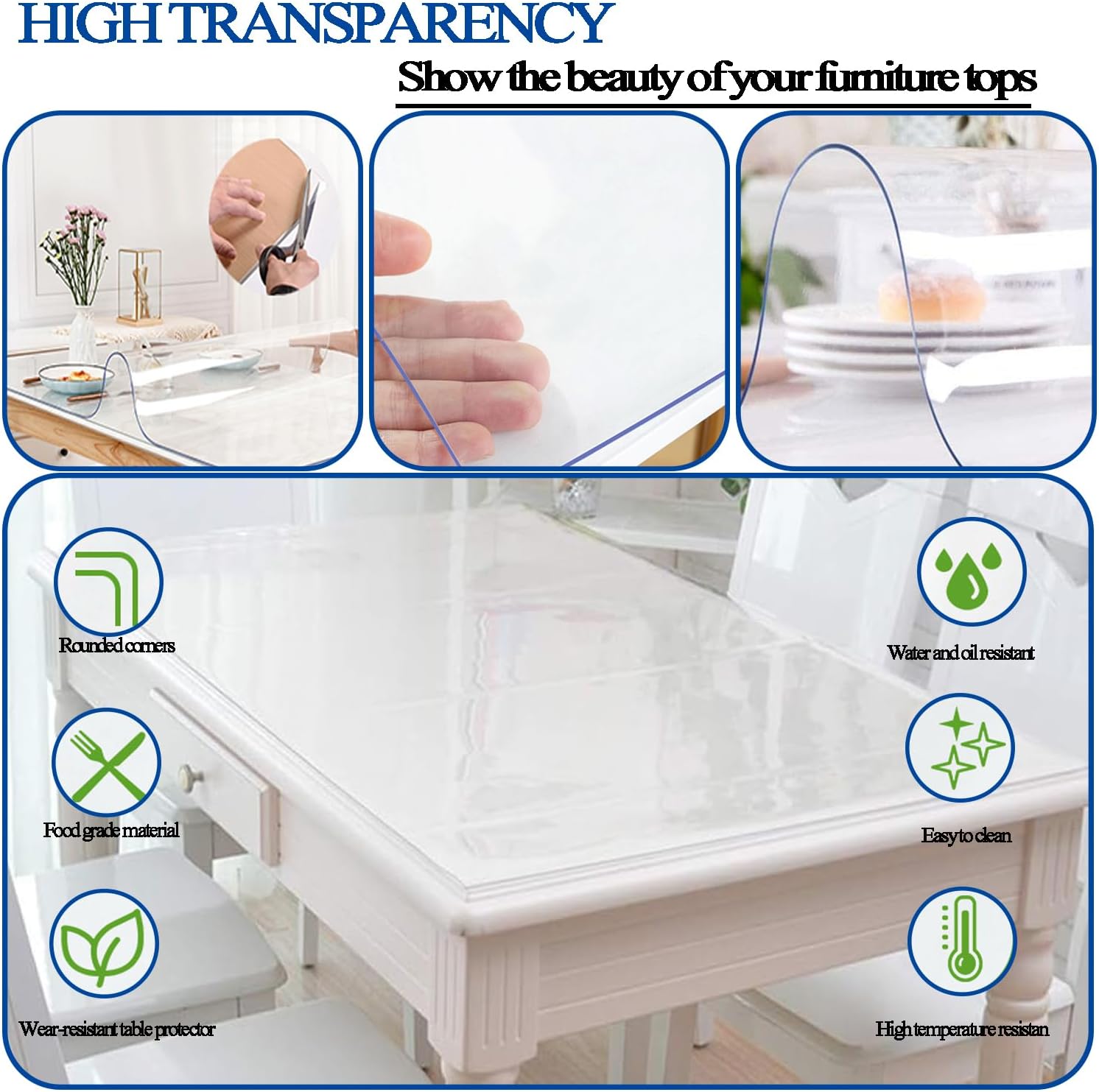 Protezione per tovaglietta: il tappetino da tavolo in PVC trasparente è completamente trasparente e può mostrare la bellezza del tuo tavolo. Può proteggere il tavolo da graffi, usura, macchie, fuoriuscite e danni. È una scelta ideale per proteggere la tovaglia o il tavolo prezioso. Ecologico e inodore, non contiene oftalato, formaldeide e metalli pesanti, può essere a diretto contatto con gli alimenti, protegge la salute di te e della tua famiglia. Manutenzione completa: la tovaglia in plastica con angoli arrotondati e tecnologia dei bordi smussati può passare senza problemi con il tavolo da pranzo, pur essendo resistente agli urti e ai graffi, rendendola ideale per famiglie con bambini e donne incinte. Ha un'elevata durezza, stabilità e resistenza al calore, protegge il piano del tavolo da macchie, graffi, usura, abrasioni e alte temperature. Facile da pulire: la tovaglia in PVC è lavabile. Hai solo bisogno di un panno umido per pulire facilmente questo tappetino in PVC e pulire tutte le macchie sulla sua superficie. Sembrerà di nuovo come nuovo. Ci sono molte dimensioni tra cui scegliere e possiamo anche fornirti servizi personalizzati. Puoi dirci la taglia di cui hai bisogno e te la faremo il prima possibile. Ampia gamma di applicazioni: protezione eccellente: protezioni per scrivania, adatte per tavoli e scrivanie in legno antico, legno o vetro, granito o marmo, tavoli da pranzo da cucina, protezione per mobili, piani di lavoro della cucina o piano cottura, scrivanie, protezioni per tavoli da pranzo, proteggono i tuoi mobili. Per vetro, marmo o altre superfici lisce, si prega di utilizzare una tovaglia con una superficie ruvida per evitare bolle Come rendere piatti i tappetini per sedie in PVC: (quando si ricevono i tappetini arrotolati, è possibile utilizzare i seguenti metodi per renderli piatti). ① Stenderli sul tavolo e riscaldarli con un asciugacapelli; ② Stenderli ed esporli al sole per renderli piatti; ③ Stendere la tovaglia di plastica nella direzione opposta del rotolo e premerla con oggetti pesanti per alcuni giorni. Immergili in acqua tiepida per qualche minuto.