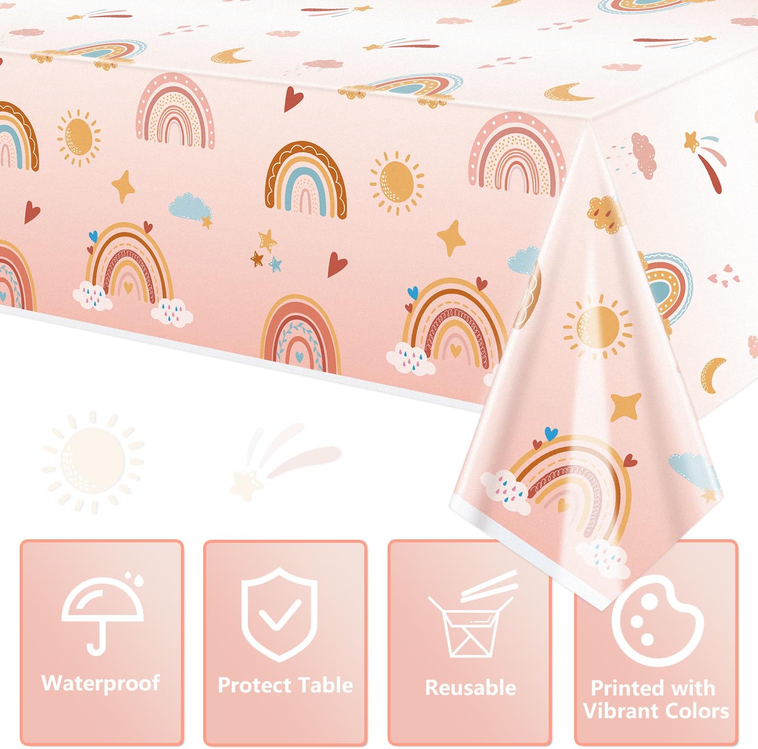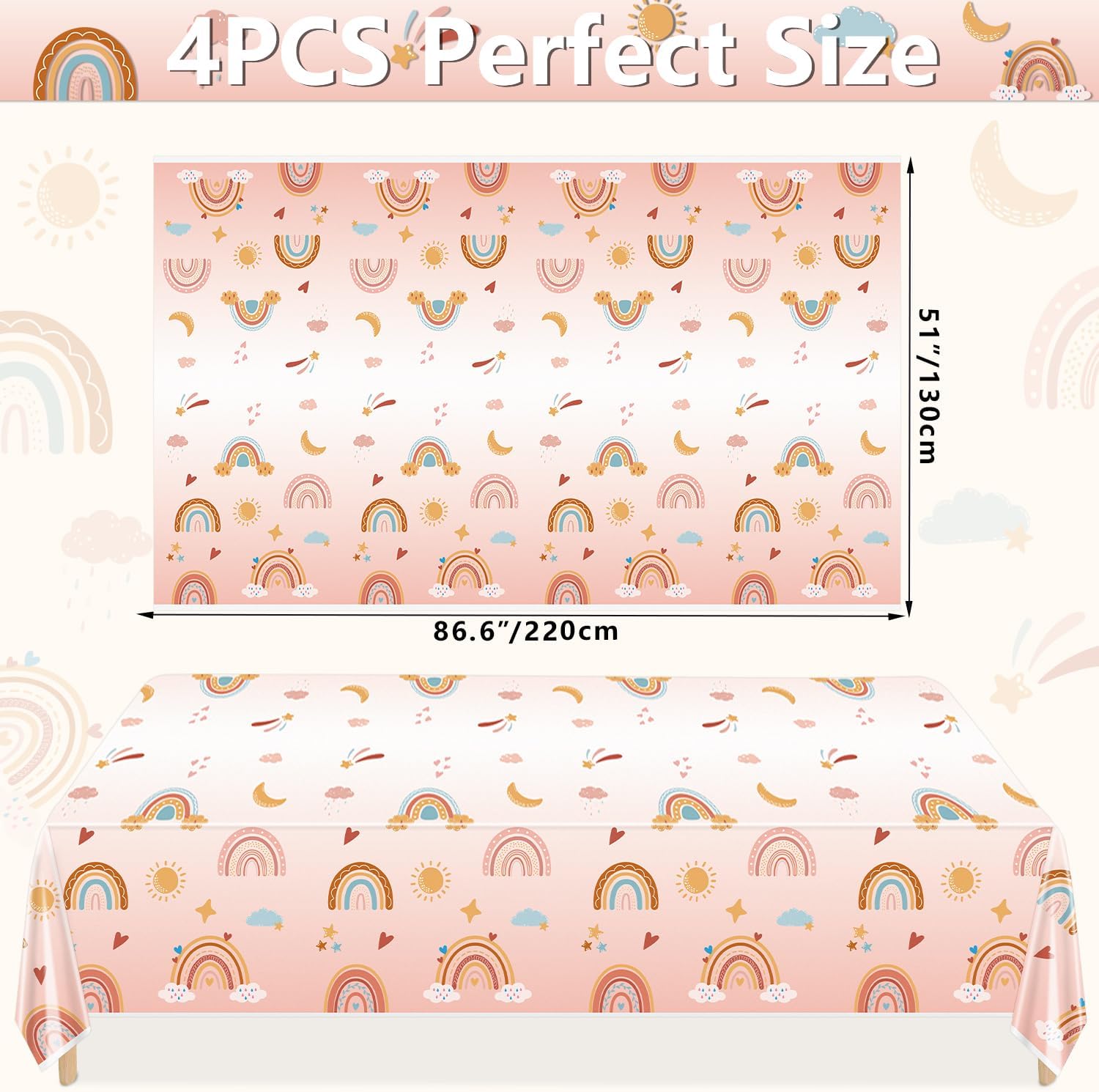 【Cosa ottieni】 Un ordine con 4 pezzi di tovaglie arcobaleno boho. Queste tovaglie a tema boho sono realizzate in materiale robusto e spesso di qualità, non facile da strappare, impermeabile e resistente alle macchie. 【Design Hippie Boho】 Queste tovaglie per feste arcobaleno sono progettate con un tema boho retrò, stampate con i classici colori boho e motivi arcobaleno. Queste decorazioni per feste boho saranno sicuramente un successo per tutti i tuoi ospiti, bambini interessati ai temi retrò hippie, aggiungendo un'atmosfera più emozionante alla tua festa! 【Grandi dimensioni per la decorazione】 Questa tovaglia arcobaleno boho, misura circa 51x87 pollici / 130x220 cm, è lunga e abbastanza grande da poter decorare la tua tavola, per soddisfare le esigenze di tutte le decorazioni per le feste e per la tavola sostitutiva. 【Facile da usare e da pulire】 Basta stendere la tovaglia retrò sul tavolo per proteggere il tavolo da macchie e graffi. Queste tovaglie retrò sono resistenti alle macchie, adatte per raccogliere eventuali fuoriuscite di cibo, dessert, latte versato, succo o soda, ecc. e facili da pulire dopo la festa, puoi semplicemente pulirle e conservarle per l'uso successivo. Perfette per tutte le occasioni: queste tovaglie boho sono adatte per uso interno ed esterno, molto adatte per feste a tema hippie boho, feste retrò anni '60 e '70, feste di compleanno per ragazze, una festa per bambini alla moda, due feste alla moda, cinque feste con atmosfera, feste per baby shower e feste di famiglia. L'uso di queste tovaglie retrò renderà le tue feste più particolari e attraenti.