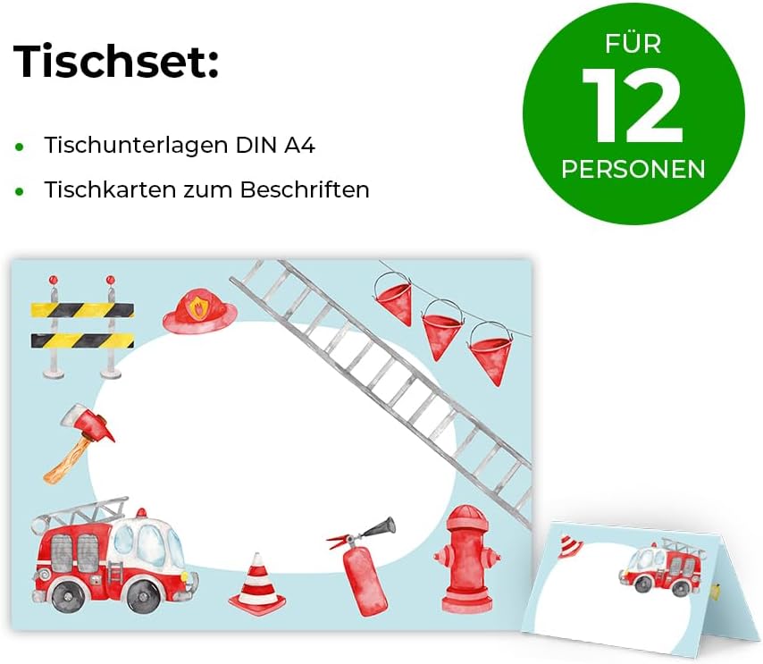 Contenuto della confezione: 12 tovagliette e 12 segnaposto. Pratico: 12 tovagliette sono in formato DIN A4 e le targhette corrispondenti offrono spazio sufficiente per scrivere i nomi degli ospiti. Dimensioni: le tovagliette hanno un formato A4 (29,7 cm x 21 cm), le targhette hanno una dimensione di 85 x 112 mm e piegate 85 x 56 mm Prodotto in Germania: le tovagliette e i segnaposto sono stati prodotti in una tipografia tedesca. ✨ Altro: da noi troverete anche molti altri motivi, ad esempio calcio, ballerina, sirena, animali.