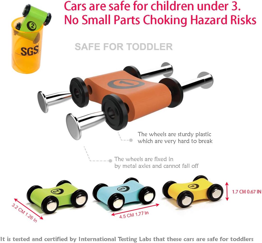 Divertenti macchinine in legno per i più piccoli con macchinine click-clack e rampa a zigzag, 4 macchinine in legno super sicure. Le piste da corsa sono realizzate in legno di faggio della migliore qualità. Niente plastica! Le auto sono sicure per i più piccoli. Le dimensioni del set di binari per auto sono 31 * 25 * 10,8 cm Posiziona l'auto sul binario sul tetto e guardala scivolare da un livello all'altro dalla rampa a zigzag dell'auto al binario inferiore. La barriera sul binario inferiore può impedire alle auto da corsa di giocare o tenere le auto al sicuro quando non giocano. Per liberarli è sufficiente sollevare la barriera. Fantastici regali giocattolo per bambini piccoli, uno dei giocattoli preferiti per la rampa per auto per bambini di 1 e 2 anni. Auto da pista per bambini già assemblata. Porta un divertimento senza fine ai bambini. Perché acquistare un gioco di corse automobilistiche o di garage più costoso, complicato e difficile da assemblare quando questo cursore per piste da corsa serve entrambi i tipi di giocattoli per auto con più divertimento? Parcheggia le macchinine sulla pista inferiore con il cancello chiuso, oppure gareggia sulla pista o gioca semplicemente da solo con le macchinine di legno. Questa rampa in legno è adatta a bambini dai 18 mesi in su. È sempre consigliabile che un adulto supervisioni e apprezzi l'interazione dei bambini con questo giocattolo da corsa per bambini. I migliori giocattoli in legno. uno dei migliori giocattoli con scivolo per auto per ragazzi e ragazze di 1, 2 e 3 anni. Sicuro e conforme agli standard di sicurezza: è realizzato in legno di alta qualità con vernici atossiche. È conforme agli standard di sicurezza dei giocattoli EC EN71, ASTM F963 e CPSIA, testato e certificato da laboratori internazionali accreditati.