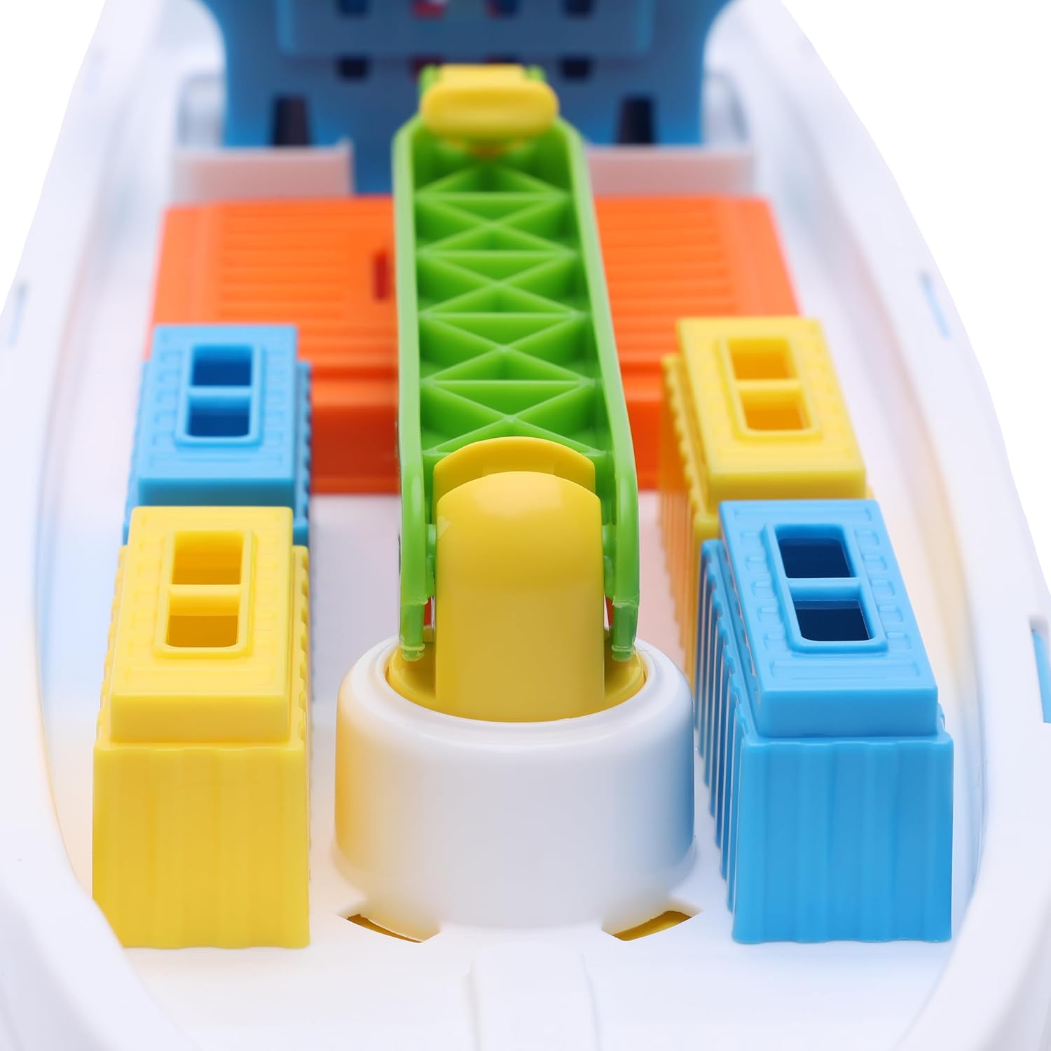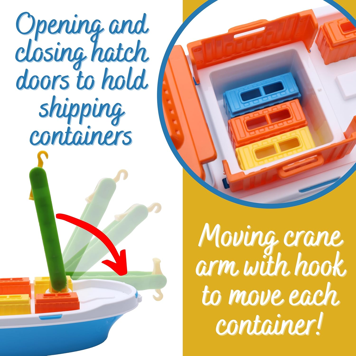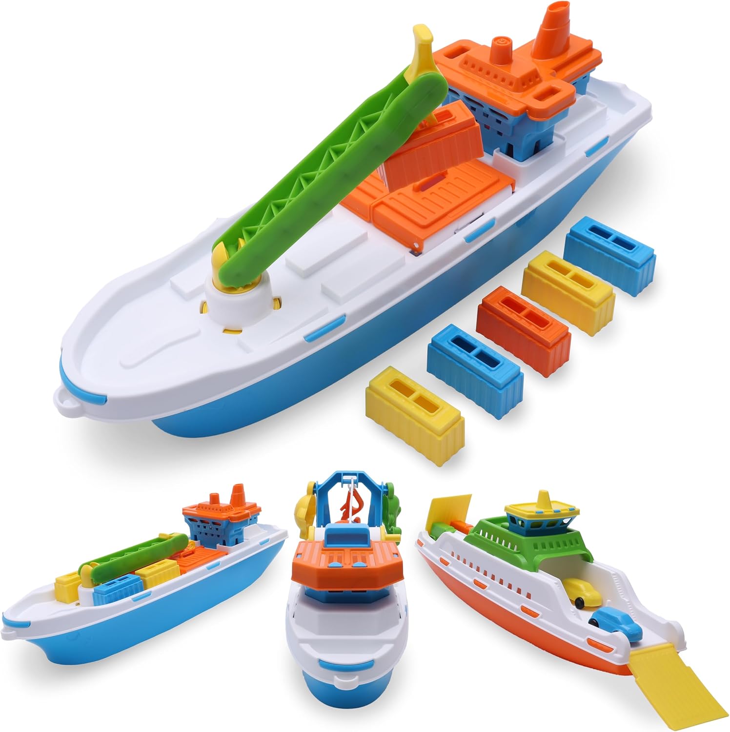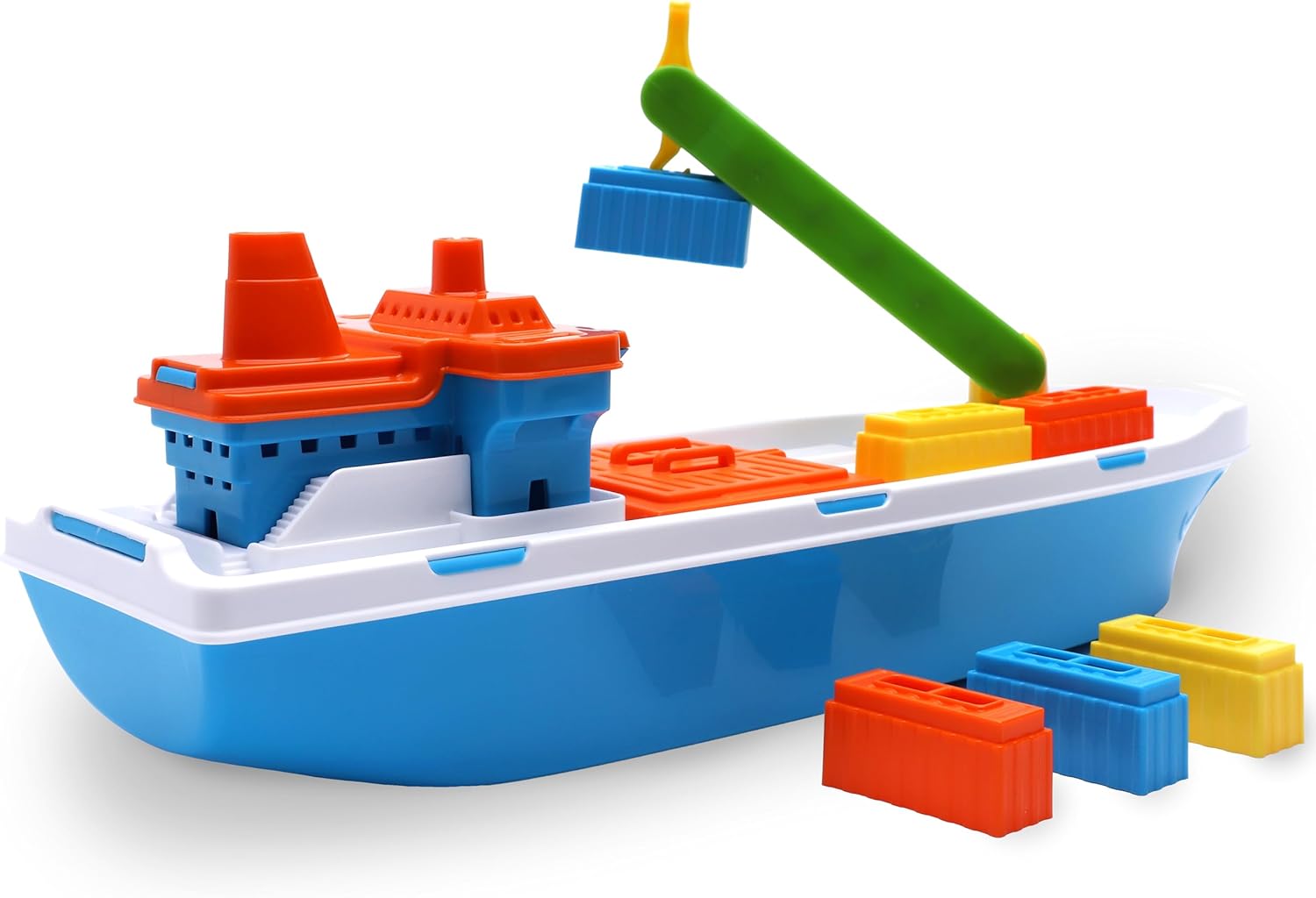 Nuotare diventa ancora più emozionante con questa colorata nave mercantile: riuscirai a caricare tutti i container? La barca è dotata di 6 contenitori rimovibili, porte mobili e una gru dai colori vivaci per favorire lo sviluppo sensoriale e la coordinazione occhio-mano. Il perfetto giocattolo acquatico galleggiante. Oppure usa le ruote montate su superfici dure per un gioco ancora più fantasioso. La nave da carico misura 41 x 18 x 11,5 cm ed è realizzata in plastica leggera e resistente, ideale per giocare nella vasca da bagno o nella piscina per bambini. Adatto a bambini dai 3 anni in su.