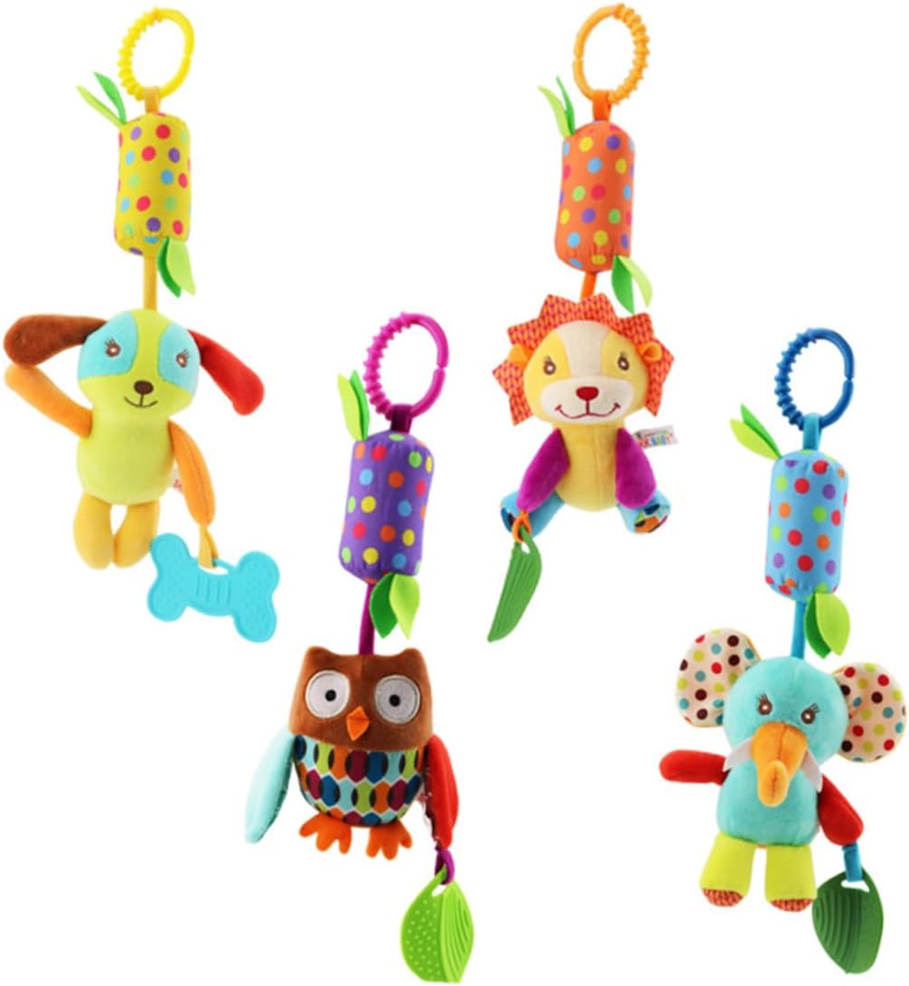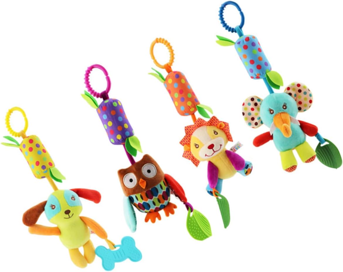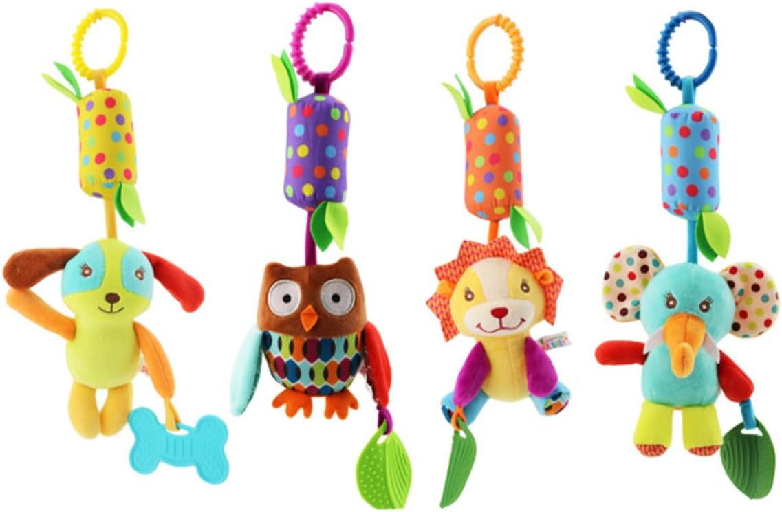 Giocattoli per bambini: facili indossare o smontare seggiolini , passeggini, carrozzine e letti. Giocattolo sonaglio per bambini: può emettere un suono morbido, accogliente e rilassante agitando delicatamente, aiutare i genitori a giocare con i bambini e aiutare a promuovere i uditivi bambini, nonché la capacità muscolare e di presa. Campane rotanti: giocattoli sostitutivi perfetti per tappetini gioco, set pavimento. un perfetto giocattolo del primo anno per il bambino, regalalo come regalo speciale per baby shower, compleanno, festa bambini Giocattoli animali: 4 diversi modelli di animali che includono elefante, gufo, cane e leone. colori brillanti, design e motivi ad alto contrasto aiutano a stimolare le capacità visive del bambino
