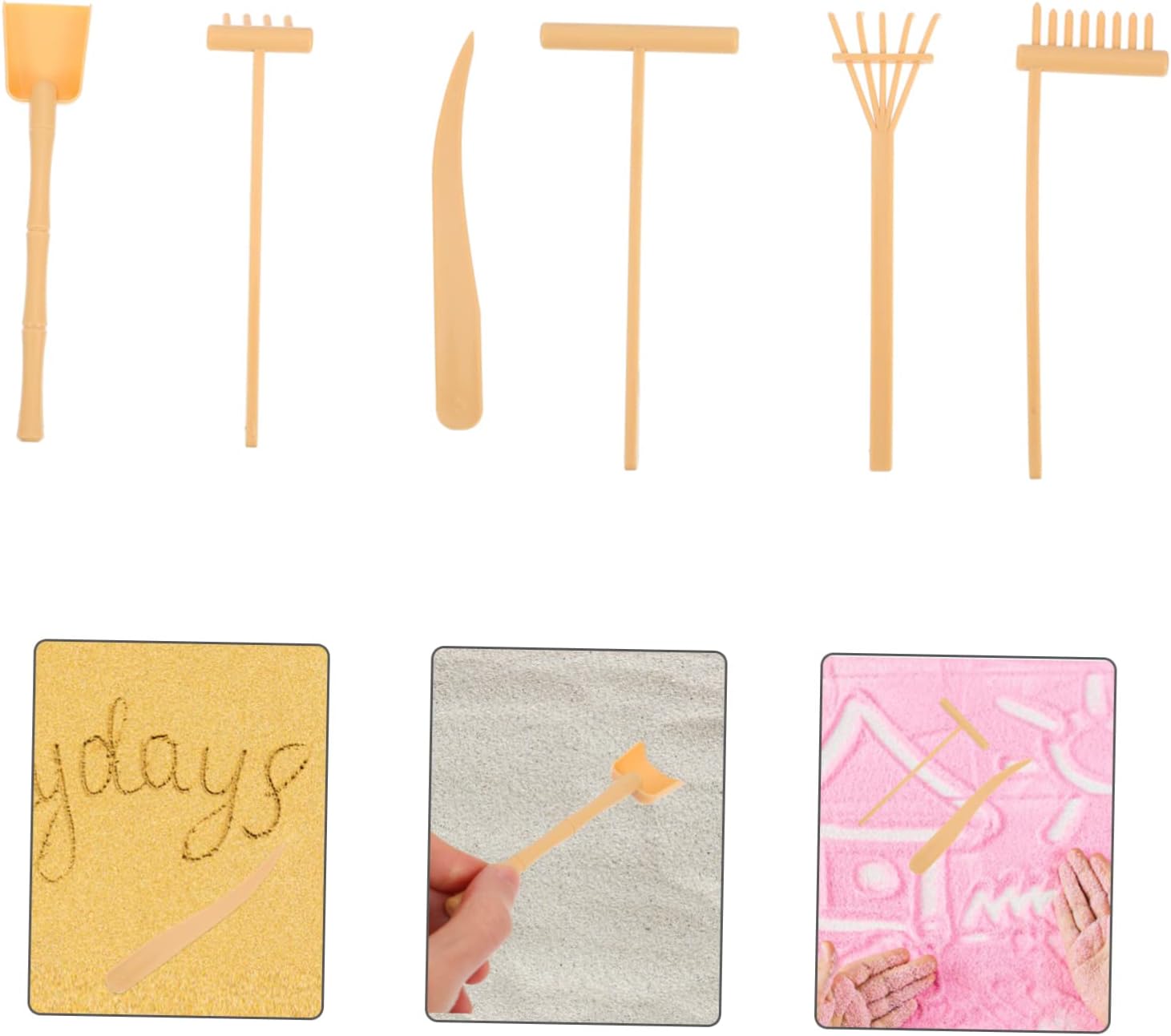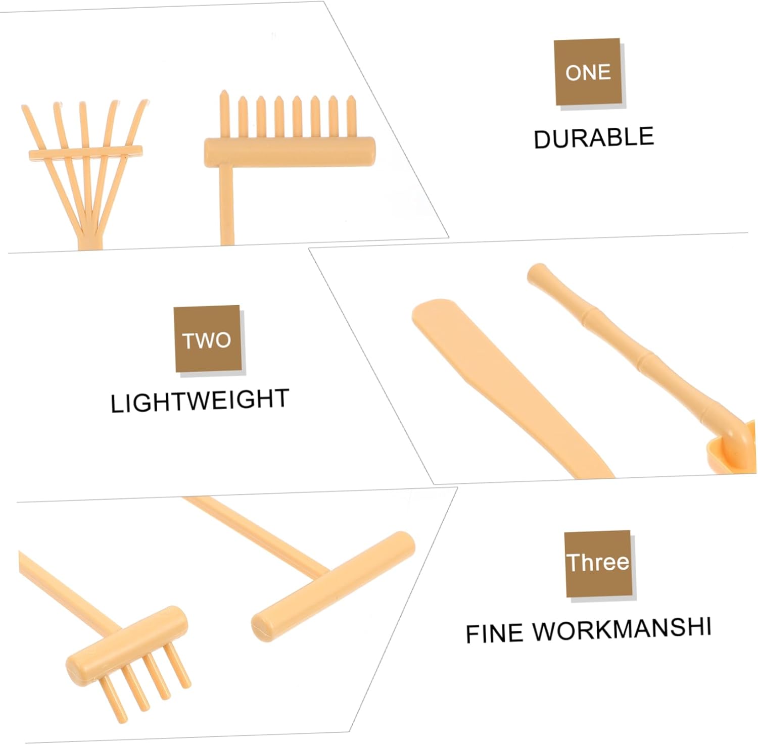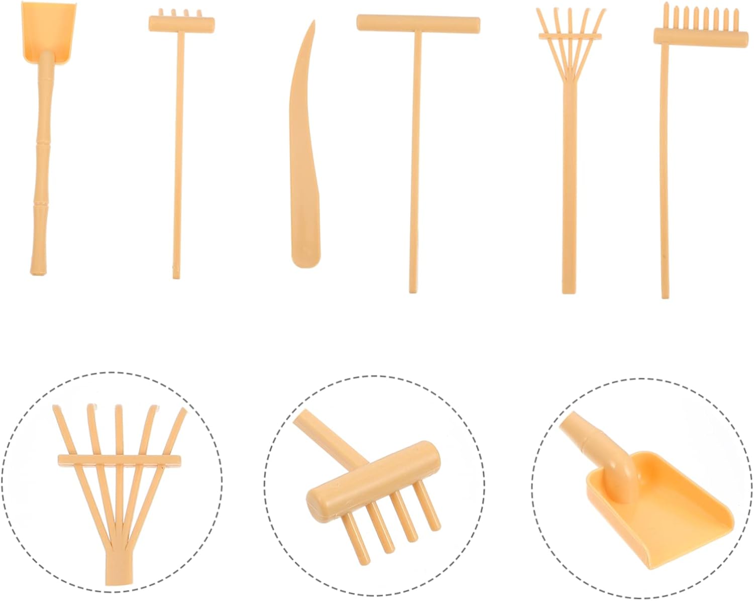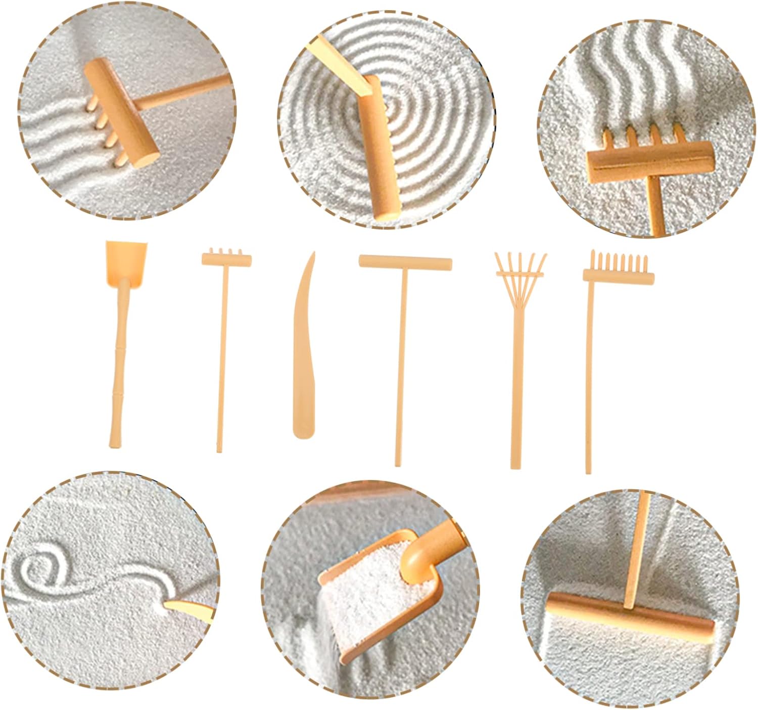 Piccoli rastrelli artigianali: sono leggeri, facili e comodi da trasportare e riporre quando non in uso senza alcuno sforzo, rastrello per sabbia Giocattolo rastrello per sabbia: questi mini rastrelli sono decorativi ed eleganti, con un bellissimo design, rastrello per terapia con vassoio per sabbia Mini rastrello per sabbia: puoi posizionarli sulla scrivania per renderla più attraente e affascinante, delicata e divertente, rastrelli per vassoio per sabbia Mini rastrello da giardino per sabbia: il set di mini rastrelli con una varietà di stili, soddisfa facilmente le tue diverse esigenze, mini strumenti per sabbiera Attrezzi per rastrelli: riceverai un set di mini rastrelli e utensili a spinta, che potrai utilizzare o condividere con altri, utensili per vaschette di sabbia