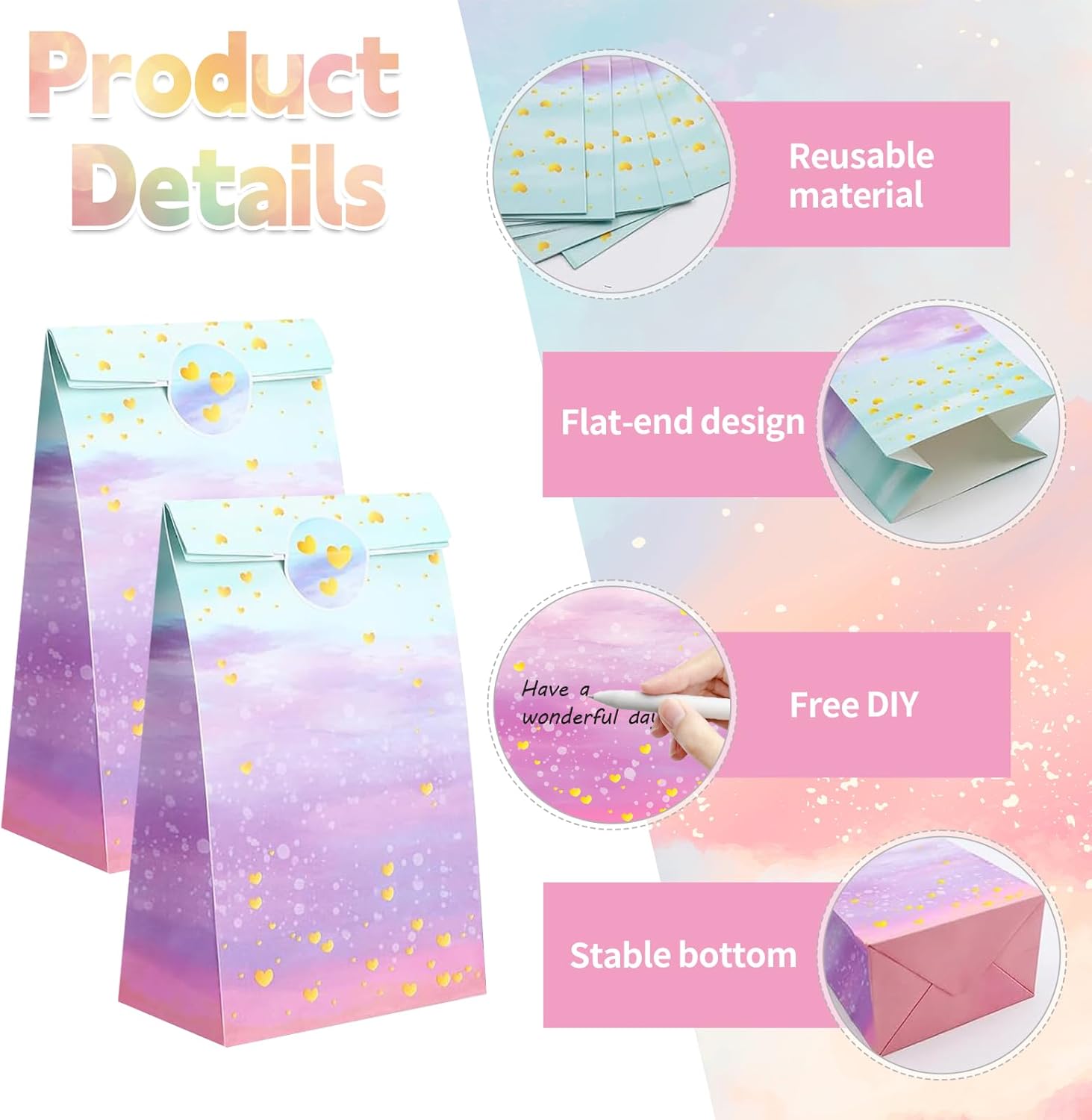 【Set di sacchetti regalo】 La confezione contiene 16 sacchetti di compleanno in carta colorata di 22×12×8 cm e 18 adesivi coordinati con motivi coordinati. I sacchetti regalo sono disponibili in 2 diversi design e sono ideali per incartare i vostri regali. 【Carta kraft di alta qualità】 Le nostre borse da festa per bambini sono realizzate in carta kraft di alta qualità, inodore, facile da piegare e facile da aprire. È molto robusto, ha un'ottima resistenza all'abrasione e può essere utilizzato più volte. 【Bordo piatto della borsa】 Il design con bordo piatto facilita l'apertura e la chiusura delle borse e consente di riempire e rimuovere comodamente il contenuto. Il fondo rinforzato garantisce inoltre una posizione sicura: la borsa non si ribalta né sdraiata né in piedi. Multifunzionale: queste colorate borse per feste di compleanno non sono adatte solo per confezionare piccoli giocattoli e regali, ma anche per conservare alimenti come frutta, pane, dolci o torte. 【Versatile】 Il design unico e colorato di queste borse per feste di compleanno per bambini le rende ideali per compleanni, Halloween, Ringraziamento, Natale, Festa della mamma, Pasqua, matrimoni, picnic e feste.