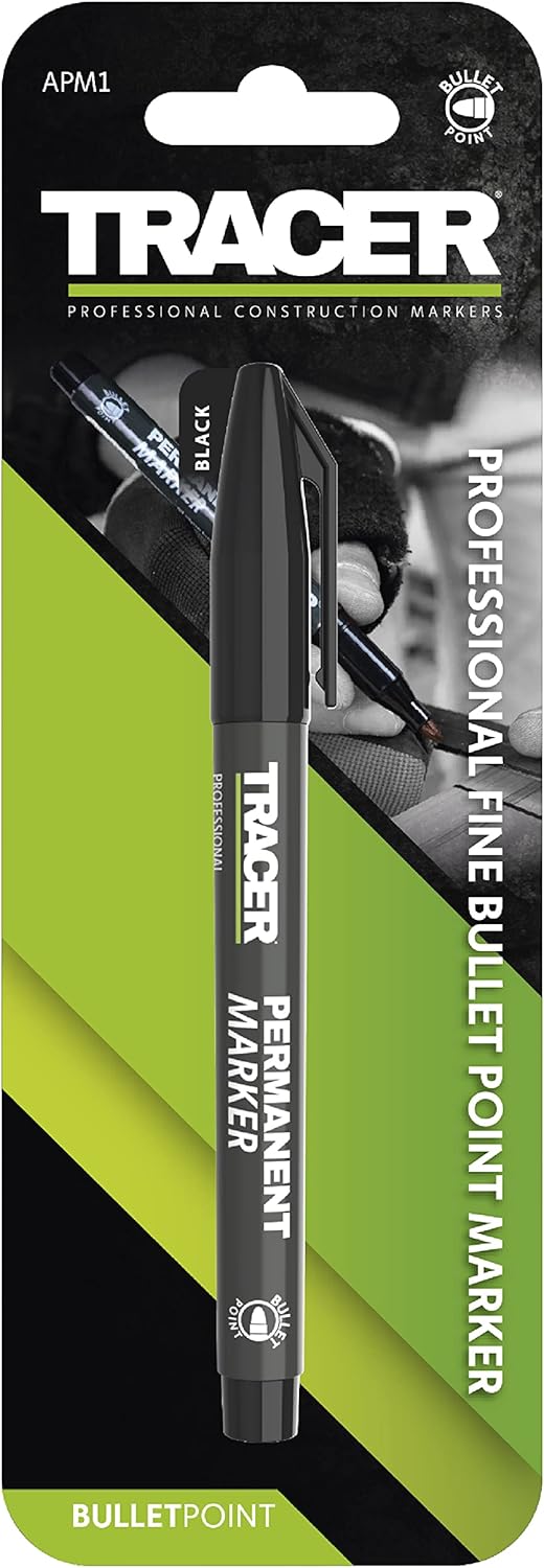 Qualità commerciale: un indicatore a punta proiettile da 1-2 mm per tutti gli usi specificamente progettato per essere il pennarello ideale per cantieri edili e spazi di lavoro occupati. Marcatura versatile: tutti i pennarelli permanenti TRACER sono ideali quando è necessario contrassegnare su piastrelle, plastica, legno e superfici metalliche. Asciugatura rapida: i pennarelli permanenti TRACER utilizzano inchiostro ad asciugatura rapida per evitare errori derivanti da macchie e segni ruvidi e poco chiari. Durevole e affidabile: comprendendo l'usura inevitabile da un uso eccessivo in loco, il pennarello è stato costruito con una punta acrilica resistente (senza xilene e toluene). Segnatura nera trasparente: disegna linee nere pulite e audaci, perfette per pianificare e contrassegnare sul posto di lavoro. Disponibile anche in rosso e blu.