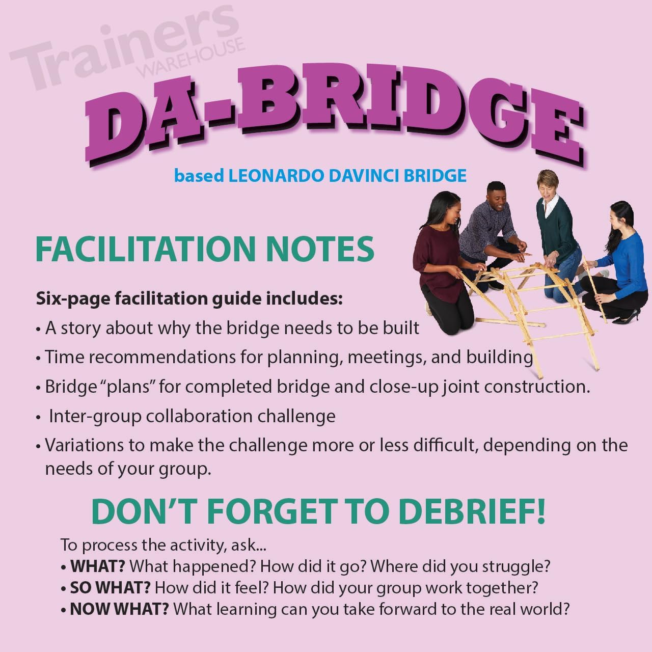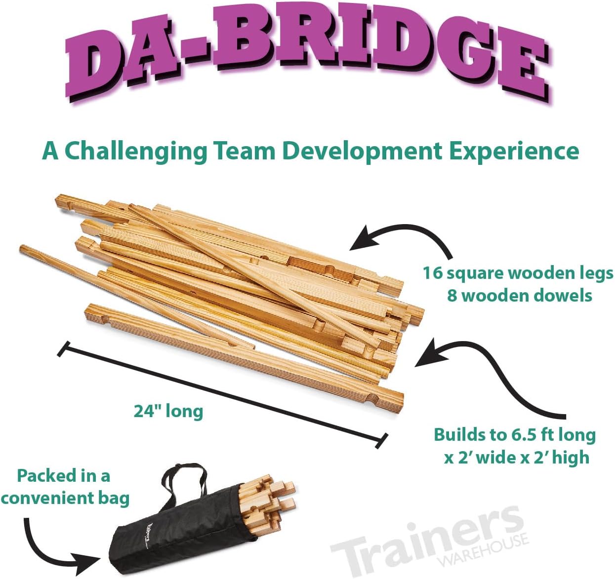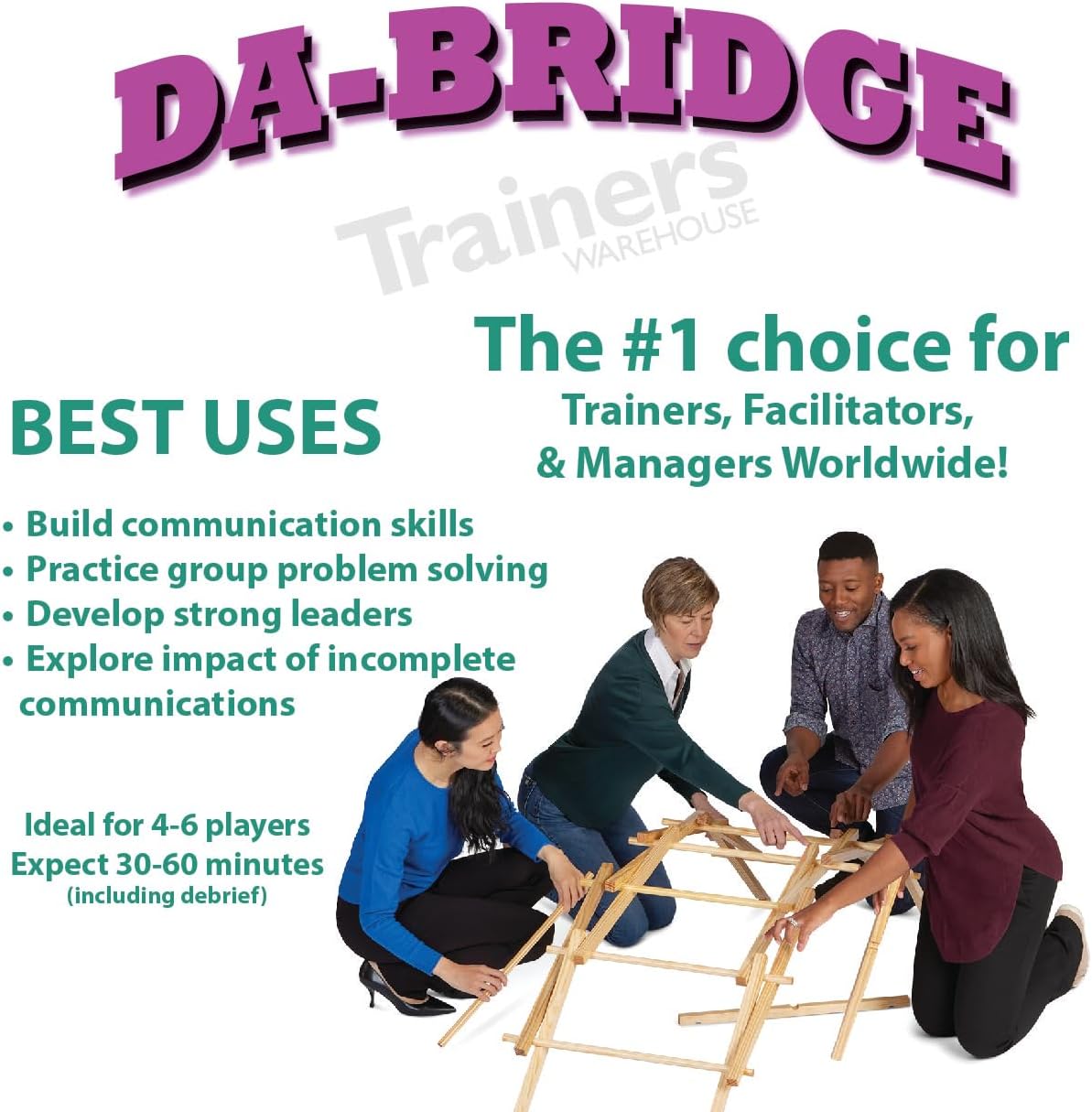DaBridge dà vita all'idea di ponte semplice ma ingegnosa di Leonardo DaVinci. È realizzato con bastoncini di legno intagliati e tasselli belli e robusti. L'ingegnosità del ponte è che non ha bisogno di chiodi o elementi di fissaggio per tenerlo insieme. Se costruito secondo il design di Leonardo, diventa più forte più peso viene aggiunto. NOTA: Una volta completato, DaBridge misura 6,5 'di lunghezza per 2' di larghezza e 2' di altezza, quindi assicurati che il tuo team abbia ampio spazio per costruire! Il kit include gambe e tasselli per creare una struttura lunga 2 m - abbastanza lunga per diversi adulti per collaborare al processo di costruzione! Include 4 varianti di gioco aggiuntive Solide note di facilitazione fornite. Domande di debriefing e revisione incluse per rendere il classico DaVinci's Bridge un'esperienza di team building di successo per tutti i tipi di team. Presentato da un magazzino per allenatori: la scelta del professionista per la formazione dei dipendenti e i prodotti di motivazione, con i nostri cicalini di game show, palle di conversazione, rompighiaccio, giochi di team-building, irrequieti, strumenti di debriefing, segnaletica e premi di apprezzamento. Per oltre 30 anni, abbiamo migliorato la partecipazione e il coinvolgimento con strumenti innovativi che aiutano formatori ed educatori in molti settori. Che si tratti di lavorare da remoto o di tornare in ufficio, abbiamo il prodotto perfetto per te. La confezione include: 16 gambe quadrate in legno – 61 cm di lunghezza x 2,5 cm quadrato; 8 tasselli in legno – 61 cm di lunghezza x 1,9 cm di diametro; comoda borsa per il trasporto Realizzato a mano negli Stati Uniti