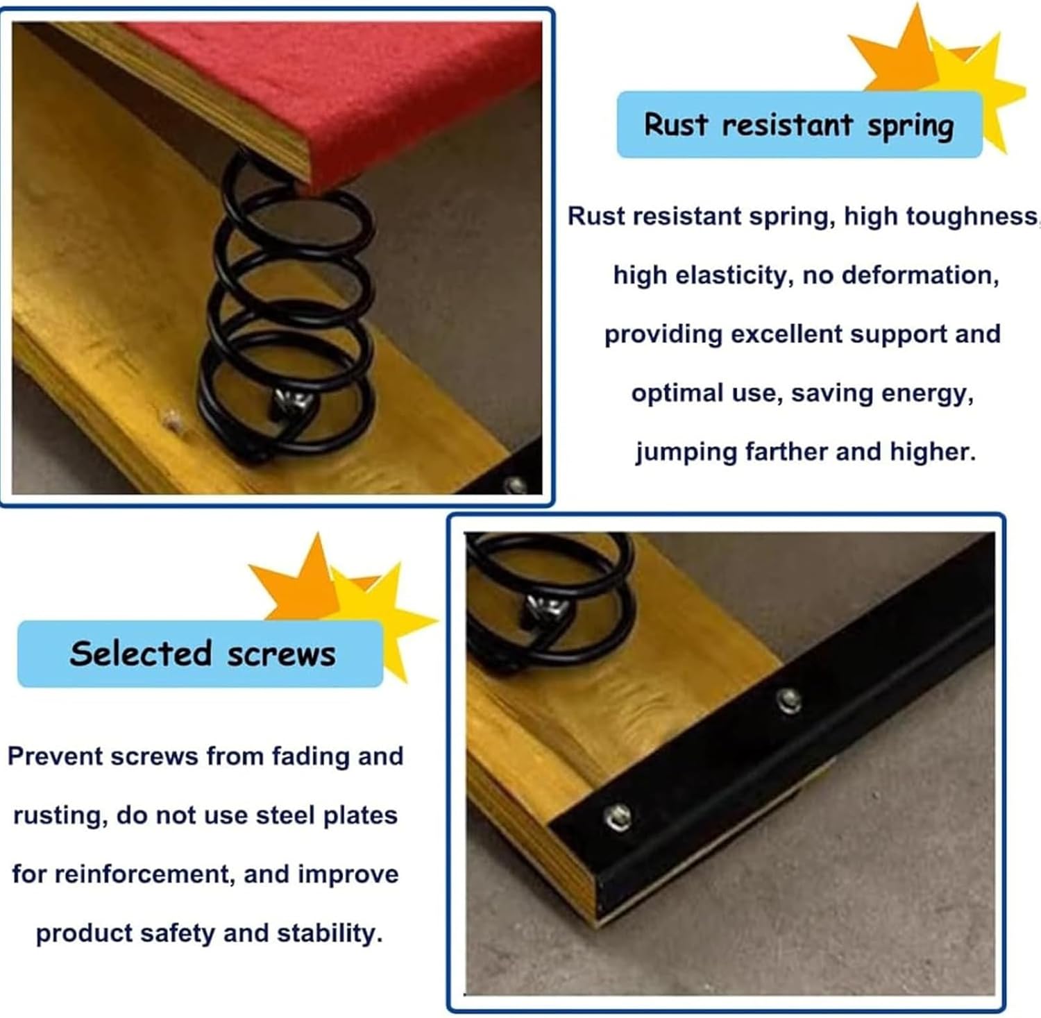 【Trampolino da ginnastica】Il trampolino da ginnastica è un ausilio per il salto negli eventi di volteggio, utilizzato per migliorare le abilità di salto, esercitarsi nello sbarco e nell'atterraggio, nell'arte sportiva e nello stretching. Il trampolino aiuta gli atleti ad aumentare l'altezza del salto e supporta i movimenti tecnici complessi negli sport aerei. 【Attrezzatura da ginnastica robusta e durevole】I nostri trampolini sono realizzati con assi di legno duro, feltro antiscivolo di alta qualità sulla superficie, molla ispessita in acciaio al manganese all'interno, forte capacità portante, nessuna deformazione, nessuna piastra in acciaio antiruggine fissata. 【Feltro antiscivolo】La superficie del trampolino è rivestita in feltro antiscivolo e resistente all'usura, che consente ai piedi di mantenere una buona presa durante il salto, ed è sicuro e anticaduta, proteggendoci il più possibile dagli infortuni. Non pungerà i piedi anche se sei a piedi nudi. 【Quattro molle ad alta elasticità】: Progettato con quattro robuste molle caratterizzate da eccezionale elasticità e resilienza, questo trampolino garantisce un'esperienza sicura e duratura. Queste molle ad alta resistenza forniscono un supporto superiore, consentendo un utilizzo ottimale per varie routine di ginnastica. 【Servizio】I nostri prodotti vengono rigorosamente selezionati prima della spedizione, ci impegniamo per una maggiore soddisfazione. In caso di domande sul nostro prodotto, non esitate a contattare il nostro team di assistenza clienti