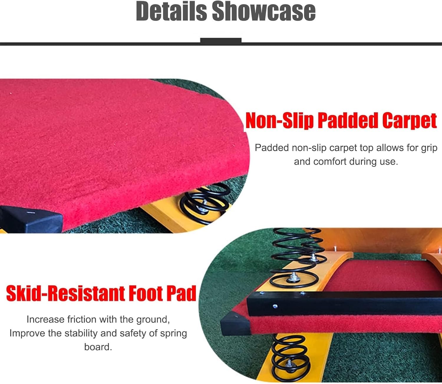 Robusto e durevole: la piastra a molla è realizzata in legno massello e la superficie è realizzata in feltro antiscivolo di alta qualità, antiscivolo, assorbente del sudore, sicuro, stabile, indeformabile e non danneggia i piedi. Molla ad alta tenacità: questo trampolino sportivo è realizzato con una molla ad alta tenacità, che ha una buona elasticità e non si arrugginisce o si deforma facilmente, offrendo una migliore sensazione di rimbalzo. La tavola di legno e la molla sono fissate con una piastra in acciaio ispessito e viti. Il cuscinetto in plastica con scanalature antiscivolo nella parte inferiore del trampolino è sicuro e non si muove. Tappetino antiscivolo in gomma: un tappetino antiscivolo scanalato è posizionato sul fondo di questo trampolino da ginnastica per aumentare la resistenza al contatto e prevenire lo scivolamento. Può essere utilizzato con sicurezza. I quattro angoli della pedana sono inoltre protetti da gomma per evitare collisioni. USI MULTIPLI: Questo eccellente trampolino può essere utilizzato non solo per arti sportive, bilanciere, esercizi di capriole, stretching, allenamento a ostacoli, allenamento di atletica leggera, ma può anche migliorare la forma del corpo, rafforzare i muscoli e migliorare la coordinazione del corpo. Ampia gamma di applicazioni: adatto per trampolini da ginnastica per impieghi gravosi in casa, palestre, campi di allenamento professionali, palestre, scuole, ecc. Che tu sia un atleta professionista, un appassionato di fitness o un allenatore di allenamento fisico per bambini, salto in alto, salto in lungo, puoi scegliere.