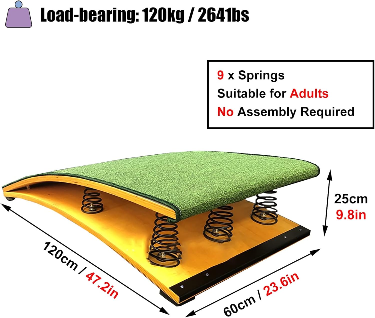 Trampolino da competizione: questo trampolino da competizione è adatto sia ai giovani che agli adulti! Le specifiche e le proprietà sono progettate secondo gli standard delle competizioni, in modo da poter essere utilizzato in palestra o a casa. Carico massimo 110 kg / 250 libbre. 9 MOLLE AD ALTA ELASTICITÀ - Le molle spesse ad alta tenacità hanno maggiore elasticità e resilienza, sono sicure e durevoli e consentono un supporto superiore e un utilizzo ottimale. Ampiamente utilizzato - Resistente, perfetto per la casa, la palestra, la sala giochi, il percorso a ostacoli per l'allenamento, la palestra di casa, il seminterrato, ecc. ATTREZZATURA DA PALESTRA ROBUSTA E DUREVOLE - Legno duro spesso, feltro antiscivolo di alta qualità sulla superficie, molla in acciaio al manganese ispessita all'interno, forte capacità portante, nessuna deformazione, piastra in acciaio antiruggine fissata. SODDISFAZIONE GARANTITA - Non esitate a contattare il servizio clienti professionale prima e dopo l'acquisto in caso di problemi o dubbi. 60 cm/23,6" di larghezza; 120 cm/47" di profondità; 20 cm/7,9" di altezza dall'estremità più alta.