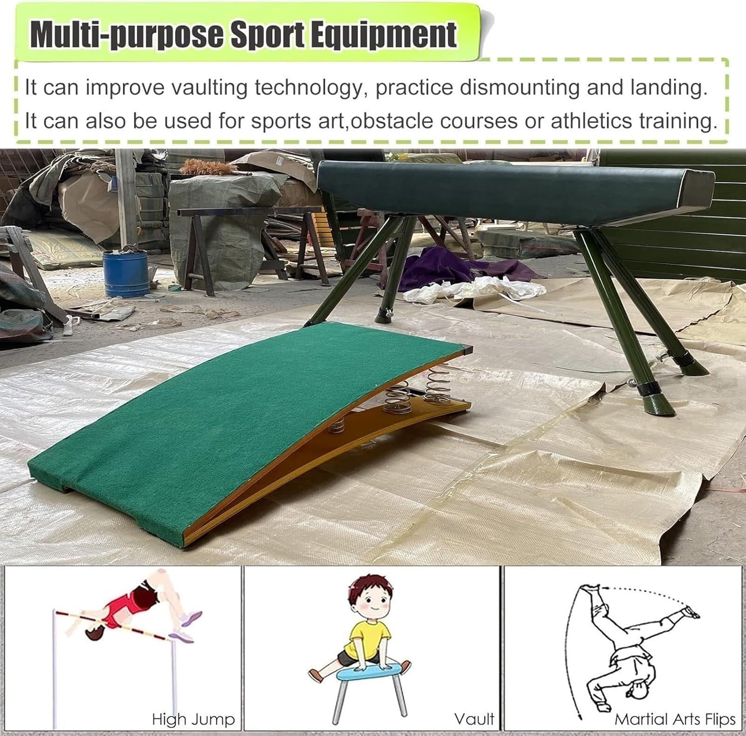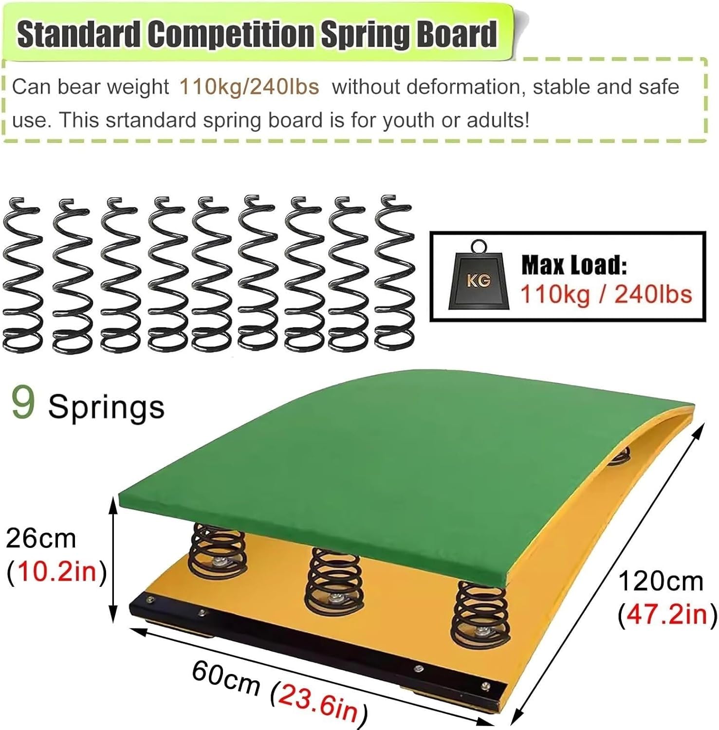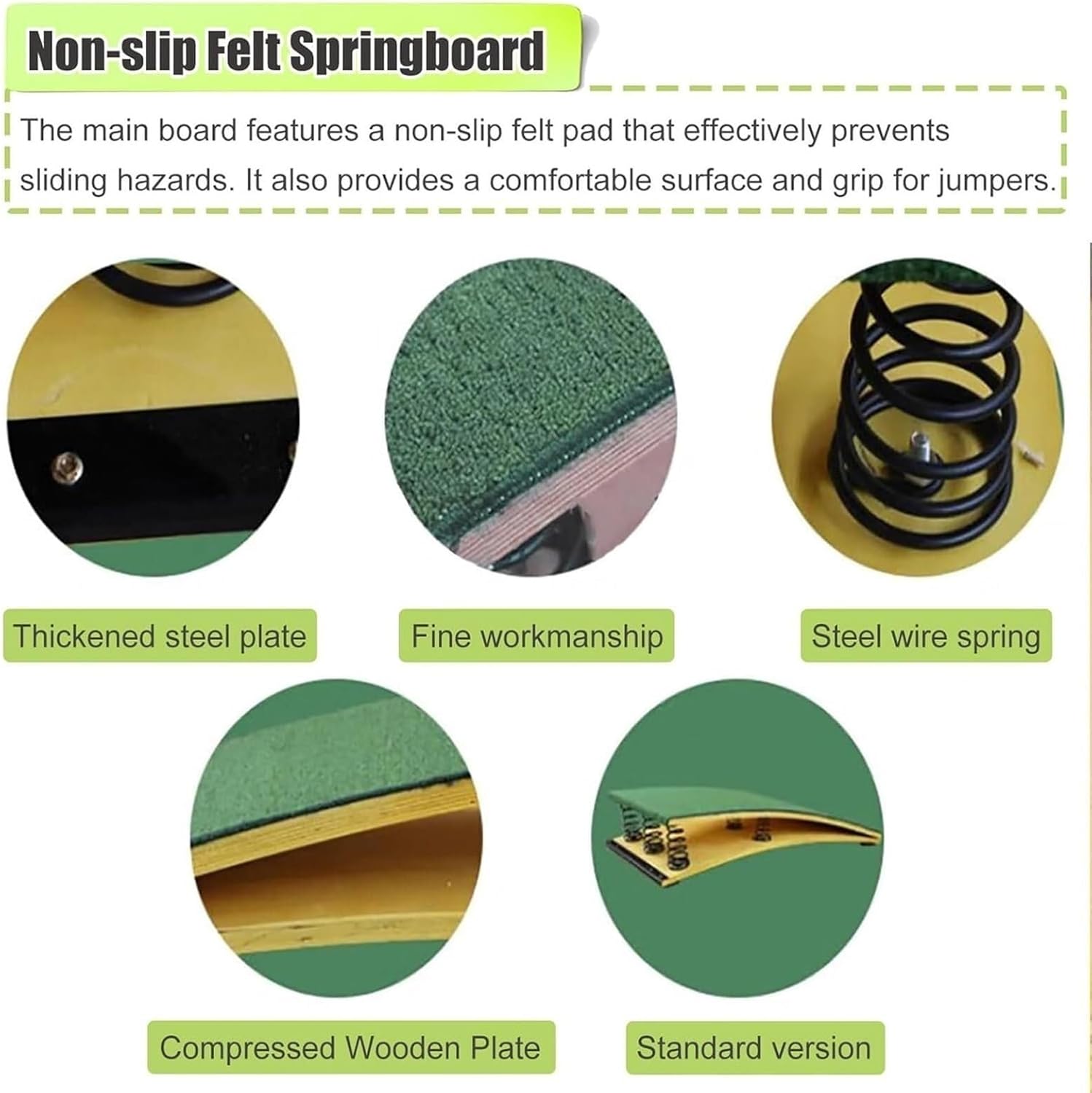 Costruzione in legno massello: realizzata in legno massello con elevata capacità portante, che garantisce stabilità e utilizzo duraturo per esercizi di volteggio e salto. Molle ad alta tenacità: dotate di molle in acciaio ispessito, offrono elasticità e rimbalzo superiori, consentendo agli atleti di saltare più in alto e di allenarsi con minore affaticamento. Superficie antiscivolo: il feltro antiscivolo sulla parte superiore garantisce una presa comoda e sicura, prevenendo infortuni ai piedi e aumentando la sicurezza durante gli allenamenti. Design versatile: adatto sia ai bambini che agli adulti, questo trampolino è ideale per volteggi, capriole, salti mortali all'indietro, salti in alto e un'ampia gamma di attività di allenamento atletico. Diverse opzioni di dimensioni: disponibili in diverse misure per adattarsi a bambini, adolescenti e adulti, con diverse capacità delle molle per supportare diverse fasce di peso (fino a 110 kg/242,5 libbre).