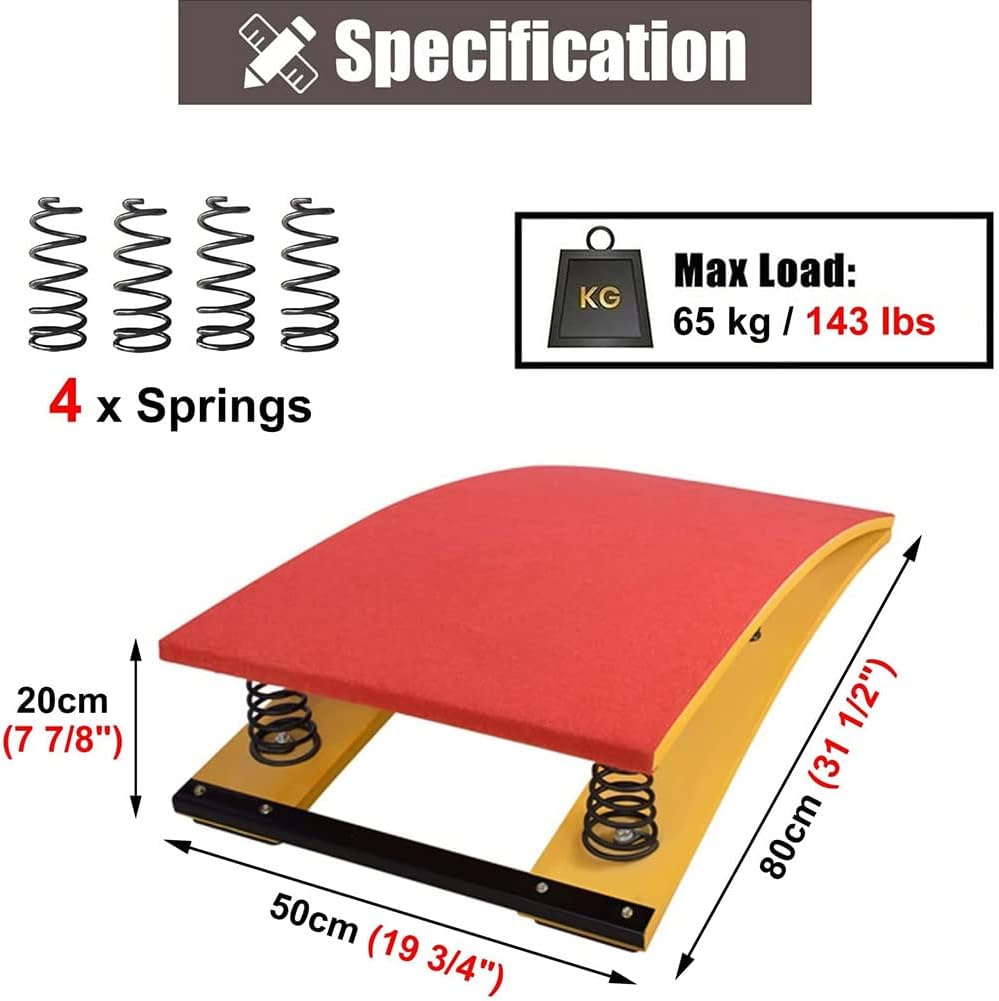 【4 molle in acciaio altamente elastiche】Le molle resistenti e ispessite offrono un'elasticità e una resilienza eccezionali. Garantiscono sicurezza e stabilità senza distorsioni, consentendo ai ginnasti di risparmiare energia e raggiungere salti più alti. 【Feltro antiscivolo resistente all'usura】Dotato di un cuscinetto in feltro antiscivolo, il pannello superiore migliora la presa del piede per un salto sicuro, eliminando il rischio di scivolamento. 【Trampolino sportivo; Riabilitazione corporea】Ideale per migliorare le tecniche di volteggio a cavallo, esercitarsi nelle discese e negli atterraggi, nonché per migliorare le prestazioni sportive e la flessibilità. È anche uno strumento affidabile per lo stretching pre e post allenamento e per il recupero del corpo. 【Angoli anticollisione】Dotati di angoli protettivi anticollisione, prevengono lesioni causate da incidenti accidentali durante l'uso. Garantiscono maggiore tranquillità e sicurezza, in particolare per i bambini che praticano attività sportive. 【Ampiamente utilizzato】Adatto sia per attività indoor che outdoor come ginnastica, arti marziali, volteggio, allenamento atletico e ginnastica acrobatica. Abbastanza versatile da poter essere utilizzato in palestre domestiche, sale giochi, scantinati, scuole, centri di ginnastica e club sportivi.