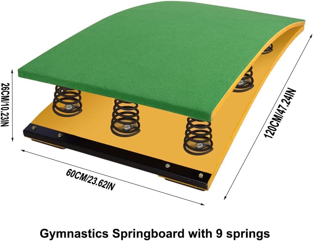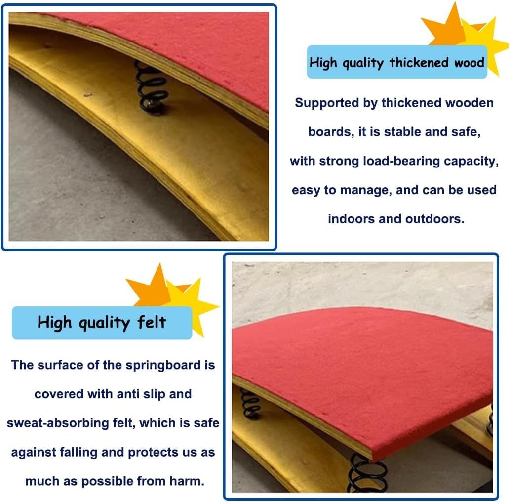 Tavole da salto per ginnastica: le pedane da salto per ginnastica sono ausili utilizzati nelle gare di volteggio per migliorare le tecniche di salto, esercitarsi nelle discese e negli atterraggi, nelle arti sportive e nello stretching. Il trampolino aiuta gli atleti ad aumentare l'altezza del salto e a eseguire movimenti tecnici complessi negli sport aerei. MOLLE AD ALTA FLESSIBILITÀ: Questo trampolino sportivo è realizzato con molle ad alta tenacità, buona elasticità, non si arrugginisce e non si deforma facilmente, è stabile e sicuro, risolve le tue preoccupazioni, ti offre una migliore sensazione di rimbalzo, risparmia forza fisica ed energia, salta più in alto. Feltro antiscivolo: la superficie del trampolino è rivestita in feltro antiscivolo e resistente all'usura, che consente ai piedi di mantenere una buona presa durante il salto, in modo sicuro e a prova di caduta, massimizzando la protezione dagli infortuni. Anche a piedi nudi, non pungerà i piedi. Tavola spessa: il trampolino è realizzato in tavola spessa di alta qualità, impermeabile, resistente all'umidità, non facile da rompere, con capacità portanti elevate, stabilità e durata. La superficie del trampolino è rivestita in feltro antiscivolo e resistente all'usura, che consente ai piedi di mantenere una buona presa e impedisce loro di cadere in sicurezza durante il salto. AMPIA APPLICAZIONE: trampolino da ginnastica resistente per casa, palestra, campo di allenamento professionale, palestra, scuola e altri luoghi, che tu sia un atleta professionista, un appassionato di fitness o un allenatore di allenamento fisico per bambini, salto in alto, salto in lungo.