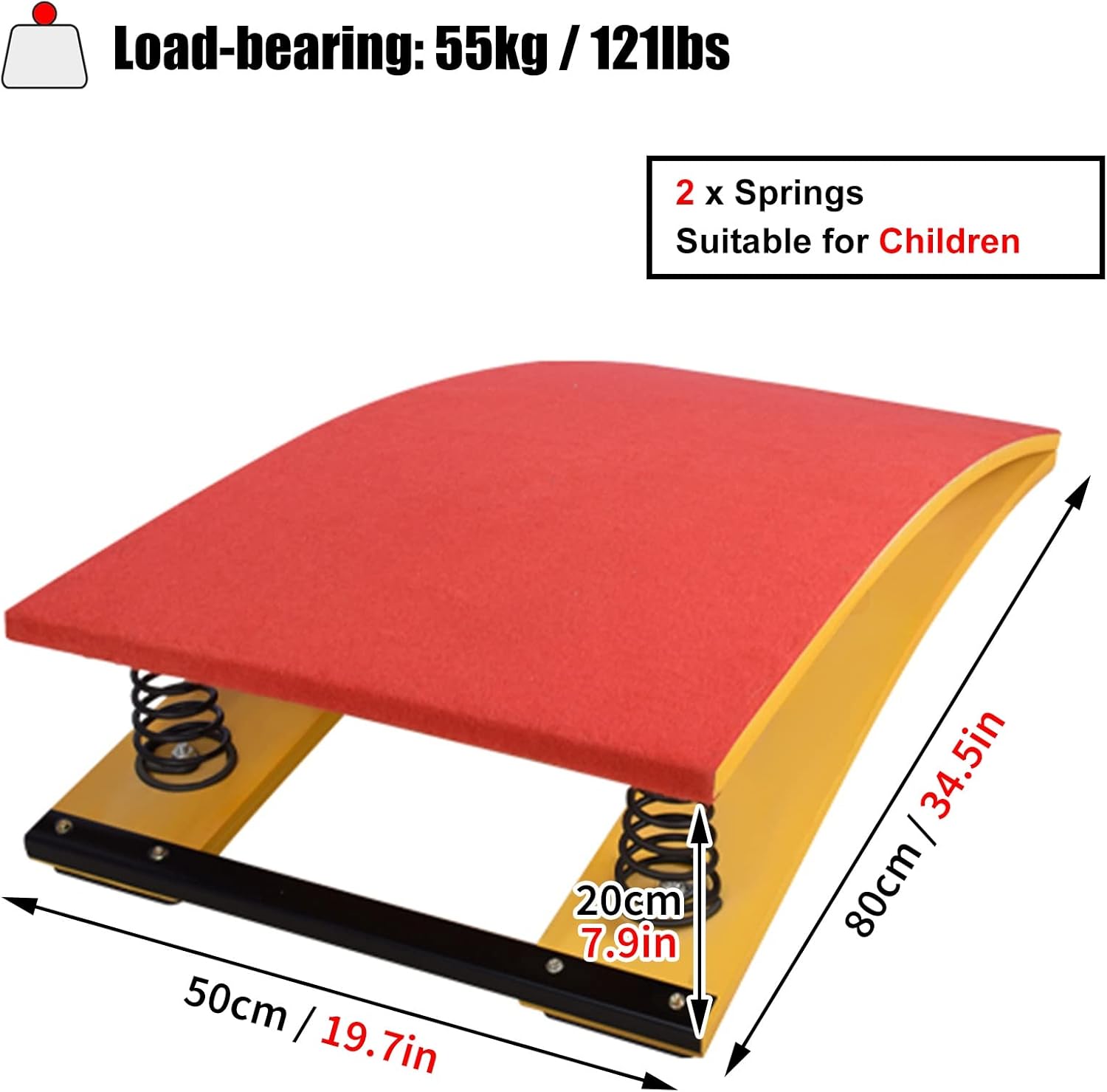 【Comodo e ad alta capacità di rimbalzo】 Realizzato in legno duro liscio e senza sbavature, rivestito con un tappeto antiscivolo imbottito e una molla interna in acciaio al manganese ispessita. 【Supporto per chi indossa scarpe】 Il tappeto superiore comodo e antiscivolo consente ai piedi di aderire bene durante il salto e fornisce anche una superficie confortevole. Non ti farà formicolare i piedi, anche se sei a piedi nudi. 【2 molle in acciaio ad alta resistenza】La pedana elastica Junior Size è dotata di 2 molle. Elevata tenacità, elasticità e resilienza delle molle ispessite, sicure e durevoli, reattive e riducono notevolmente l'affaticamento degli atleti. 【Trampolino per bambini】Questo trampolino standard da 80 x 50 x 20 cm / 34,5 x 19,7 x 7,9 pollici (lunghezza x larghezza x altezza) è per i giovani. Può sopportare un peso di 55 kg / 121 libbre senza. Rafforzerà la forma fisica del tuo bambino e gli consentirà di sviluppare un buon temperamento e fiducia in se stesso. 【Trampolino sportivo per la riabilitazione del corpo】Non è solo un attrezzo ginnico utilizzato per migliorare la tecnica del volteggio a cavallo, la pratica dello smontaggio e dell'atterraggio, l'arte sportiva e lo stretching. È anche uno strumento medico, per lo stretching prima e dopo l'allenamento, utile per il recupero del corpo da infortuni e dolori a piedi e caviglie.
