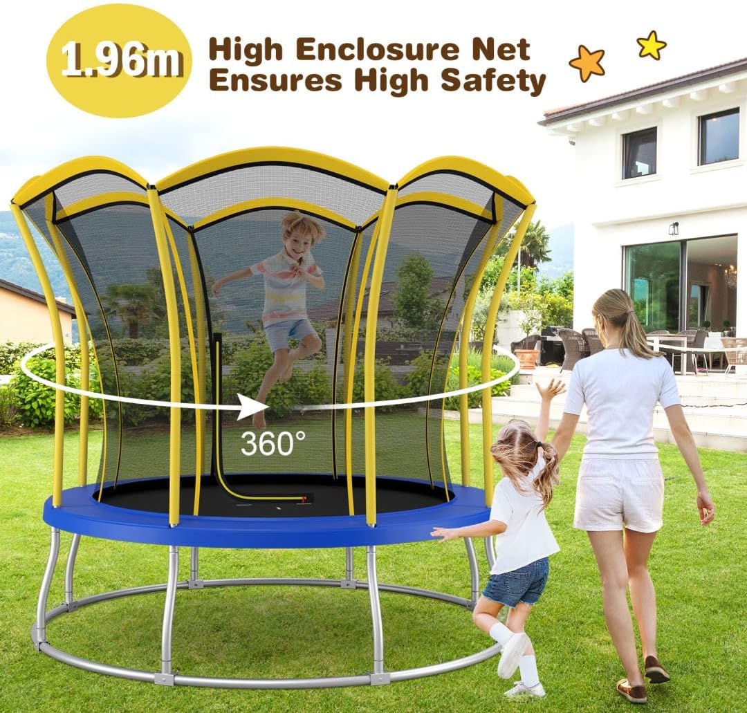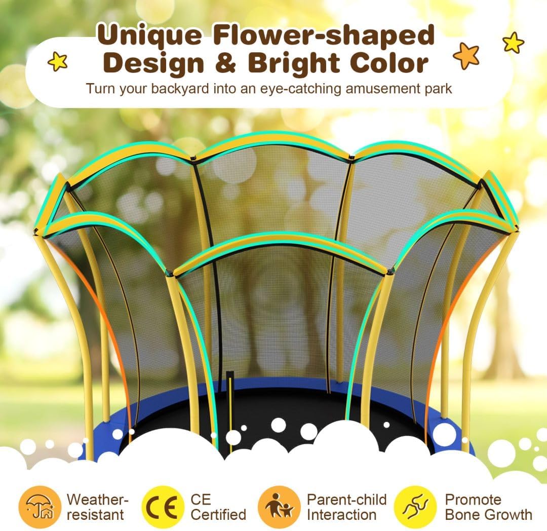 Design innovativo di sicurezza: il nostro trampolino a forma di fiore dispone di uno spazio sicuro tra la rete e il palo, riducendo al minimo il rischio di lesioni durante il gioco. Con una base circolare e gambe curve, offre una stabilità superiore rispetto ai tradizionali trampolini con gambe dritte. Resistenza dimostrata dai test: questo trampolino è dotato di un tappetino in PP di alta qualità resistente all'usura e altamente resistente. Le molle in acciaio zincato, progettate a forma di tamburo, forniscono una tensione e una durata eccezionali (40 molle per il modello 8 FT; 56 molle per il modello 10 FT). Il nostro trampolino è progettato per tutte le condizioni atmosferiche: specificamente progettato per uso esterno, è dotato di un tappetino per saltare e un'imbottitura di sicurezza impermeabile, e il collegamento sicuro tra la rete e i pali può resistere a forti venti. Promuovere il divertimento e la crescita: questo trampolino ricreativo offre un'esperienza gioiosa e arricchente per i bambini e offre anche divertimento agli adulti. Aiuta a migliorare la forza fisica, promuove la crescita del corpo, migliora l'equilibrio e rafforza i legami familiari. Ottima idea regalo: questo trampolino certificato incoraggia lo sviluppo di forza, coordinazione, flessibilità ed equilibrio durante il gioco. Il suo design floreale unico e i colori vivaci miglioreranno il tuo cortile o giardino, creando una divertente area giochi.
