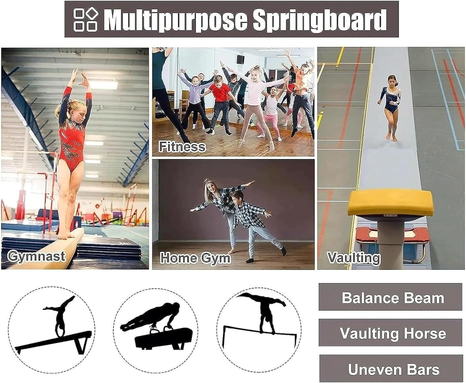 nostri trampolini sono realizzati con assi di legno duro con elevata capacità di carico, senza deformazioni, lisce e senza sbavature, facili da pulire; perfetti in qualsiasi condizione atmosferica, adatti per interni ed esterni. Legno duro spesso, feltro antiscivolo di alta qualità sulla superficie, molla interna in acciaio al manganese ispessita, elevata capacità portante, nessuna deformazione, piastra in acciaio fissata antiruggine. La parte superiore del pannello è rivestita in feltro antiscivolo per proteggere i piedi e garantire una presa ottimale. La superficie comoda non arreca alcun danno ai piedi. La molla spessa ad alta resistenza ha un'elasticità e un rimbalzo eccezionali, è sicura e durevole, fa risparmiare energia ai ginnasti e fa saltare più in alto. Perfetto per programmi di volteggio per i consumatori, ginnastica, stretching, body art e allenamento yoga in sale giochi, case, palestre, scuole, centri di ginnastica, club sportivi, ecc.