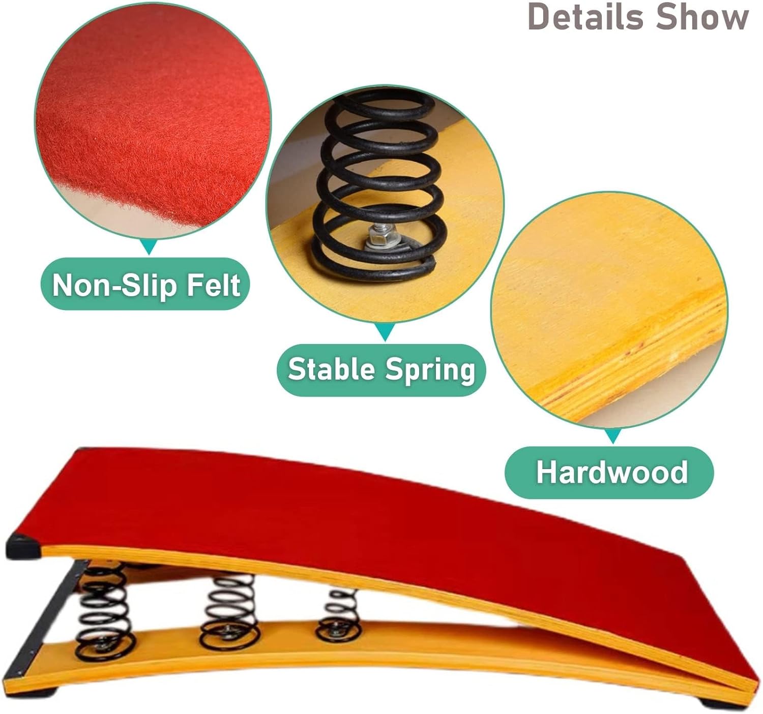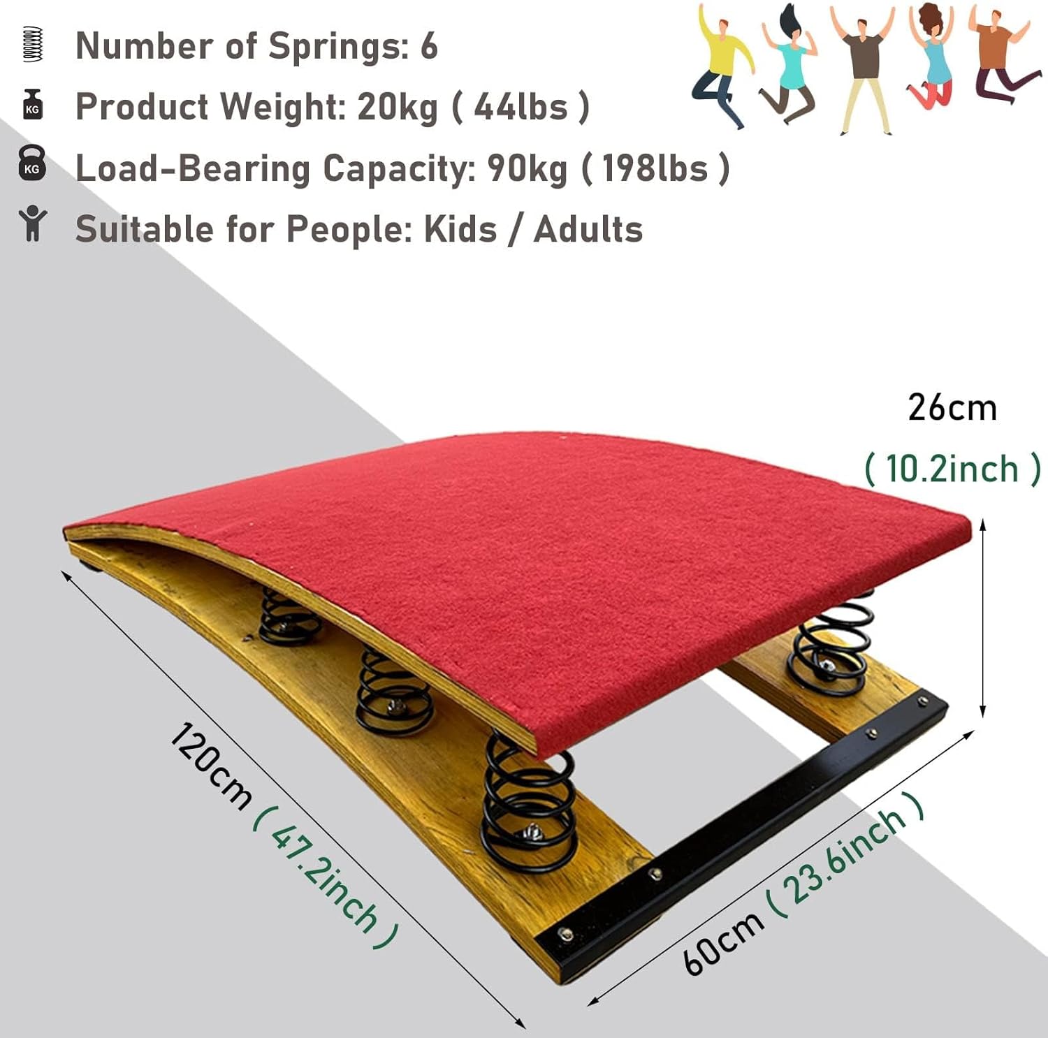 Trampolino di ausilio per il salto: progettato per bambini più grandi, giovani ginnasti e adulti che praticano il salto, questo trampolino è reattivo e riduce notevolmente l'affaticamento dei giocatori. Sports Springboard Body RehabilitationNon è solo un'attrezzatura ginnica utilizzata per migliorare la tecnica di equitazione, praticare lo smontaggio e l'atterraggio, l'arte sportiva e lo stretching. Ampiamente utilizzato: questo trampolino curvo è ideale per l'allenamento, le competizioni, l'intrattenimento quotidiano, ideale per casa, scuola, cantina, sala giochi, palestra, centro di ginnastica, club sportivi e altri ambienti. Robusto e durevole: realizzato in legno duro spesso, rivestito in feltro. 6 molle metalliche consentono un supporto superiore e un utilizzo ottimale. 120 cm (47,2 pollici) di lunghezza, 60 cm (23,6 pollici) di larghezza, 26 cm (10,2 pollici) di altezza dall'estremità più alta. Capacità di carico: < 90 kg (198 libbre). Altezze graduali: trampolino curvo. Grazie alla piattaforma gradualmente inclinata, gli atleti possono posizionare i piedi in una posizione più comoda.