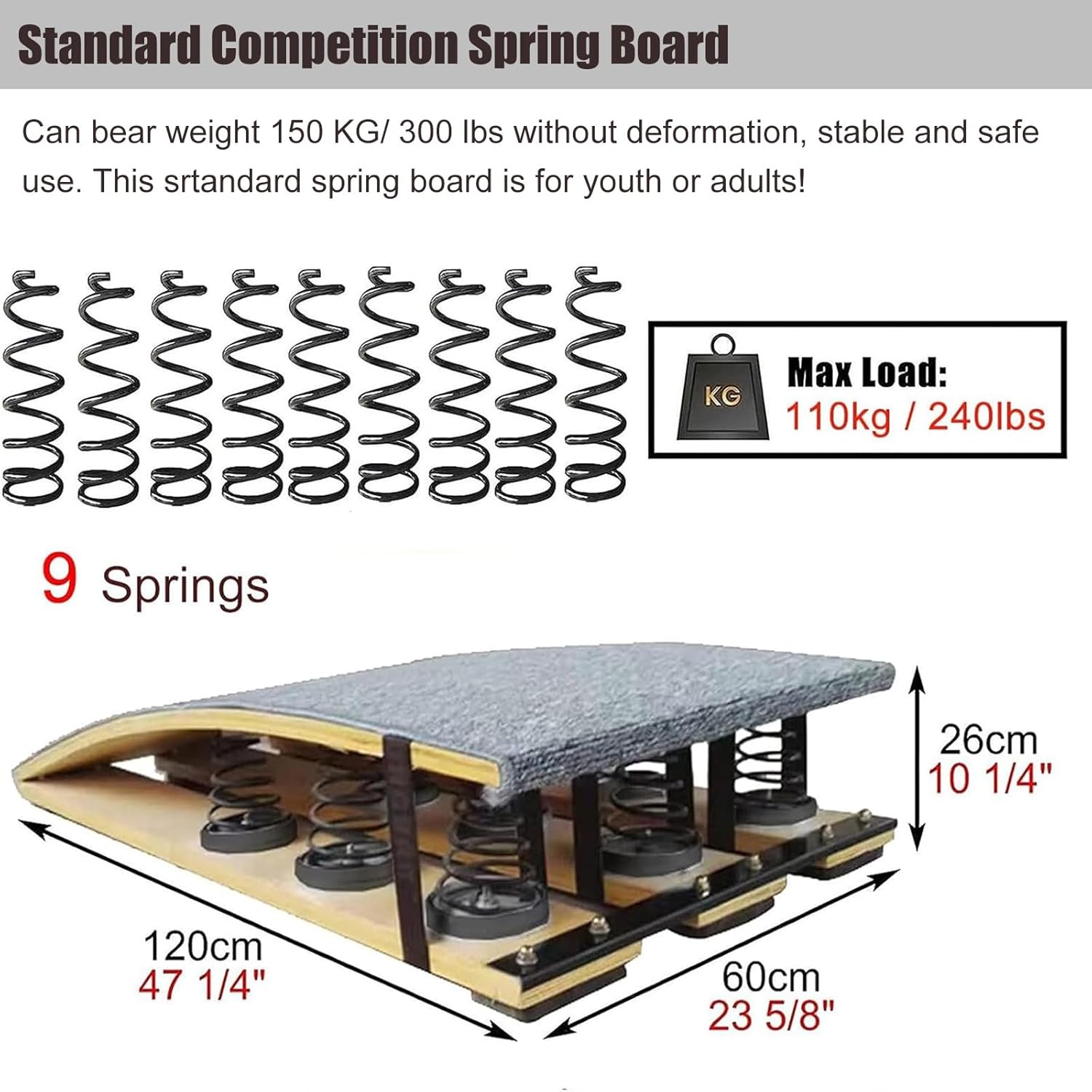 legno stabile: i nostri trampolini sono realizzati con assi di legno duro con una forte capacità portante, senza deformazioni, lisce e senza sbavature, che sono state ripetutamente testate senza danni o rotture. Carico: 110 kg / 240 libbre. 9 Molle in acciaio altamente elastiche: le molle ispessite ad alta tenacità offrono elasticità e resilienza. Sicure, stabili e non si deformano. Risparmia energia per i ginnasti e salta più in alto. Tappeto superiore antiscivolo e confortevole: la parte superiore del pannello è rivestita in feltro antiscivolo, che protegge la sicurezza dei piedi e offre una presa ottimale. La superficie comoda non arreca alcun danno ai piedi. Pannello primaverile per adulti/ragazzi: perfetto per programmi di volteggio per consumatori, ginnastica, stretching, body art e allenamento yoga in sale giochi, case, palestre, scuole, centri di ginnastica, club sportivi, ecc. Attrezzatura sportiva multiuso: può migliorare la tecnica di guida, allenare lo sbarco e l'atterraggio. Può essere utilizzata anche per esercizi di ginnastica artistica, esercizi alla sbarra, salti, stretching, percorsi a ostacoli o allenamento atletico.