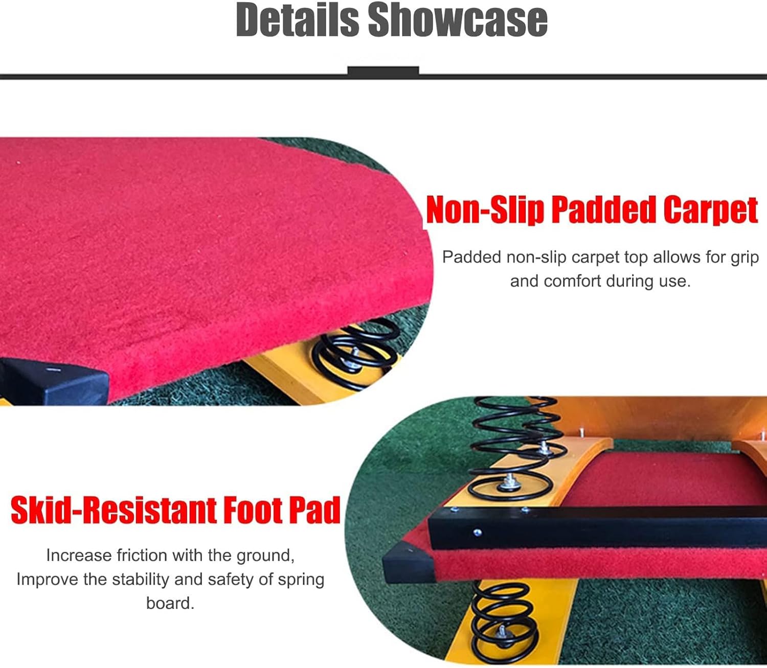 Elevata capacità di rimbalzo e comfort: questo trampolino da ginnastica è realizzato in legno duro liscio e senza sbavature, ricoperto da un tappeto antiscivolo imbottito e con una molla interna in acciaio al manganese. Robusto: realizzato in legno duro spesso, rivestito in feltro. 6 molle metalliche consentono un supporto superiore e un utilizzo ottimale. 120 cm (47,2 pollici) di lunghezza, 60 cm (23,6 pollici) di larghezza, 26 cm (10,2 pollici) di altezza dall'estremità più alta. Design con cuscinetti antiscivolo: la parte inferiore è dotata di un design con cuscinetti antiscivolo, che impedisce al trampolino di scivolare e muoversi grazie al terreno liscio, garantendo all'atleta un salto sicuro. Feltro antiscivolo: la superficie del trampolino è ricoperta di feltro antiscivolo e resistente all'usura, che consente ai piedi di mantenere una buona presa durante il salto, ed è sicuro e anticaduta, proteggendoci il più possibile dagli infortuni. Ampia applicazione: trampolino da ginnastica resistente per casa, palestra, campo di allenamento professionale, palestra, scuola, ecc.
