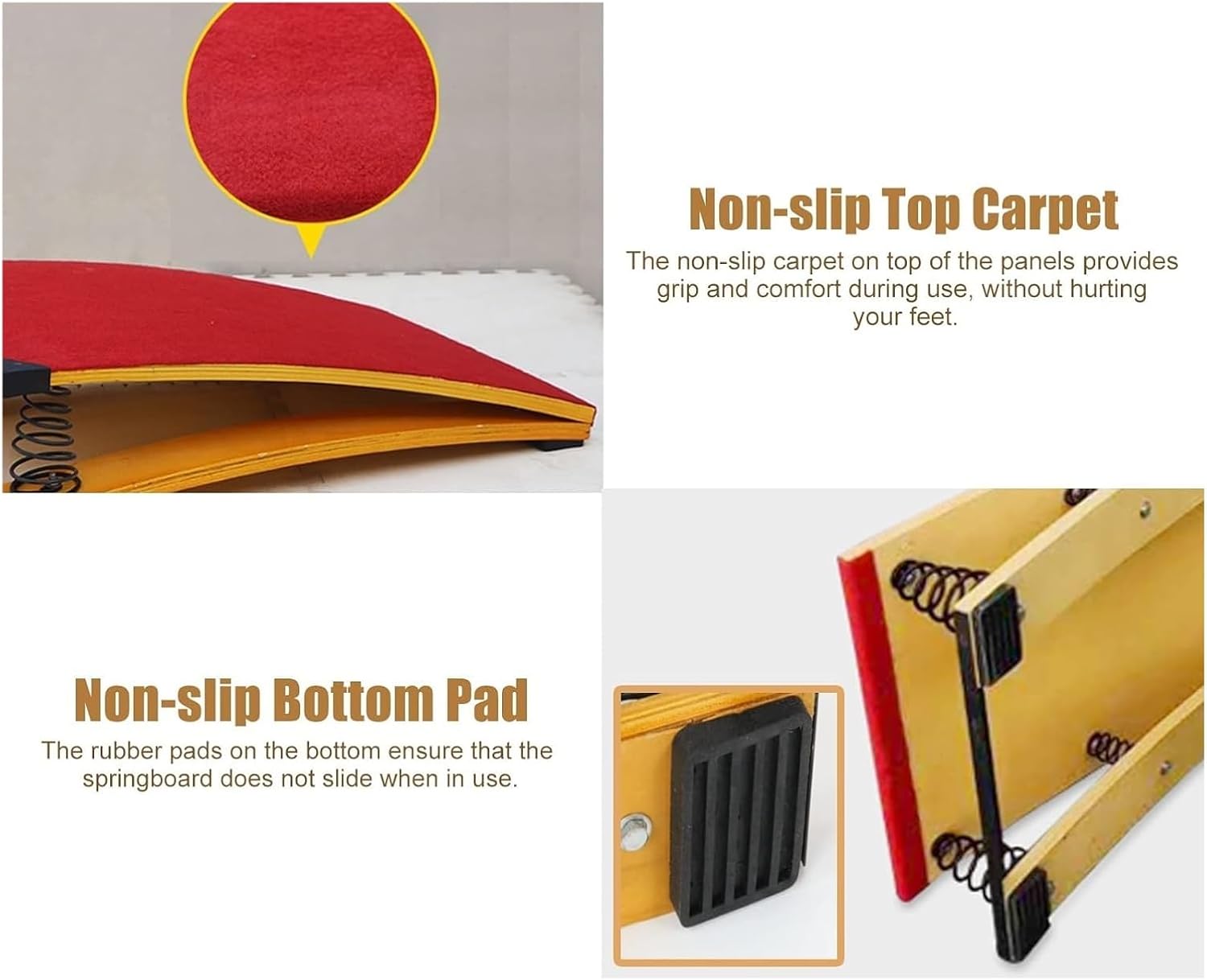 ??【Trampolino da ginnastica junior resistente】Il trampolino è realizzato in legno duro resistente, con bordi lisci e senza sbavature, il che garantisce che non si deformi o si crepi facilmente, rendendolo perfetto per un uso quotidiano soddisfacente. ??【Molla in acciaio ad alta elasticità】La molla ispessita e ad alta tenacità è caratterizzata da un'elasticità e una resilienza eccellenti, garantendo l'assenza di deformazioni e ruggine. Questo aiuta i ginnasti a risparmiare energia e a raggiungere salti più alti, rendendola ideale per la ginnastica giovanile. ??【Tappeto superiore antiscivolo e cuscinetto inferioreIl tappeto antiscivolo sulla parte superiore garantisce aderenza e comfort durante l'uso, prevenendo lesioni ai piedi, mentre i cuscinetti in gomma sulla parte inferiore assicurano che il trampolino rimanga stabile e non scivoli durante l'uso. ??【Trampolino sportivo versatile e strumento di riabilitazioneQuesto trampolino non è solo essenziale per migliorare la tecnica di volteggio a cavallo e per esercitarsi nello smontaggio e nell'atterraggio nella ginnastica giovanile, ma serve anche come strumento per lo stretching e la riabilitazione del corpo prima e dopo gli allenamenti. 【Ampia applicazione】Adatto sia per attività all'aperto che al chiuso, come ginnastica, arti marziali, volteggio, esercizi alla barra orizzontale, allenamento atletico e pratica di tumbling. Può essere utilizzato in palestre domestiche, sale giochi, scantinati, scuole, centri di ginnastica o club sportivi.