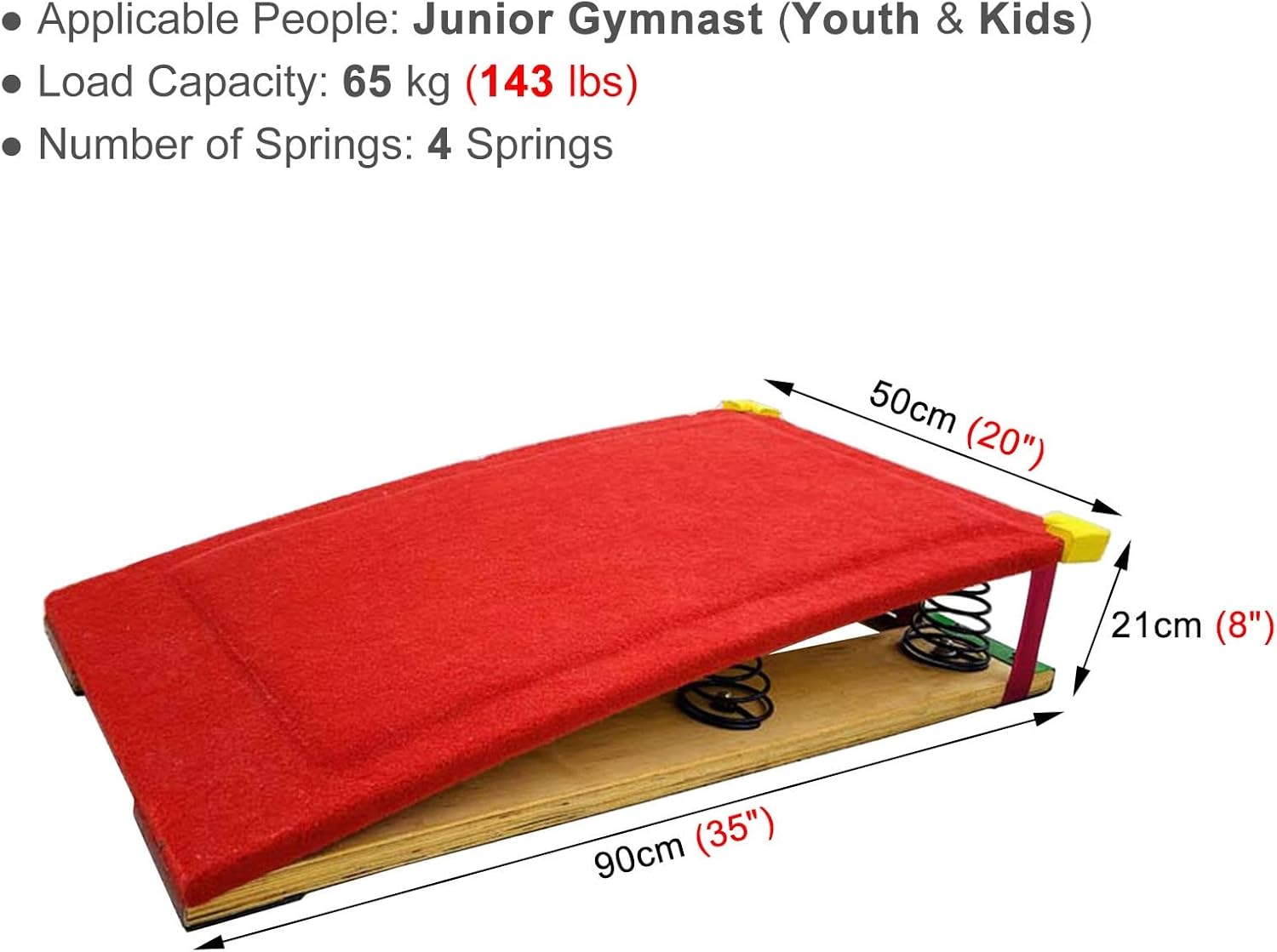 [Resistente e stabile] Il nostro trampolino è realizzato in legno massello, con una forte capacità portante, nessuna deformazione, liscio e senza sbavature, facile da pulire; perfetto in qualsiasi condizione atmosferica, adatto per interni ed esterni. [Comodo per i piedi nudi] Questi trampolini sono rivestiti in feltro antiscivolo imbottito. Questo consente ai piedi di aderire bene durante il salto e fornisce anche una superficie confortevole. Sono ecologici e facili da pulire. [Progettato per i bambini] Carico massimo: 65 kg/143 libbre. Questo Powerboard è perfetto per lezioni di ginnastica in età prescolare, per migliorare le abilità di volteggio, per salire sulle parallele asimmetriche, per esercitarsi negli atterraggi, per Pilates, yoga, arte fisica o stretching. [4 Molla in acciaio per impieghi gravosi] Molla ad alta tenacità e ispessita, elasticità e resilienza, sicura e durevole, reattiva e riduce notevolmente l'affaticamento degli atleti. Consente un supporto superiore e un utilizzo ottimale. [Trampolino Junior] Dimensioni: 50 cm (20 pollici) di larghezza, 90 cm (35 pollici) di profondità, 21 cm (8 pollici) di altezza dall'estremità più alta. Perfetto per bambini e ragazzi che si allenano a casa, a scuola, in palestre, piccole sale giochi, centri di ginnastica, club sportivi e palestre, ecc.