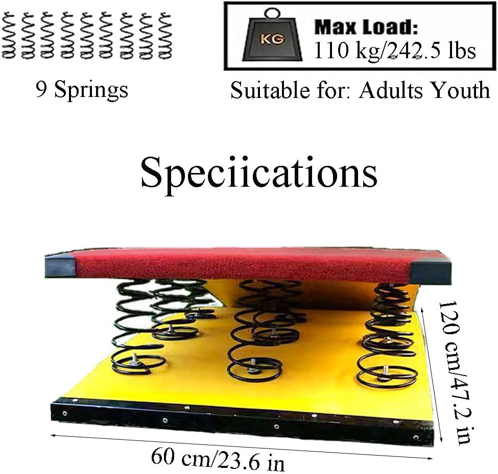 Cuscinetto antiscivolo in gomma di alta qualità, antiscivolo e resistente all'usura, superficie liscia, migliora la stabilità del trampolino, migliora il fattore di sicurezza, seleziona le viti per il fissaggio, impedisce che le viti sbiadiscano e arrugginiscano e migliora la sicurezza e la stabilità del prodotto Selezione di materiali di alta qualità, realizzati con pannelli di legno compressi ad alta resistenza, con una superficie liscia e senza sbavature, sicura e durevole. La superficie è rivestita in feltro di alta qualità, antiscivolo, assorbente, sicuro e facile da pulire. Il trampolino elastico è applicabile all'allenamento, alla competizione e alla valutazione dell'attrezzatura necessaria per le arti marziali, il salto mortale, l'atletica leggera, il salto in lungo da fermo, il salto in lungo nella sabbia, il salto in lungo con corsa e altri eventi di atletica leggera per migliorare la qualità fisica e migliorare l'auto-temperamento. Molla spessa ad alta elasticità, molla spessa ad alta tenacità con migliore elasticità, sicurezza e durata, che fornisce un supporto eccellente e la migliore esperienza e senso d'uso, rendendo il tuo allenamento senza preoccupazioni 【Servizio】I nostri prodotti vengono rigorosamente selezionati prima della spedizione, ci impegniamo per una maggiore soddisfazione. In caso di domande sul nostro prodotto, non esitate a contattare il nostro team di assistenza clienti