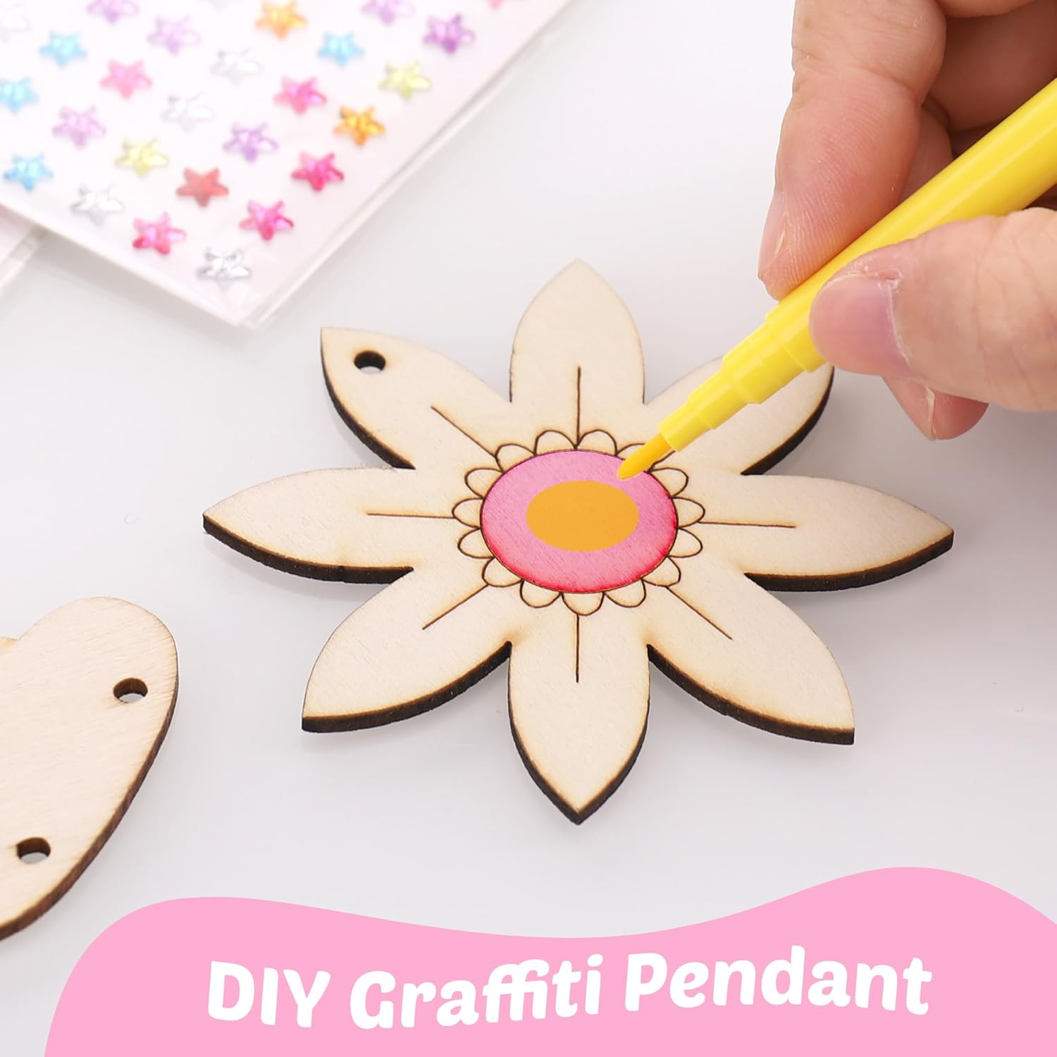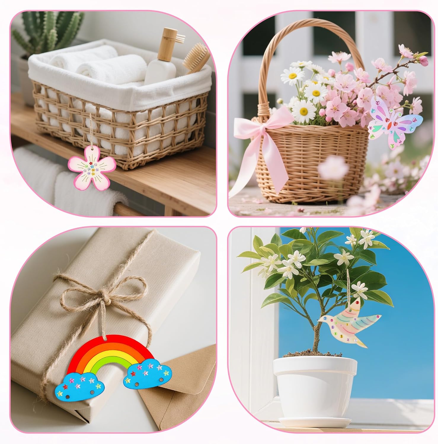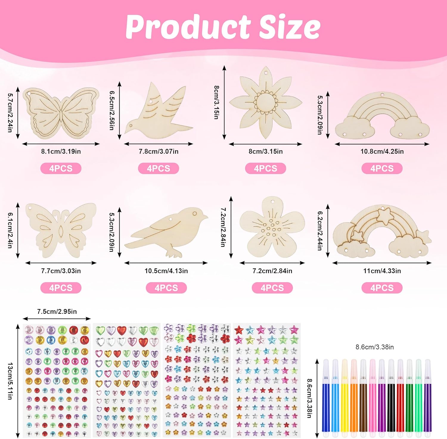 Kit ricco: contiene 80 pezzi di materiali completi (32 artigianato in legno di diverse dimensioni, 12 colori maker, 4 etichette glitterate e 32 corde), con un design preforato per una facile filettatura e appendere, uno sportello unico per colorare, decorare e esporre le esigenze. Facile da usare: con pezzi di legno preforati e spago incluso, non sono necessari strumenti aggiuntivi, basta colorare, infilare e appendere per creare rapidamente bellissime decorazioni, rendendolo facile per tutte le età. Stimola la creatività e lo sviluppo delle abilità dei bambini: i mestieri in legno possono essere dipinti, colorati, scolpiti e incollati, allenando efficacemente la coordinazione occhio-mano, l'attenzione e le capacità di pensiero, incoraggiando l'espressione artistica e stando lontano dai prodotti elettronici. Prodotto sicuro e confortevole per l'interazione familiare: realizzato in legno sicuro, la superficie è liscia e robusta, garantendo che sia sicuro per i bambini da usare; il kit promuove il tempo di artigianato genitore-figlio, aiuta a costruire buone relazioni familiari e porta gioiose esperienze condivise. Versatili per varie occasioni: che si tratti di decorazioni per albero di Natale, feste di compleanno, decorazioni per matrimoni o decorazioni per la casa, questi ritagli in legno possono essere fai da te in decorazioni per le vacanze o regali personalizzati, adattandosi perfettamente a scene festive come Pasqua e Natale.