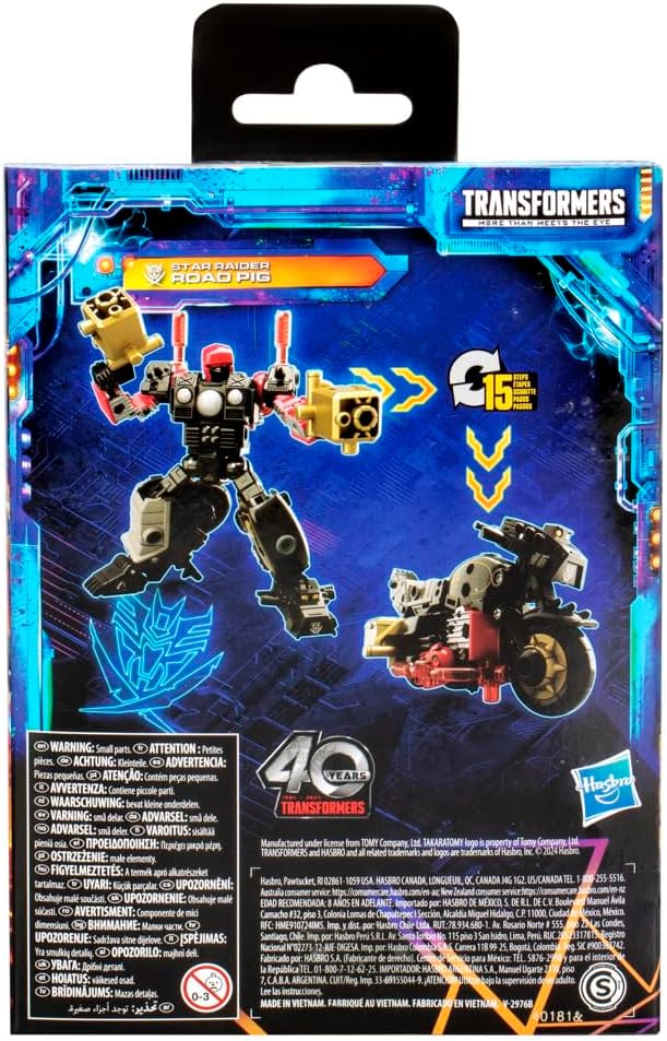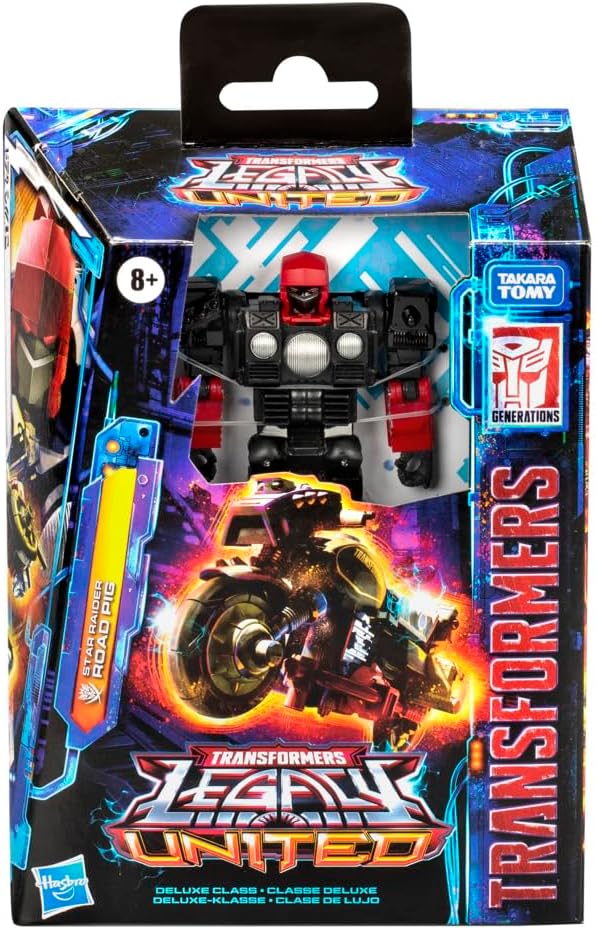STAR RAIDER ROAD PIG Action Figura - Questo giocattolo Star Raider Road Pig da 14 cm presenta deco e dettagli ispirati alla tradizione di Transformers Giocattolo di conversione Transformer 2 in 1 - Transformers action figure si trasforma da giocattolo robot a giocattolo moto in 15 passi Accessori fantastici: la figura Star Raider Road Pig Transformers ha parti staccabili tra cui 2 borse, pneumatici, 2 tubi di scarico, 2 bracci e 2 gambe Articolato per giocare e visualizzare: le figure Transformers sono dotate di teste, braccia e gambe articolate per pose d'azione CELEBRA L'EREDITÀ - Transformers Legacy United onora 40 anni di storia Transformers animata. Colleziona altre figure Legacy: United per mettere insieme la tua collezione (ciascuna venduta separatamente, in base alla disponibilità)