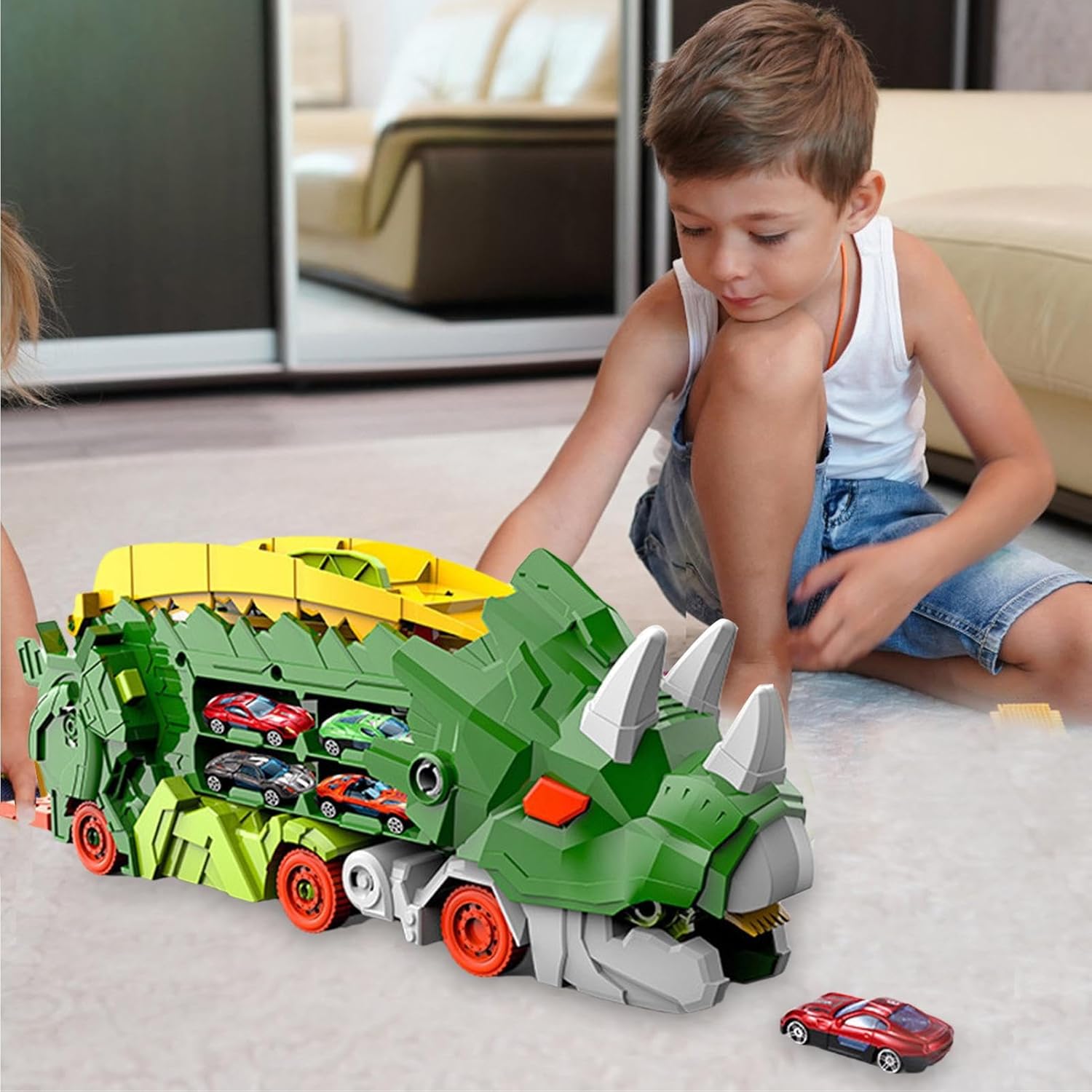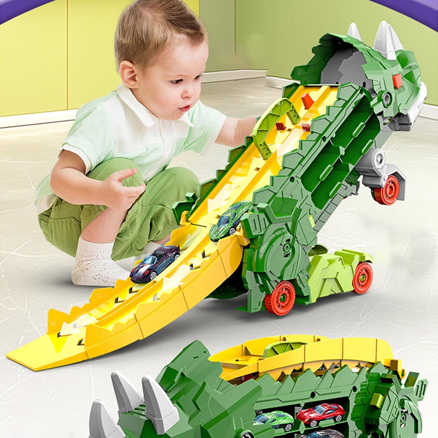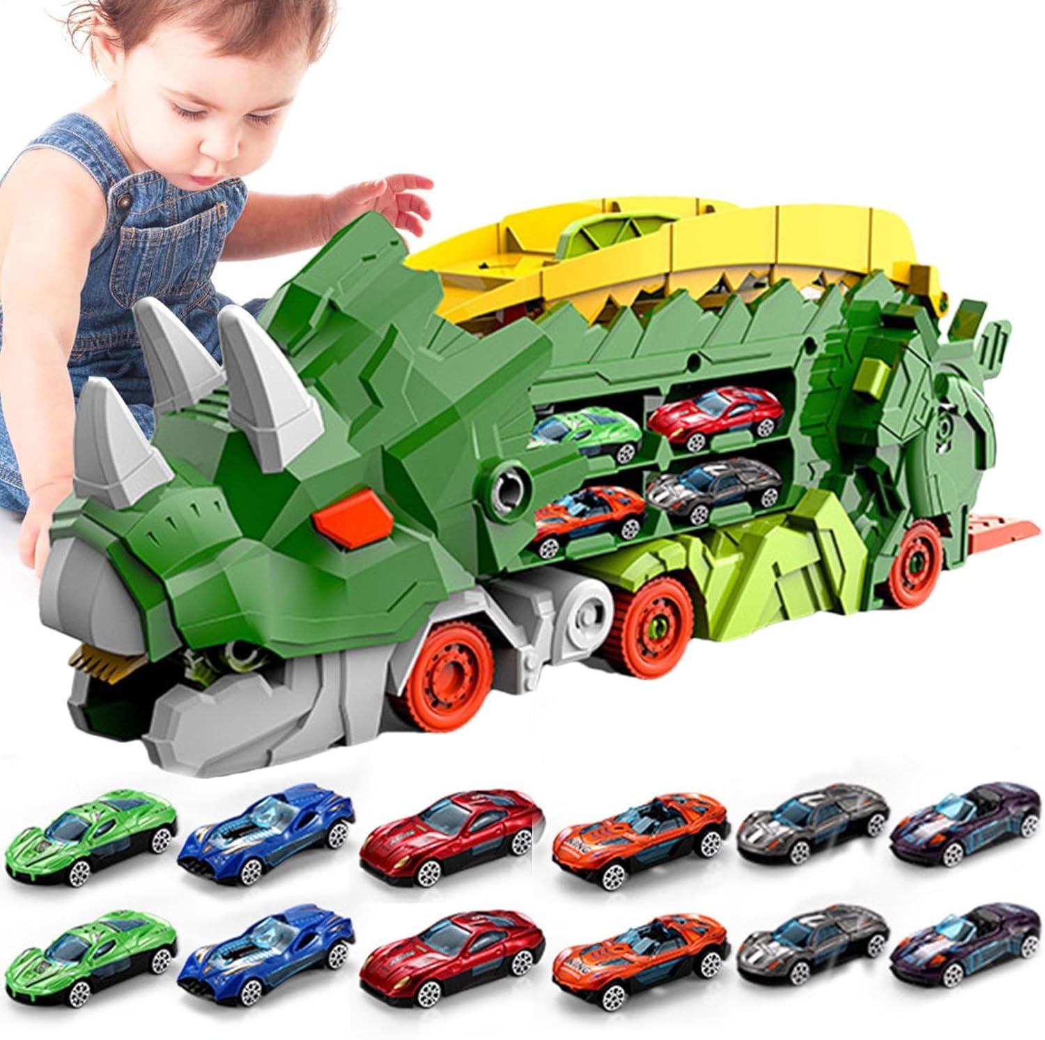 Materiale resistente: con il suo robusto materiale addominale, il nostro camion pieghevole dinosauro è pronto per ogni avventura. È realizzato con materiali sicuri e inodore e promette ai tuoi bambini ore di gioco. Conservazione efficiente Il nostro camion pieghevole dinosauro offre una soluzione di archiviazione efficiente con una struttura a doppio strato e otto scomparti. Può raccogliere e conservare i giocattoli auto cast, rendendo l'organizzazione senza sforzo. Design scorrevole: può facilmente trasformarsi in un dinosauro semplicemente premendo il pulsante della gamba. Prova il divertimento infinito con l'esclusivo design a scorrimento pieghevole, in modo che possa muoversi avanti e indietro come un carrello da trasporto. Giocare senza sforzo: il camion pieghevole dinosauro offre ai bambini un'avventura senza problemi senza bisogno di un telecomando o batterie. Porta un'esperienza di gioco semplice e sicura in un design compatto che ti consente di portare il divertimento ovunque tu vada! Regalo perfetto: delizia i bambini con questo camion pieghevole dinosauro con tonalità vivaci e affascinanti disegni dinosauri per garantire ore di gioco fantasioso.
