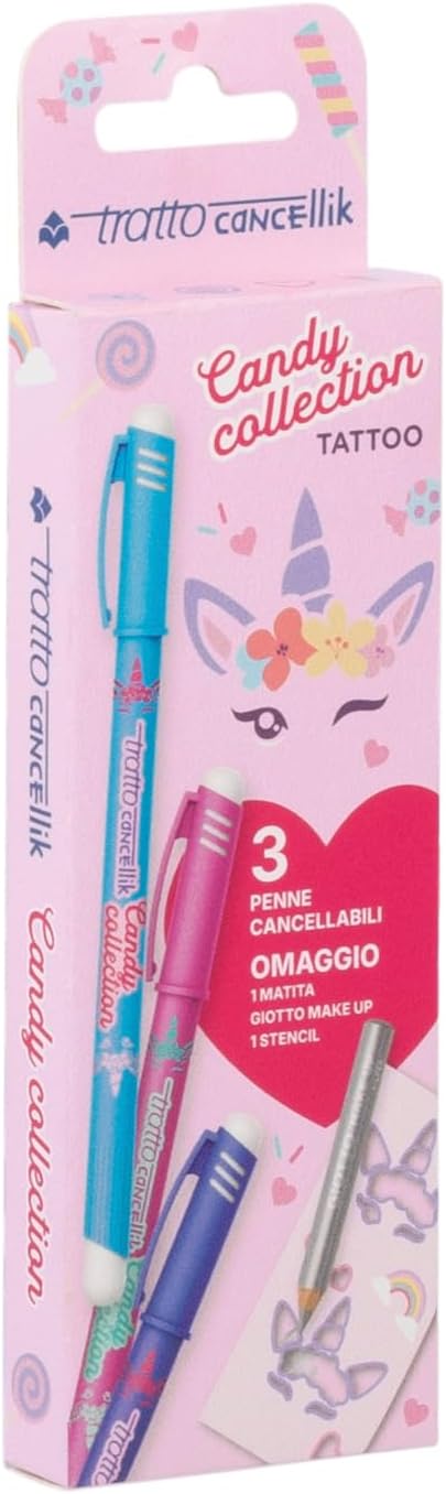 Tratto Cancellik Candy Collection ... con Tattoo in omaggio Dallo studio degli stili più amati dai ragazzi arriva Candy World, un trend che spopola in tutti i settori, dal fashion, al beauty, alla graphic art: colori tenui e grafiche sognanti che richiamano il mondo dei dolci e del fatato Nell'astuccio 3 penne Tratto Cancellik Candy: 1 blu, 1 fucsia e 1 azzurra, in perfetto stile Candy. In più, in omaggio una matita GIOTTO Make Up e uno stencil per "tatuarsi" l'iconico unicorno Candy Collection... È proprio un'edizione imperdibile!