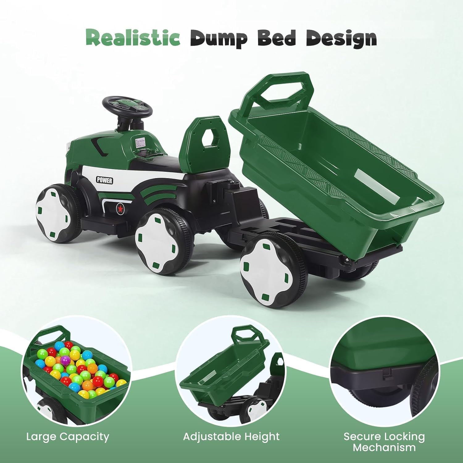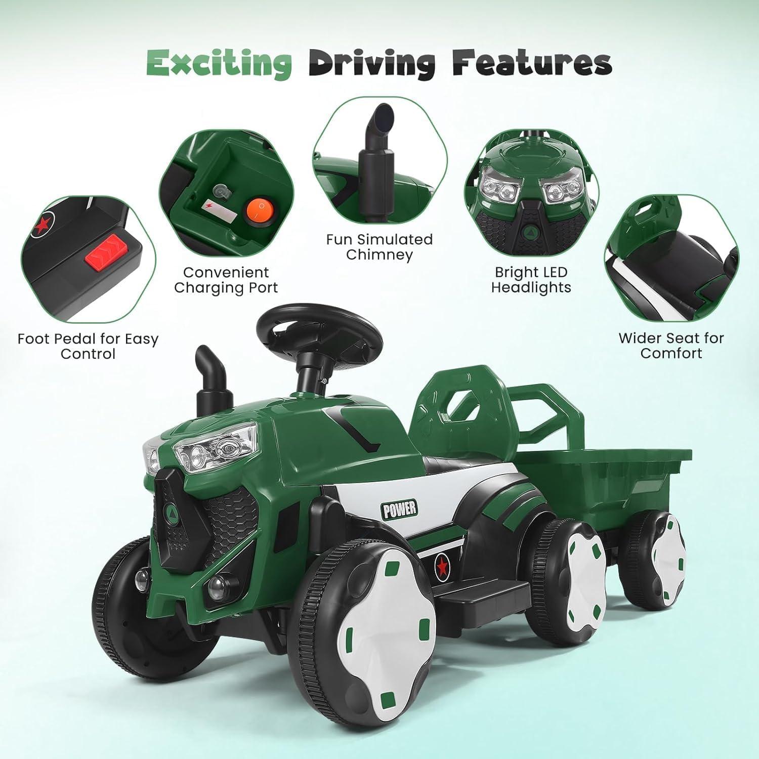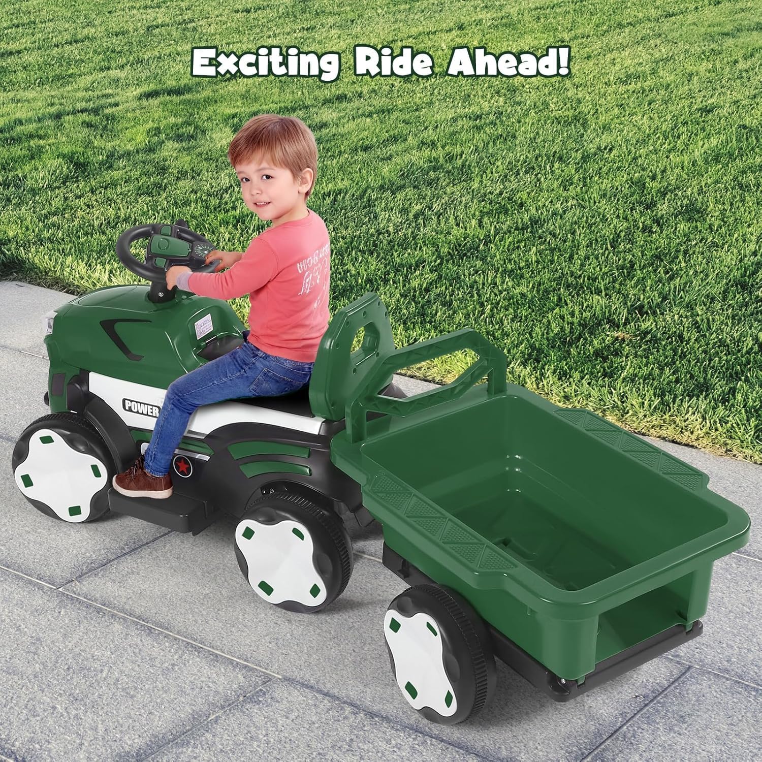 TRATTORE CAVALCABILE 2 IN 1: Questo versatile giocattolo cavalcabile è sia un'auto che un trattore completamente funzionale. L'ampio vano di carico può contenere giocattoli, sabbia o tesori per stimolare l'immaginazione dei bambini. Funzionalità di guida entusiasmanti: Questo trattore cavalcabile offre un'esperienza di guida realistica grazie al controllo elettrico a pedale, al volante fluido e al divertente modello di camino. Il pannello di controllo multifunzione è dotato di fari a LED luminosi, musica e luci integrate per un divertimento ancora maggiore. Costruzione resistente per un divertimento senza fine: Questo trattore cavalcabile è realizzato con materiali di alta qualità e può sopportare fino a 50 kg. La sua struttura robusta garantisce la sicurezza dei bambini più attivi e permette loro di godersi infinite avventure e divertimento. Pneumatici fuoristrada antiscivolo: Questo trattore cavalcabile è dotato di pneumatici di grandi dimensioni antiurto, silenziosi e antiscivolo che possono scivolare facilmente su pavimenti in legno, strade in cemento, sentieri pavimentati e strade asfaltate. La sua struttura robusta garantisce sicurezza e stabilità su tutte le superfici. Il regalo perfetto per i piccoli avventurieri: questo trattore cavalcabile è più di un semplice giocattolo. Cresce con i bambini ed è divertente ed educativo. È il regalo perfetto per un compleanno, Natale o qualsiasi altra occasione speciale!