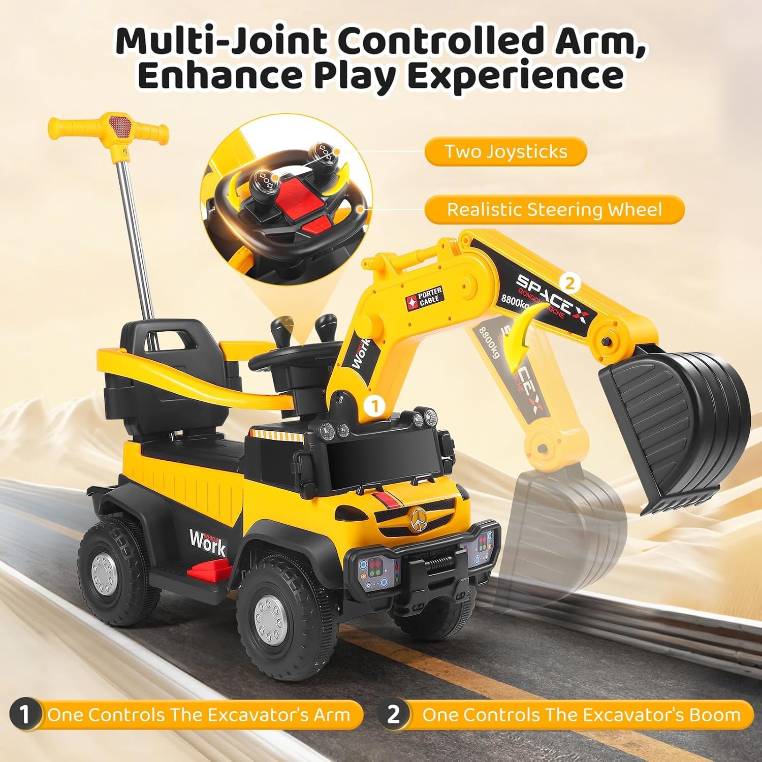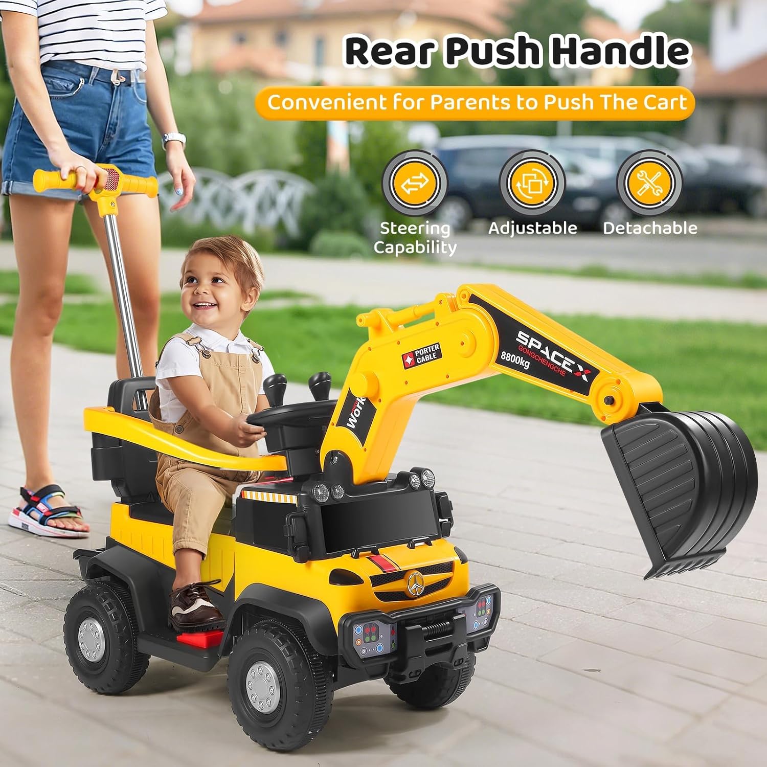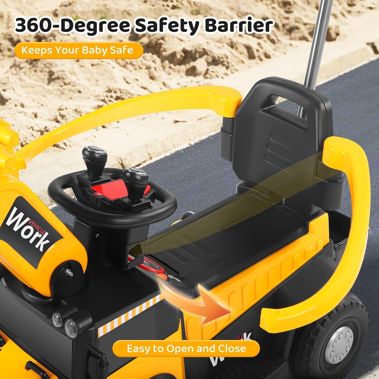 Controllo intuitivo – facile da padroneggiare: con due joystick è possibile controllare il braccio e il braccio in modo intuitivo, sia che si tratti di scavare, pale o sollevamento: i bambini possono controllare ogni movimento con precisione, proprio come un vero escavatore. Facile da imparare e divertirsi subito, perfetto per accendere l'entusiasmo della costruzione. 【Esperienza di guida coinvolgente – realistico come si fa a fare】Il volante realistico offre un'esperienza di guida autentica, combinata con luci dinamiche e suoni divertenti. Ogni viaggio diventa un"entusiasmante avventura in cantiere in cui i bambini sentono di essere veramente coinvolti nella costruzione - coinvolgente e motivante! 【Batteria a lunga durata – Divertimento senza interruzioni】Una potente batteria garantisce lunghe sessioni di gioco, senza ricarica costante. Il comodo sedile e lo spazioso cestino della pala permettono di "lavorare" per ore senza sovraccaricarsi. Il pratico contenitore mantiene i giocattoli preferiti a portata di mano: pratici e intelligenti 【Protezione di sicurezza a 360° – I genitori sono sicuri】Una barriera di sicurezza completa circonda il sedile, per la massima protezione. Il design sicuro e facile da aprire mantiene i bambini al sicuro e allo stesso tempo permette un accesso rapido, così i genitori possono guardare i loro piccoli divertirsi. 【Potenza su tutto il terreno】 Le grandi ruote ammortizzanti garantiscono una guida stabile e silenziosa, sia su asfalto, sentieri di pietra, ghiaia o erba. La maniglia di spinta posteriore regolabile aiuta i genitori a guidare delicatamente il loro piccolo pilota quando necessario: flessibile e affidabile, per qualsiasi ambiente!