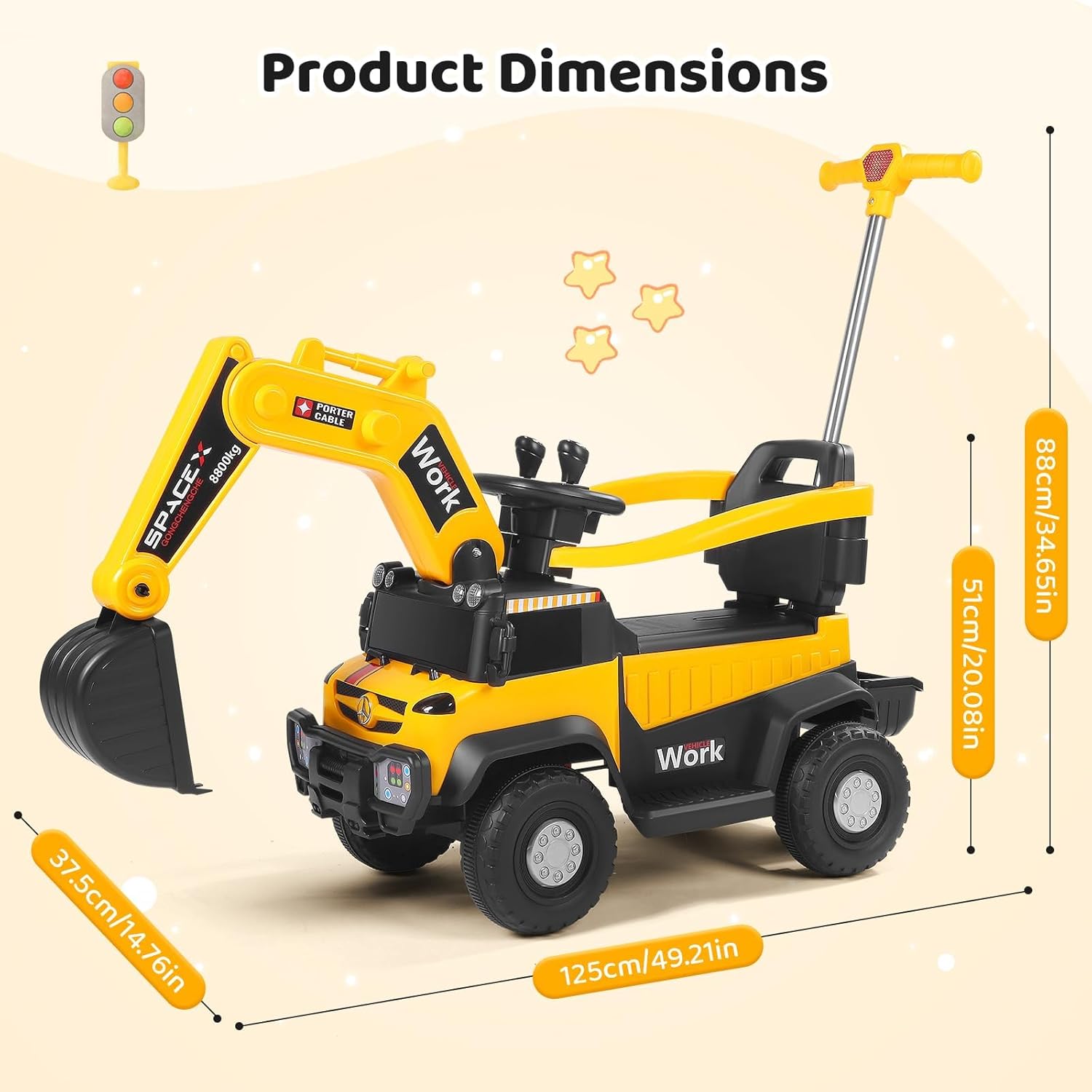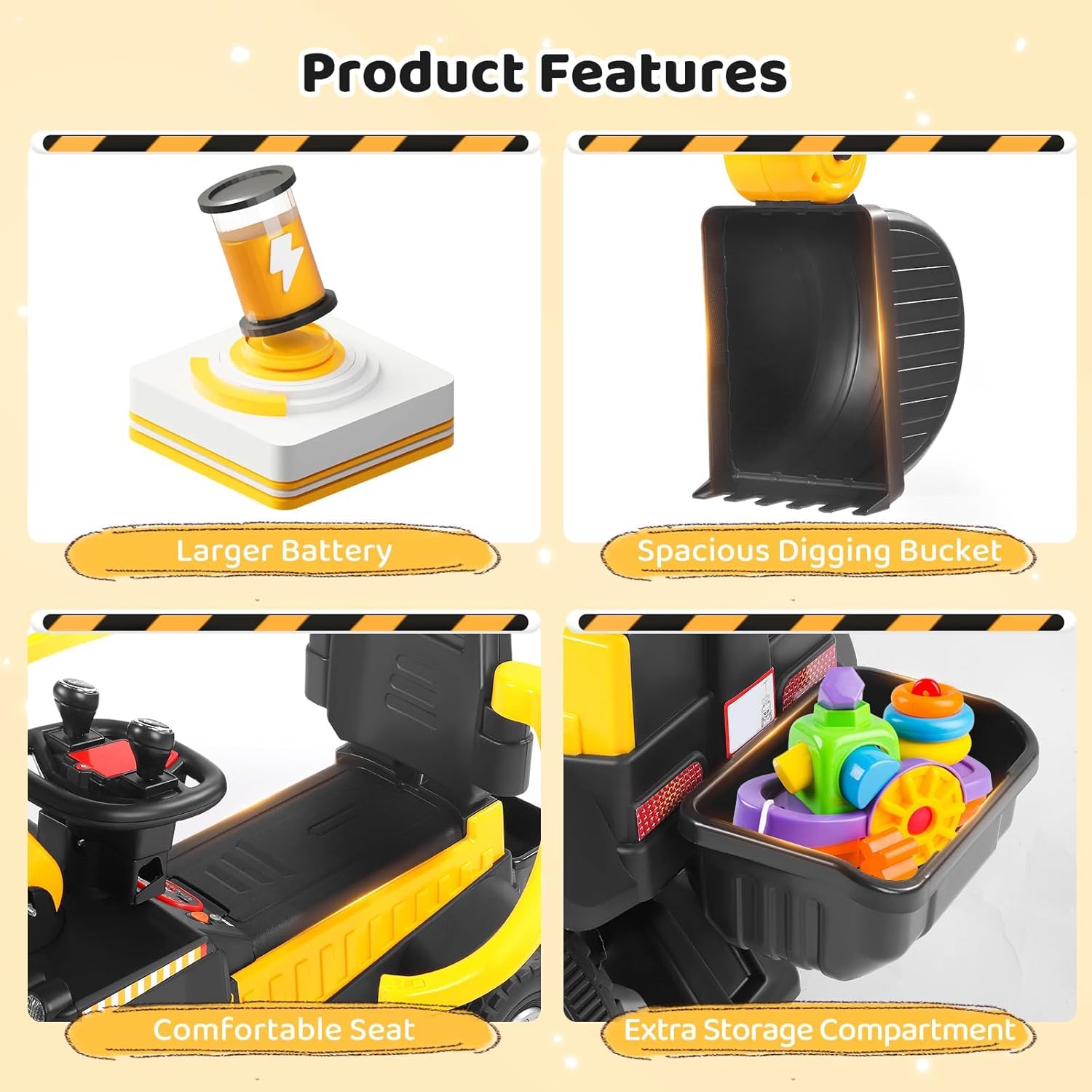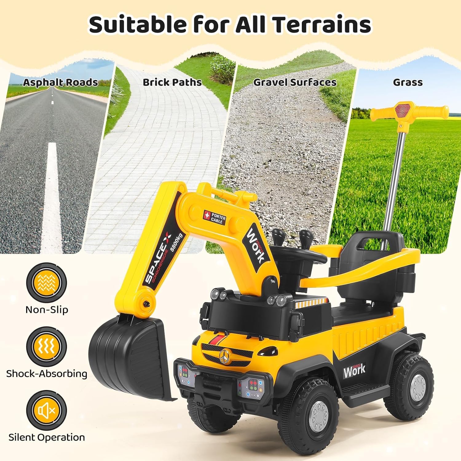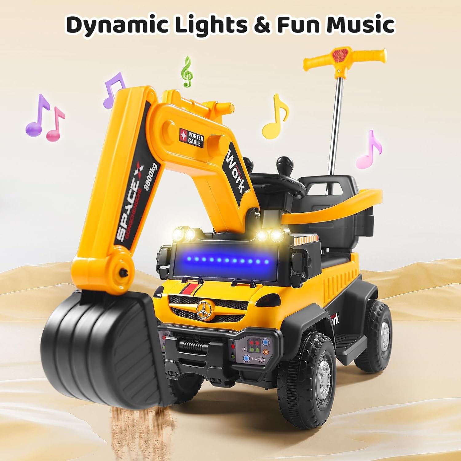 Controllo intuitivo – facile da padroneggiare: con due joystick è possibile controllare il braccio e il braccio in modo intuitivo, sia che si tratti di scavare, pale o sollevamento: i bambini possono controllare ogni movimento con precisione, proprio come un vero escavatore. Facile da imparare e divertirsi subito, perfetto per accendere l'entusiasmo della costruzione. 【Esperienza di guida coinvolgente – realistico come si fa a fare】Il volante realistico offre un'esperienza di guida autentica, combinata con luci dinamiche e suoni divertenti. Ogni viaggio diventa un"entusiasmante avventura in cantiere in cui i bambini sentono di essere veramente coinvolti nella costruzione - coinvolgente e motivante! 【Batteria a lunga durata – Divertimento senza interruzioni】Una potente batteria garantisce lunghe sessioni di gioco, senza ricarica costante. Il comodo sedile e lo spazioso cestino della pala permettono di "lavorare" per ore senza sovraccaricarsi. Il pratico contenitore mantiene i giocattoli preferiti a portata di mano: pratici e intelligenti 【Protezione di sicurezza a 360° – I genitori sono sicuri】Una barriera di sicurezza completa circonda il sedile, per la massima protezione. Il design sicuro e facile da aprire mantiene i bambini al sicuro e allo stesso tempo permette un accesso rapido, così i genitori possono guardare i loro piccoli divertirsi. 【Potenza su tutto il terreno】 Le grandi ruote ammortizzanti garantiscono una guida stabile e silenziosa, sia su asfalto, sentieri di pietra, ghiaia o erba. La maniglia di spinta posteriore regolabile aiuta i genitori a guidare delicatamente il loro piccolo pilota quando necessario: flessibile e affidabile, per qualsiasi ambiente!