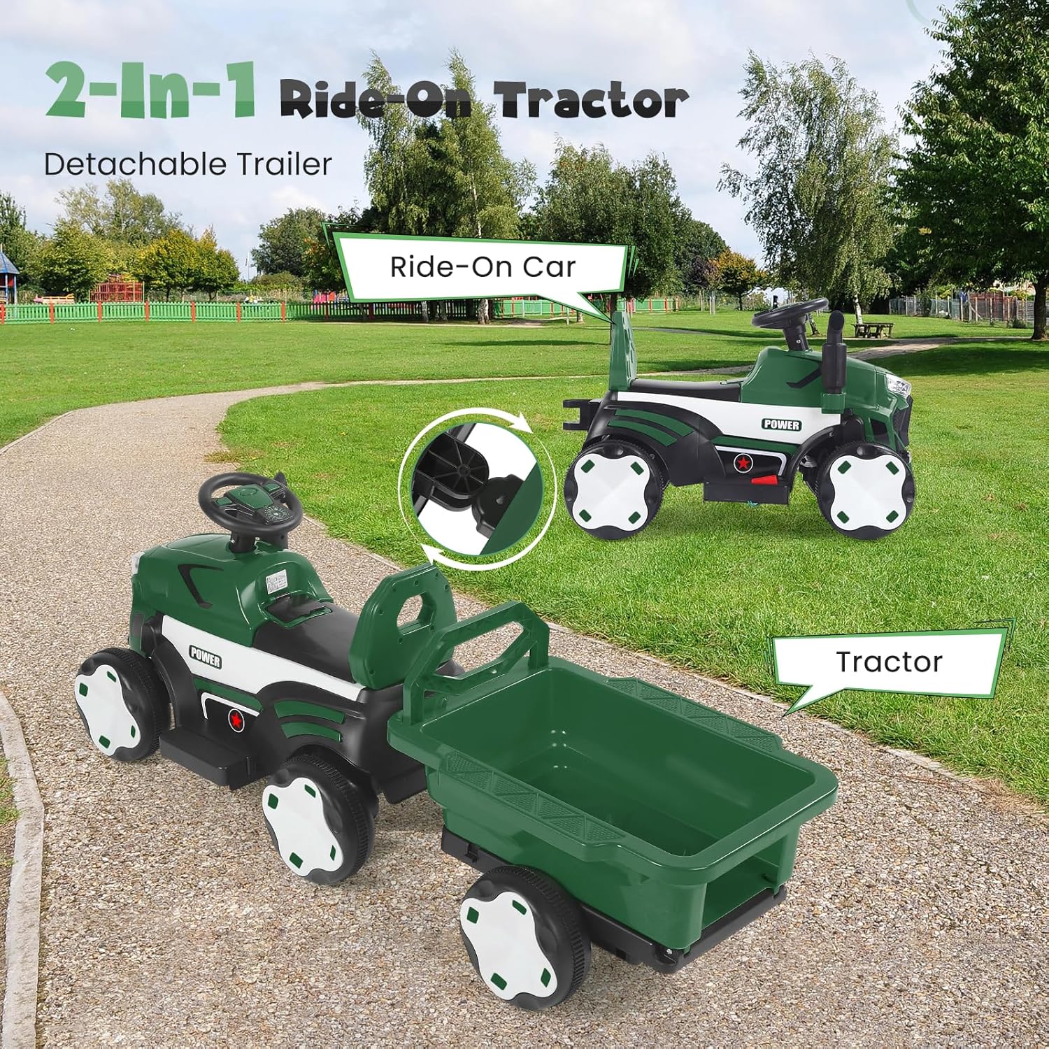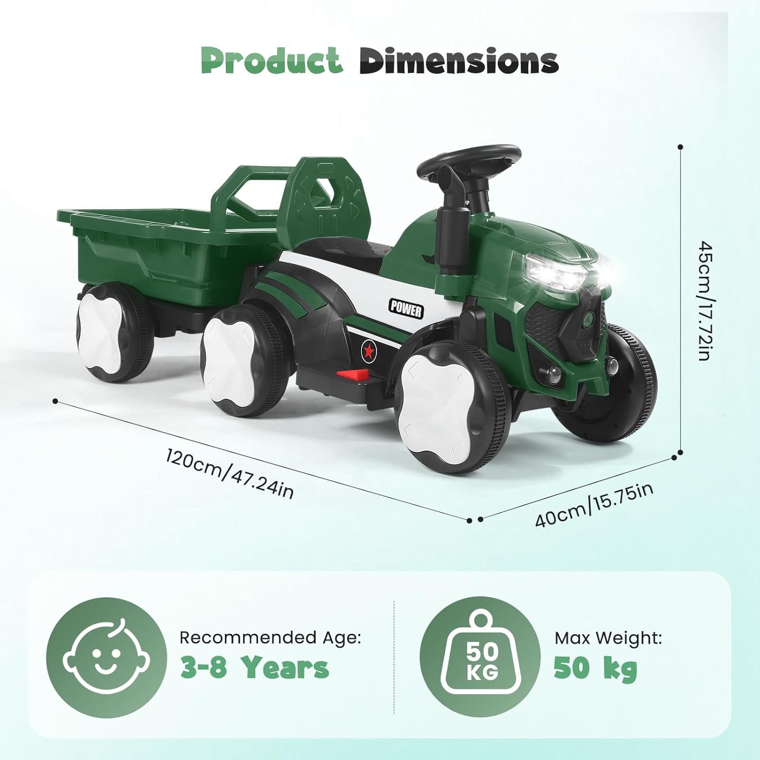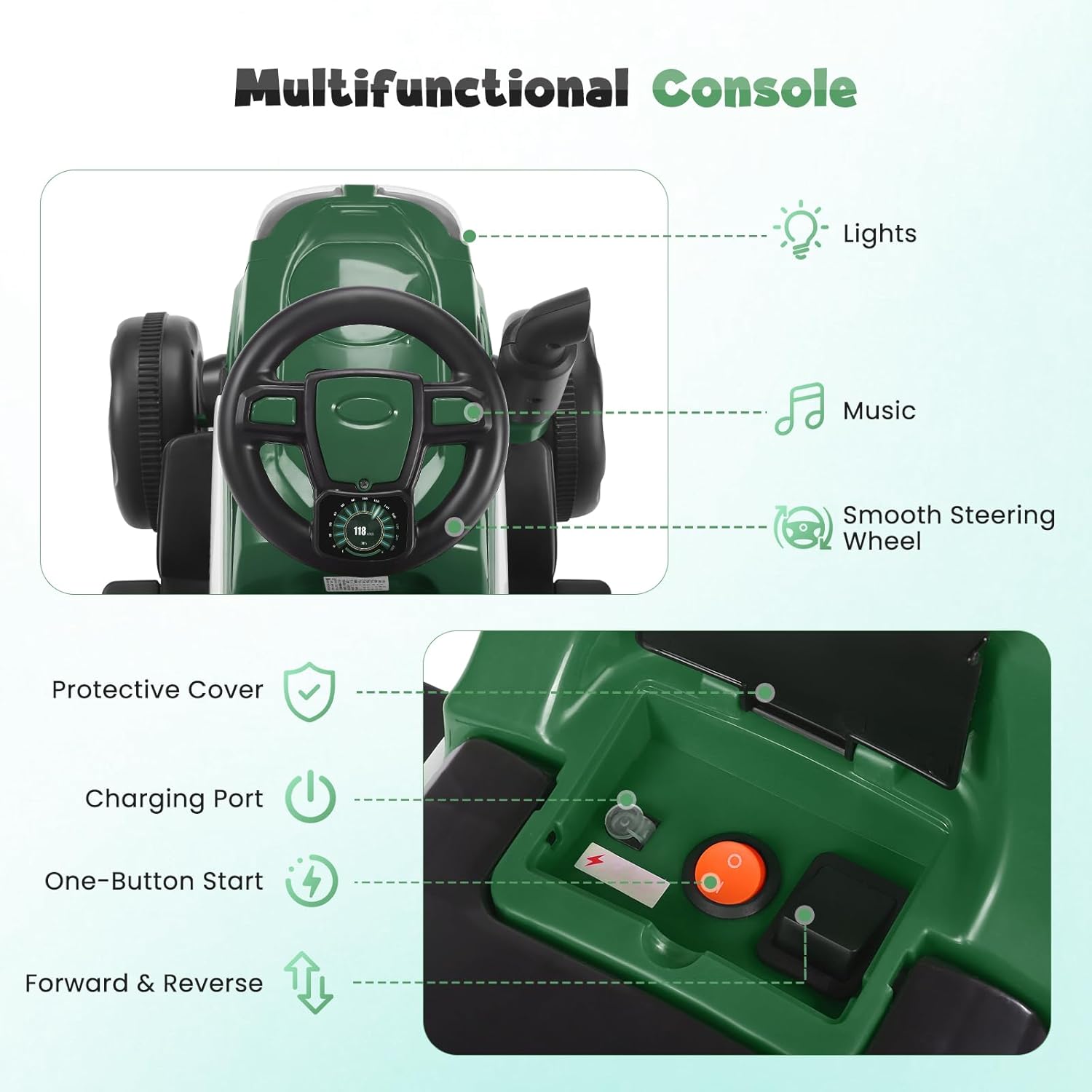 Trattore 2 in 1: questo versatile giocattolo è sia un'auto che un trattore completamente funzionante. La spaziosa area di carico offre molto spazio per giocattoli, sabbia o tesori e stimola l'immaginazione dei bambini mentre giocano. Funzionalità di guida emozionanti: grazie al controllo elettrico del pedale, al volante scorrevole e alla divertente replica del camino, questo trattore da terra offre un'esperienza di guida realistica. Il pannello di controllo multifunzione con fari a LED luminosi, musica integrata e illuminazione ti darà ancora più divertimento. Pneumatici antiscivolo per tutti i terreni: dotato di pneumatici grandi, resistenti agli urti, silenziosi e antiscivolo, questo trattore scivola facilmente su pavimenti in legno, strade in cemento, pavimentazioni e asfalto. La sua struttura robusta garantisce sicurezza e stabilità su tutte le superfici. Costruzione durevole per un divertimento di lunga durata: questo trattore a terra realizzato con materiali di alta qualità supporta fino a 50 kg. La sua struttura robusta garantisce la sicurezza dei bambini attivi e consente loro infiniti divertimenti e avventure. Regalo perfetto per i piccoli avventurieri: questo trattore è più di un semplice giocattolo. Accompagna i bambini piccoli mentre crescono e combina divertimento con valore educativo. È il regalo perfetto per compleanno, Natale o qualsiasi altra occasione speciale!