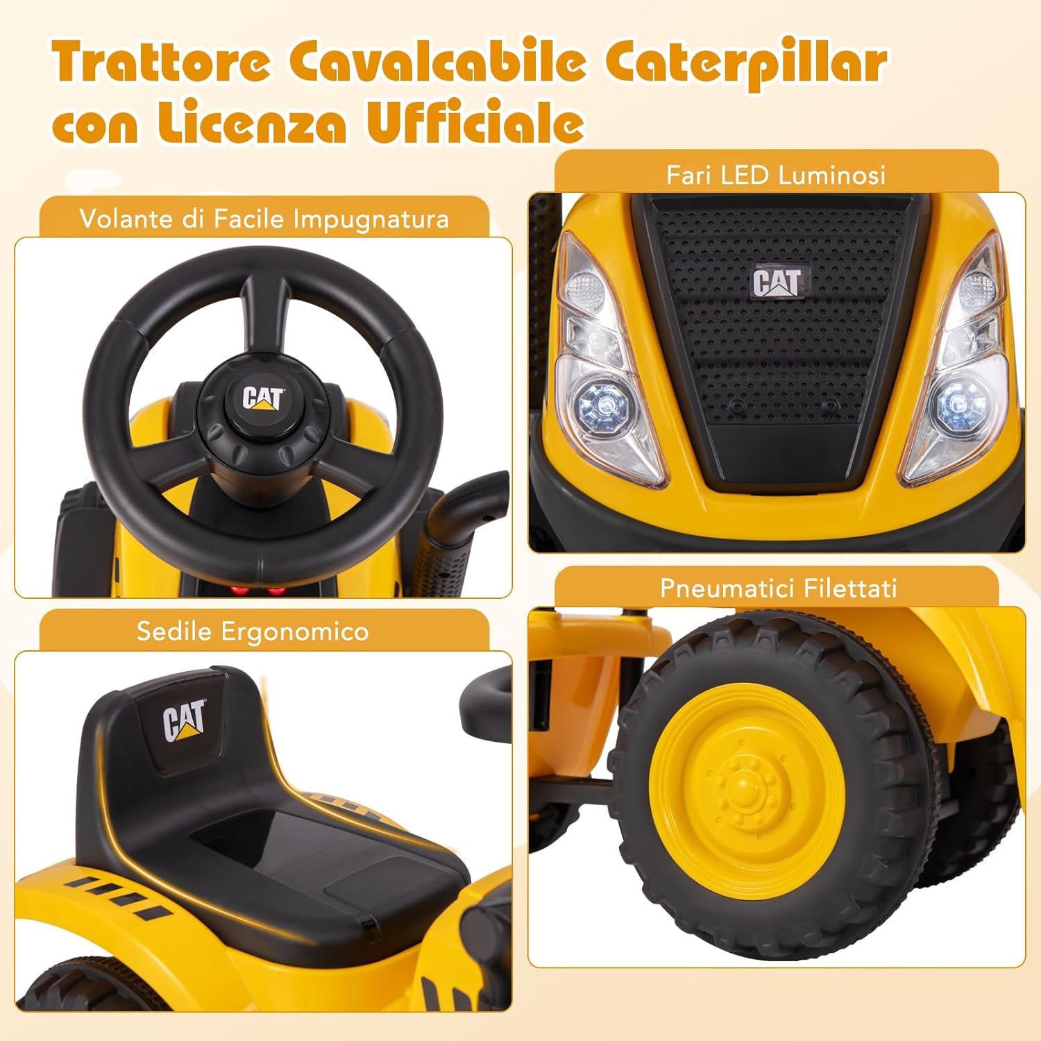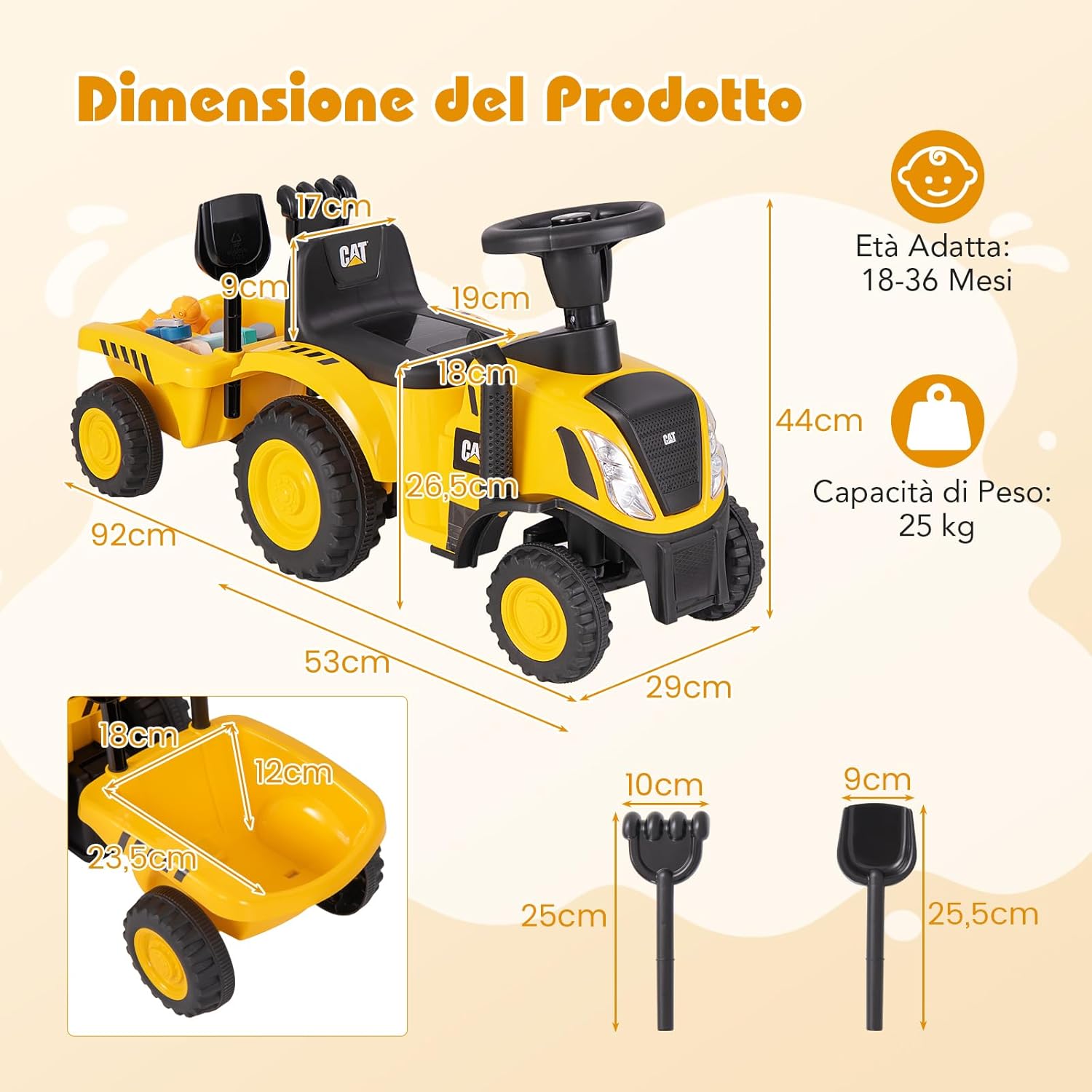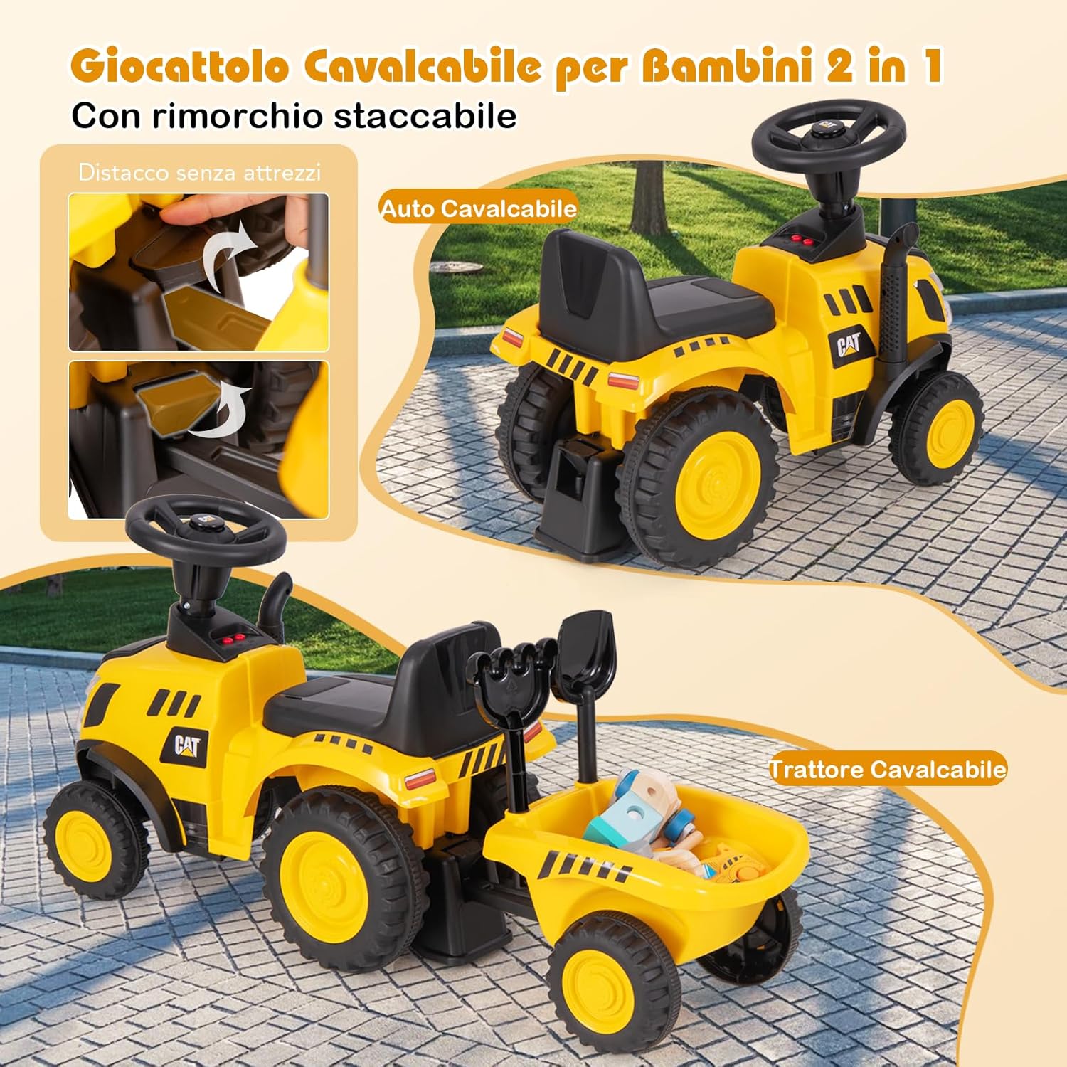 # Trattore convertibile 2 in 1 # Questo trattore Caterpillar con licenza ufficiale si trasforma in un trattore a piedi con rimorchio staccabile, offrendo molto spazio per i giocattoli dei bambini. Lo smontaggio senza attrezzi consente ai bambini di iniziare subito a guidare. # Esperienza di guida divertente # Il trattore a spinta è dotato di suoni realistici del motore e del clacson per immergere il bambino nel divertimento della guida. Inoltre, i fari a LED aggiungono colore al gioco dei bambini. Queste funzioni richiedono 2 batterie AA (non incluse). # Preparatevi alle avventure all'aria aperta # Questo giocattolo scorrevole a due zampe si adatta perfettamente a una varietà di terreni grazie alle sue ruote filettate, consentendo al bambino di affrontare le avventure all'aperto con fiducia. Inoltre, la pala e il rastrello inclusi ispireranno il bambino a essere creativo nella sabbia. # Design ergonomico e sicuro # Progettato pensando al comfort del bambino, questo giocattolo da passeggio senza motore è dotato di un volante facile da impugnare e di un sedile ergonomico con schienale di sostegno. Risponde a standard elevati e riconosciuti per garantire la sicurezza dei bambini e la tranquillità dei genitori. # Il regalo perfetto per il vostro bambino # Questo trattore a spinta non solo aumenta il divertimento, ma allena anche i muscoli delle gambe, migliora la coordinazione, sviluppa le capacità motorie e aumenta la fiducia in se stessi. È il regalo perfetto per i bambini