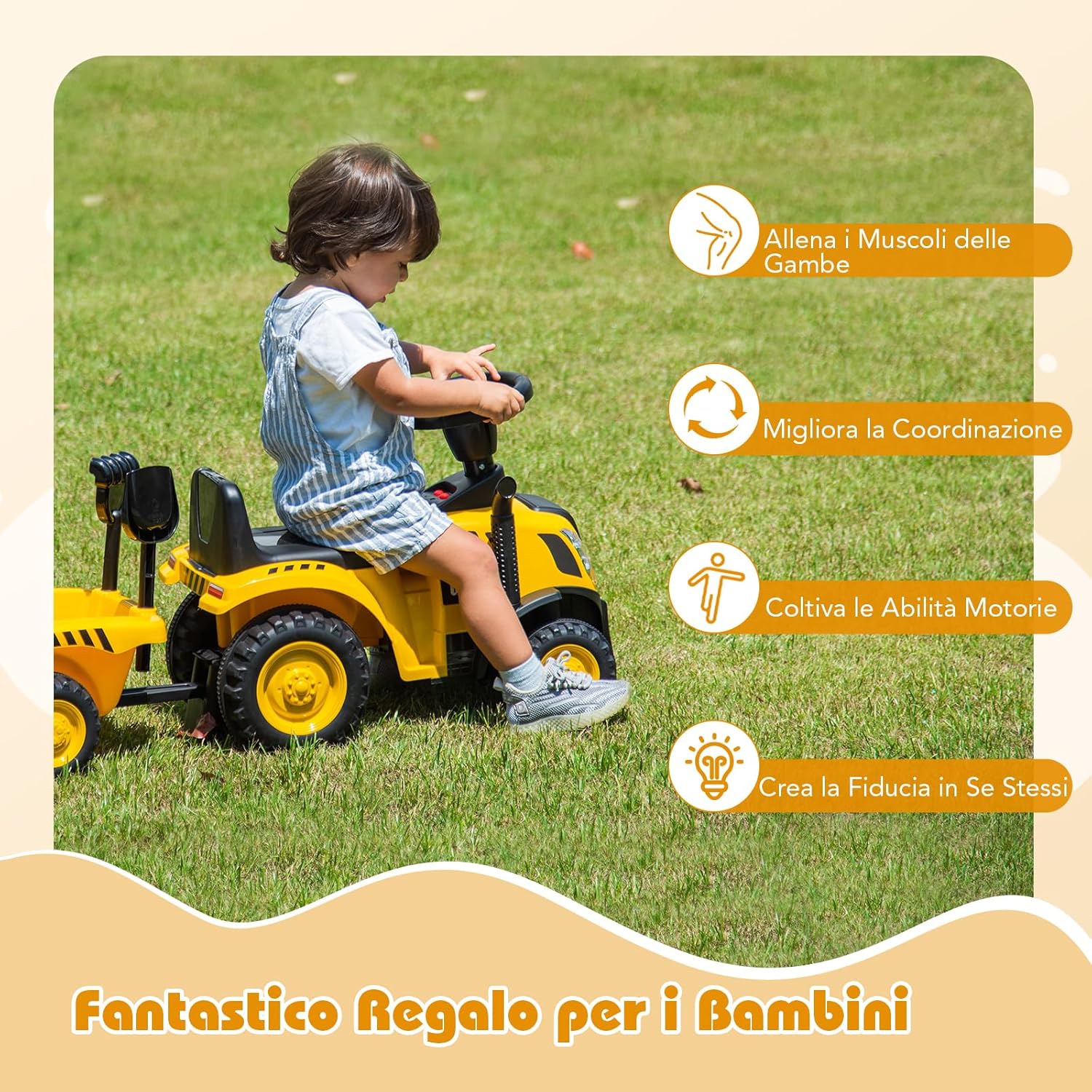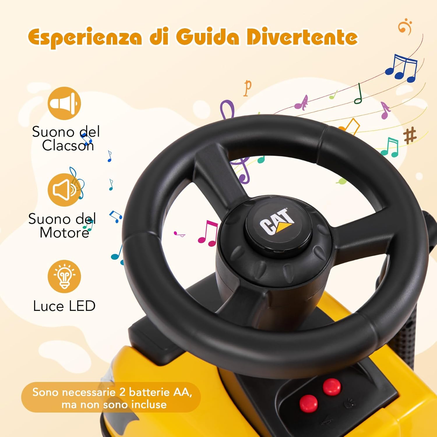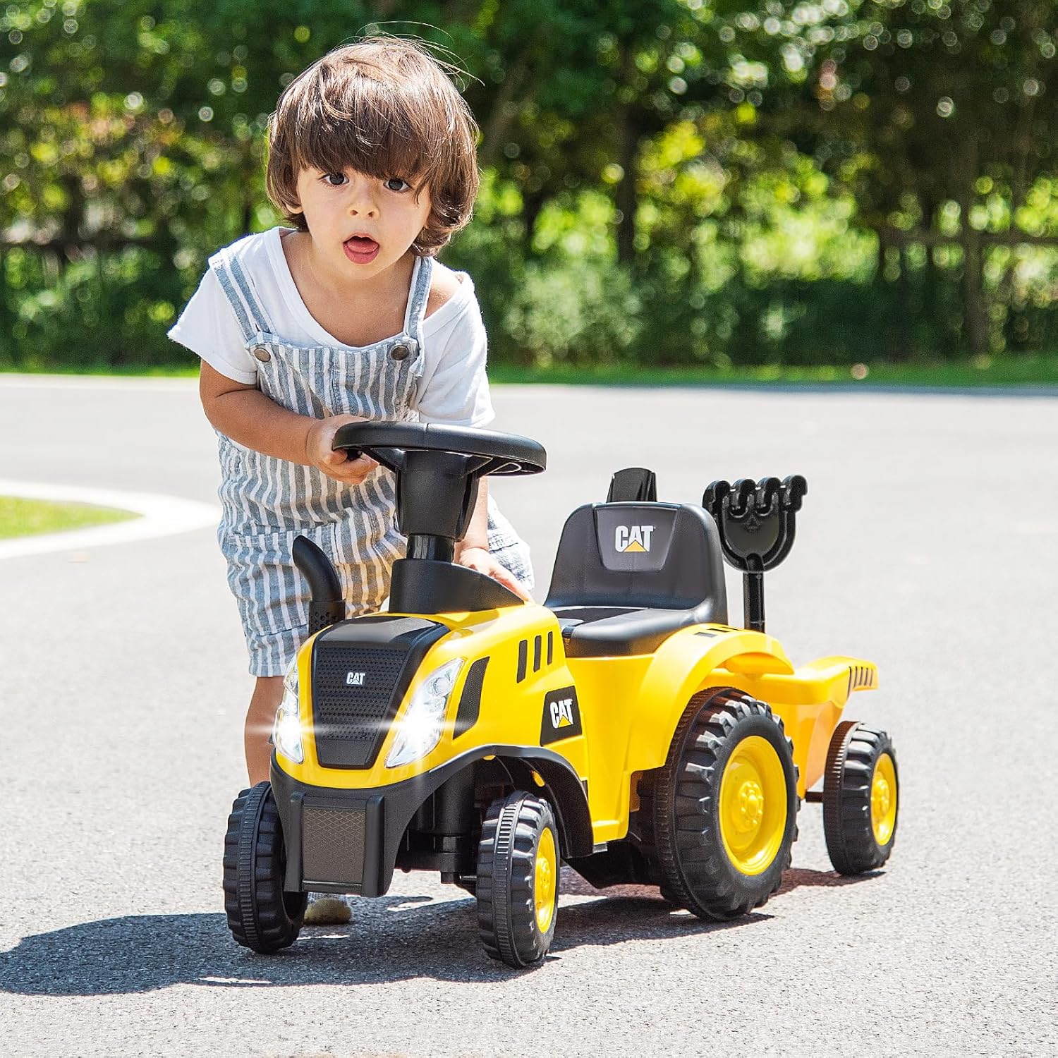 # Trattore convertibile 2 in 1 # Questo trattore Caterpillar con licenza ufficiale si trasforma in un trattore a piedi con rimorchio staccabile, offrendo molto spazio per i giocattoli dei bambini. Lo smontaggio senza attrezzi consente ai bambini di iniziare subito a guidare. # Esperienza di guida divertente # Il trattore a spinta è dotato di suoni realistici del motore e del clacson per immergere il bambino nel divertimento della guida. Inoltre, i fari a LED aggiungono colore al gioco dei bambini. Queste funzioni richiedono 2 batterie AA (non incluse). # Preparatevi alle avventure all'aria aperta # Questo giocattolo scorrevole a due zampe si adatta perfettamente a una varietà di terreni grazie alle sue ruote filettate, consentendo al bambino di affrontare le avventure all'aperto con fiducia. Inoltre, la pala e il rastrello inclusi ispireranno il bambino a essere creativo nella sabbia. # Design ergonomico e sicuro # Progettato pensando al comfort del bambino, questo giocattolo da passeggio senza motore è dotato di un volante facile da impugnare e di un sedile ergonomico con schienale di sostegno. Risponde a standard elevati e riconosciuti per garantire la sicurezza dei bambini e la tranquillità dei genitori. # Il regalo perfetto per il vostro bambino # Questo trattore a spinta non solo aumenta il divertimento, ma allena anche i muscoli delle gambe, migliora la coordinazione, sviluppa le capacità motorie e aumenta la fiducia in se stessi. È il regalo perfetto per i bambini