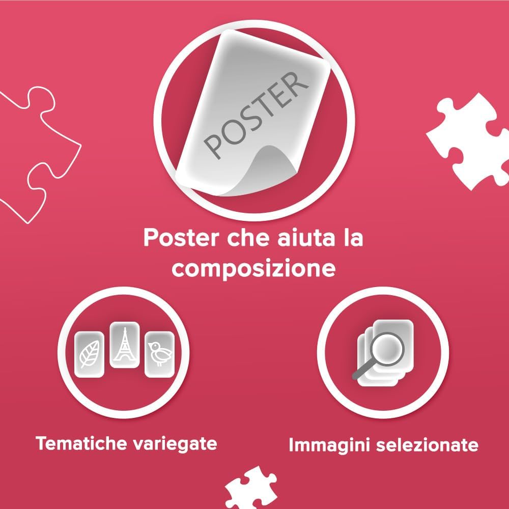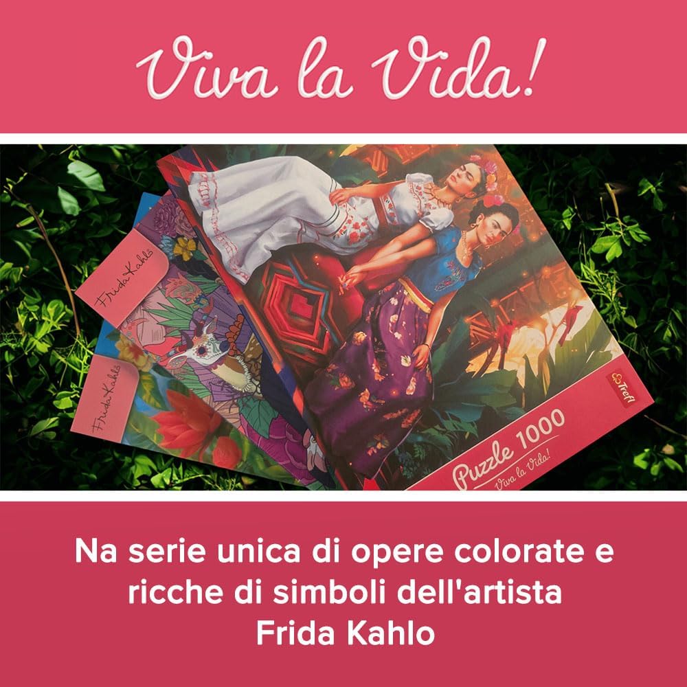 I puzzle da 1000 pezzi PREMIUM PLUS QUALITY si distinguono per la loro perfetta incastro e il cartone di alta qualità. Una volta assemblati, formano un'immagine di 683 x 480 mm che raffigura un ritratto colorato di Frida Kahlo in uno stile illustrativo, ispirato ai suoi autoritratti e ai motivi delle sue opere. Il set include un poster che ti aiuterà a disporre i pezzi! Una serie unica di puzzle ispirati alle opere di Frida Kahlo, che raffigurano il suo mondo colorato e ricco di simboli. Il prodotto è certificato FSC ed è stato realizzato con attenzione all'ambiente, utilizzando materiali di alta qualità. Abbiamo deciso di non utilizzare pellicola di plastica sulla confezione, che è sigillata solo con due adesivi. Ottimo allenamento per la memoria, sviluppo delle abilità manuali, esercizio di concentrazione, pazienza e percettività. Un regalo unico per gli appassionati di puzzle, adulti e bambini dai 14 anni in su.