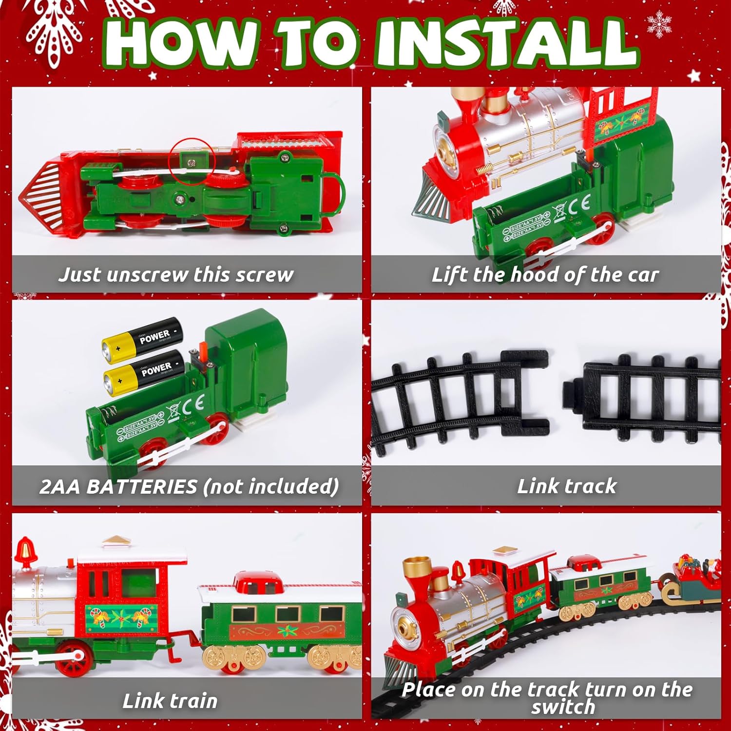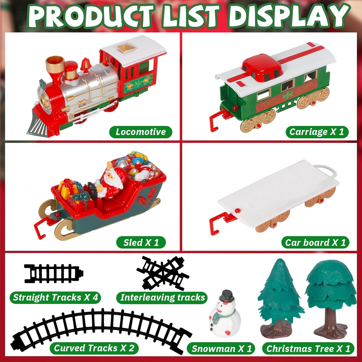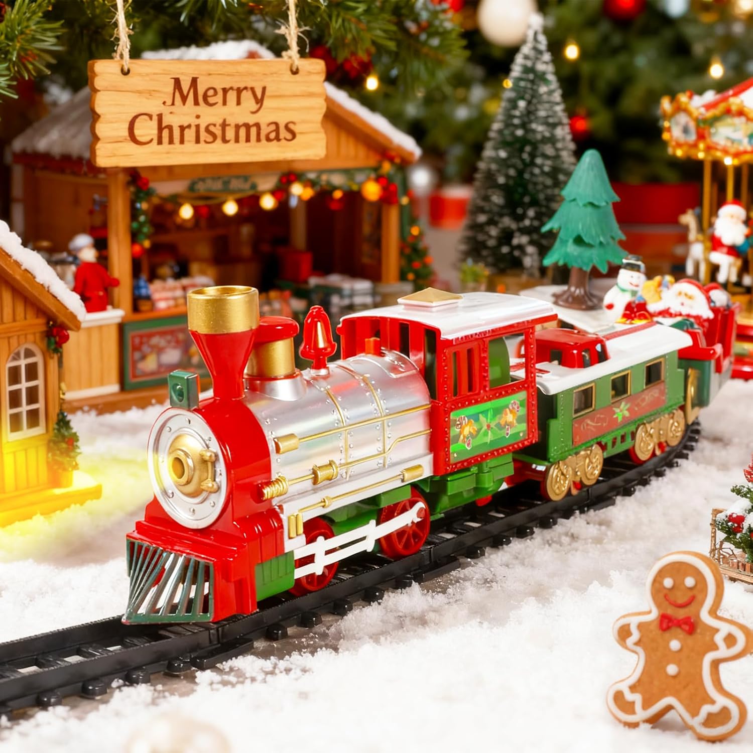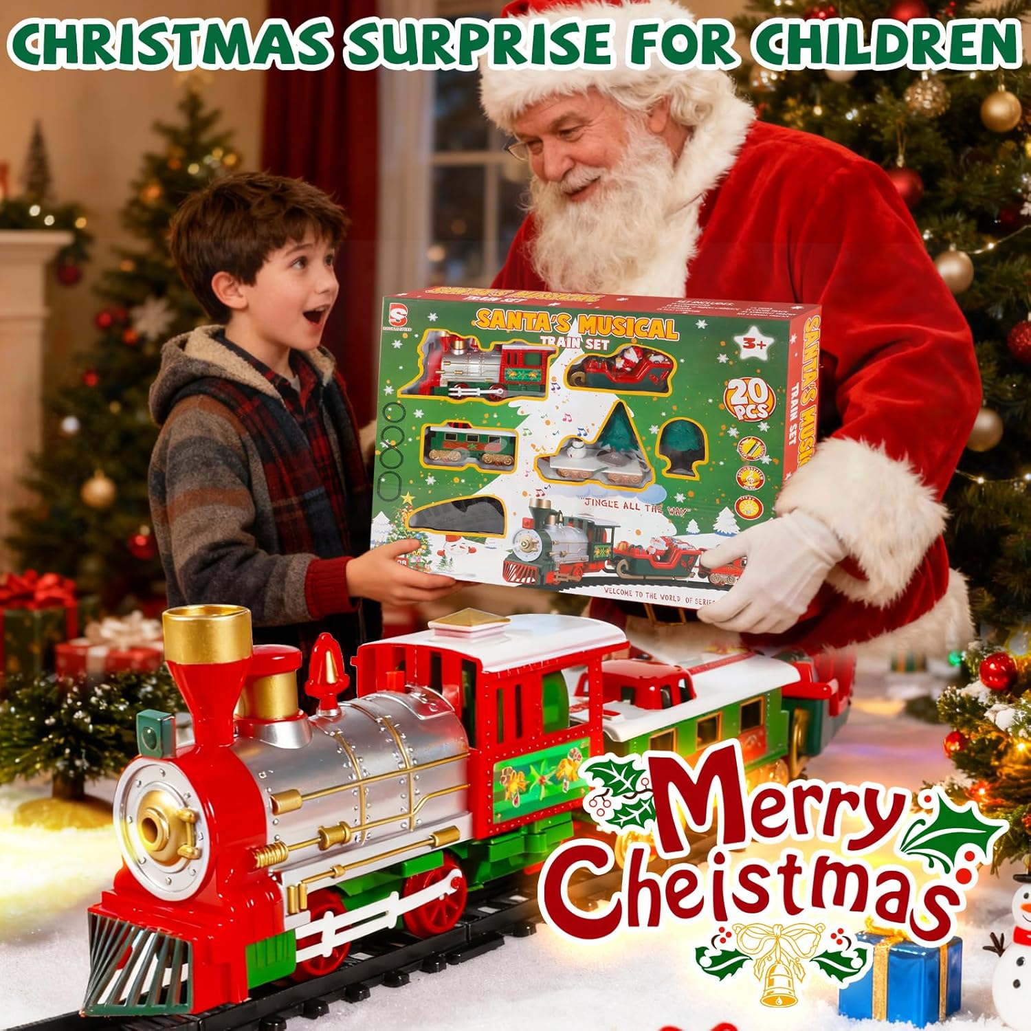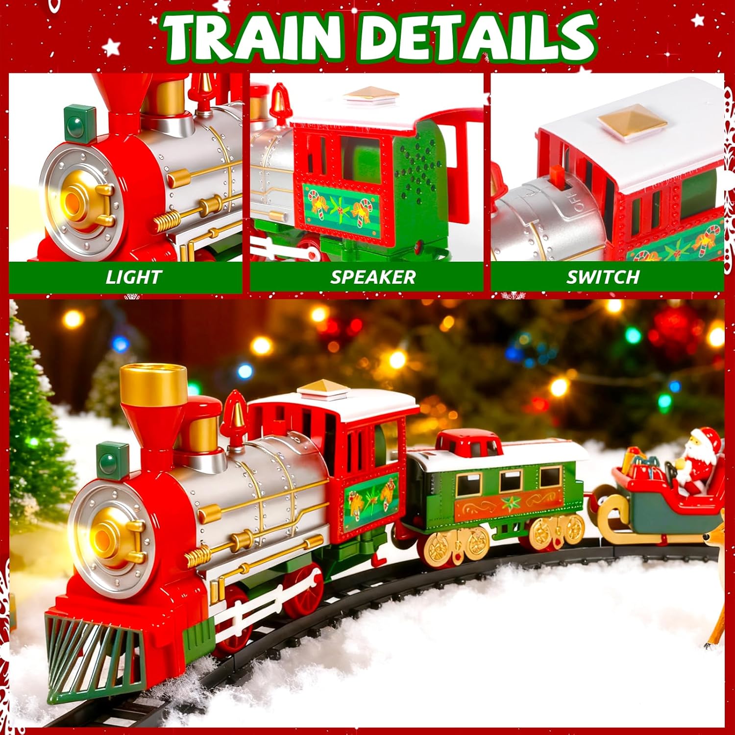 【Nuovo gioco di treno di Natale creativo】:Il nostro gioco di treno per albero di Natale comprende un treno elettrico, un vagone con Babbo Natale, un vagone per passeggeri, un vagone per regali e accessori di binario adatti – un gioco lussuoso per i bambini! Usa il treno per decorare elegantemente l’albero di Natale e passare vacanze di Natale calorose in famiglia con i tuoi figli. 【Robusto e durevole】:Il treno elettrico per albero di Natale è realizzato in plastica resistente; i binari sono dotati di bottoni a pressione – non cadono facilmente, sono stabili da installare e il treno scorre senza intoppi. Inoltre, emette suoni che simulano quelli di un treno, stimolando perfettamente l’entusiasmo dei piccoli e dei bambini per questo giocattolo. 【Metodo di installazione semplice】:Assembla semplicemente i 4 vagoni e i binari, connetti l’elettricità – e il treno scorre felice! Con luci e suoni realistici, circola senza intoppi sul binario. Questo divertente giocattolo di treno elettrico stimola inoltre l’immaginazione e le capacità pratiche del tuo figlio. 【Gioco di treno elettrico 3-in-1】:Il gioco di treno per albero di Natale contiene tre vagoni diversi: uno con Babbo Natale, uno per regali e uno per passeggeri – una riproduzione perfetta di un classico di Natale, che soddisfa il desiderio dei bambini di ricevere regali di Natale. Un ottimo regalo per ragazzi e ragazze di 3, 4, 5, 6, 7 e 8 anni. 【Decorazione creativa per albero di Natale】:Il gioco di treno di Natale è perfetto per decorare l’albero di Natale! Viene fornito in un imballaggio di regalo di Natale elegantemente progettato, che aggiunge un tocco extra di atmosfera festiva. In questo modo, l’albero di Natale guadagna non solo estetica, ma anche divertimento e valore. Un regalo speciale e creativo per famiglia, amici o bambini!