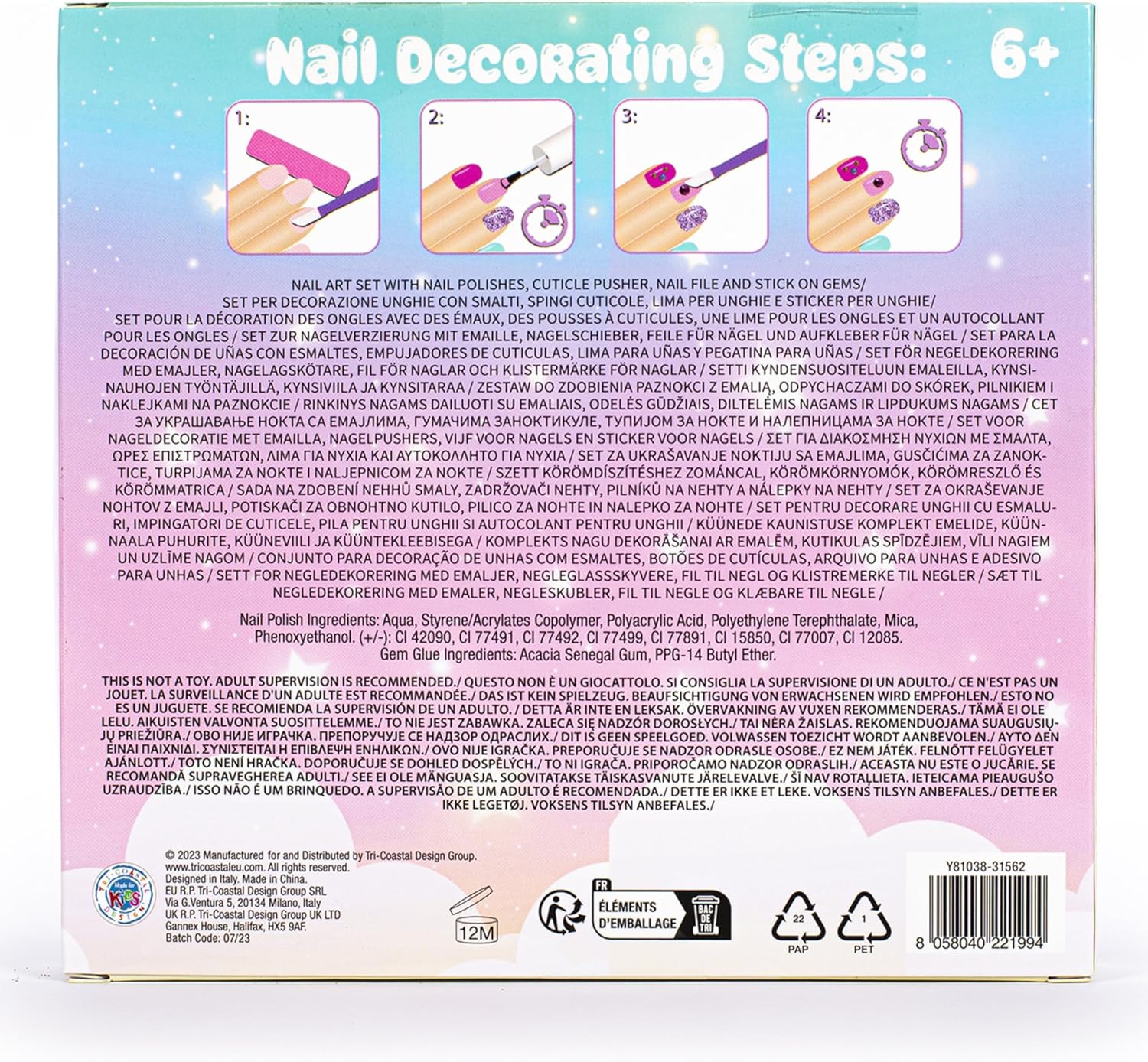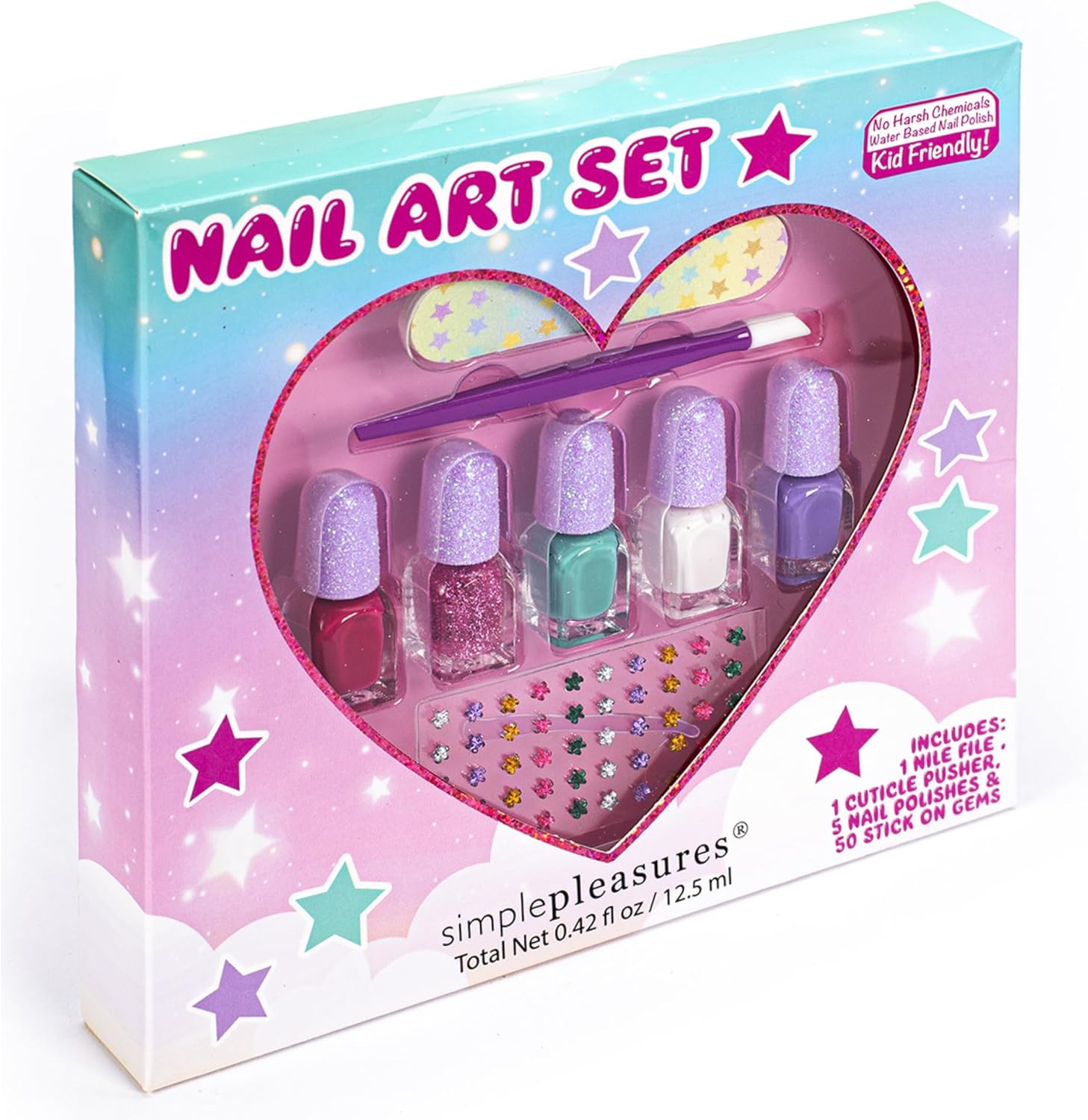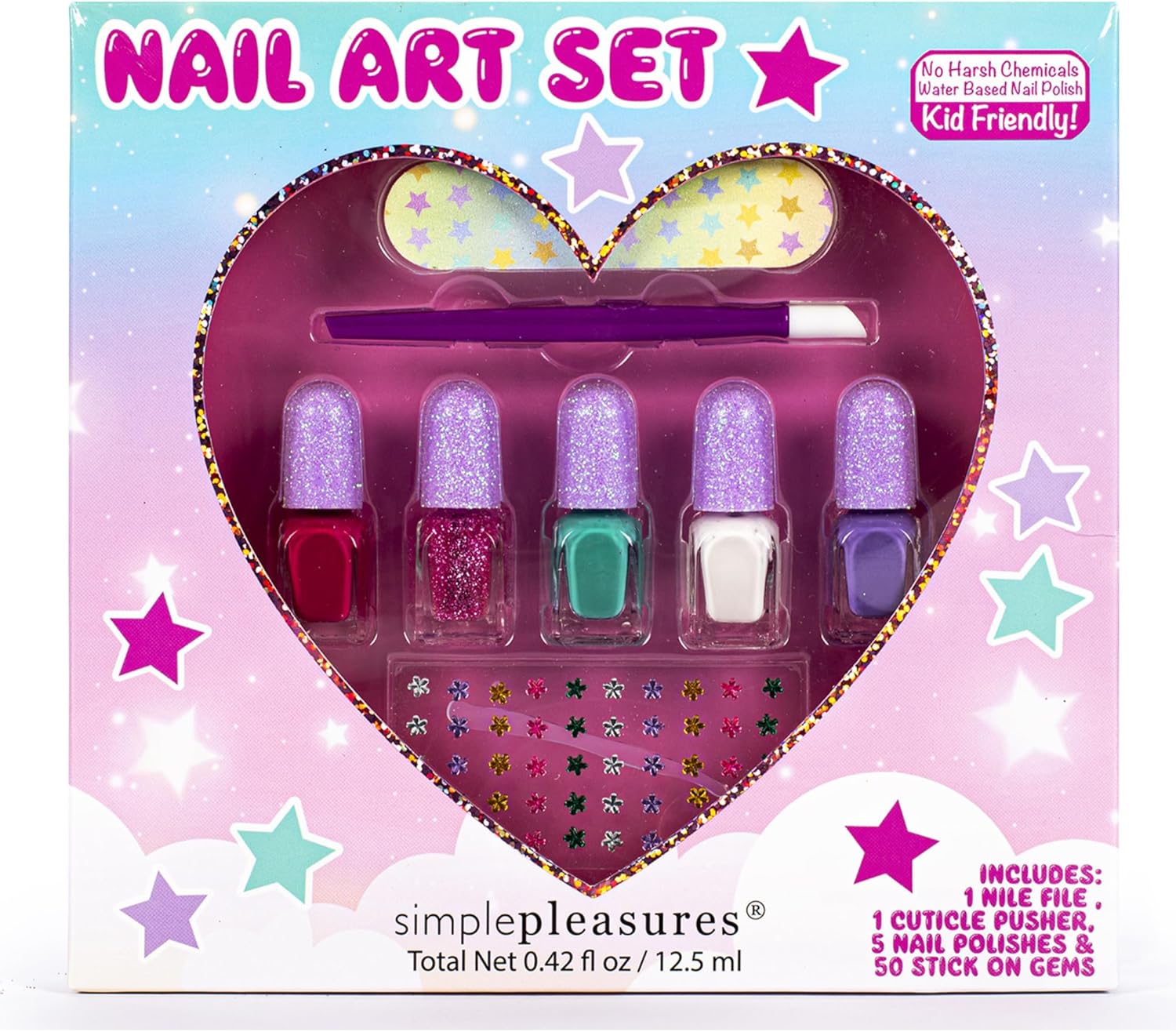 STILE: dona alle tue unghie infinita lucentezza e colore con questo assortimento di 5 tonalità scintillanti. Inoltre gli stencil e le gemme danno quel tocco glamour alla tua manicure VELOCE E FACILE: Colori sbalorditivi e adesivi facili da applicare, si asciugano rapidamente, sono di lunga tenuta e si rimuovono peel-off con acqua calda PURA ELEGANZA: il set di smalti per unghie con mini flaconi trasparenti ti offre una visione accurata per scegliere il colore desiderato. Lo spingi cuticole e la limetta completano la tua manicure da sogno REGALO ALLA MODA: i simpatici personaggi presenti sulla confezione lo rendono grazioso alla vista