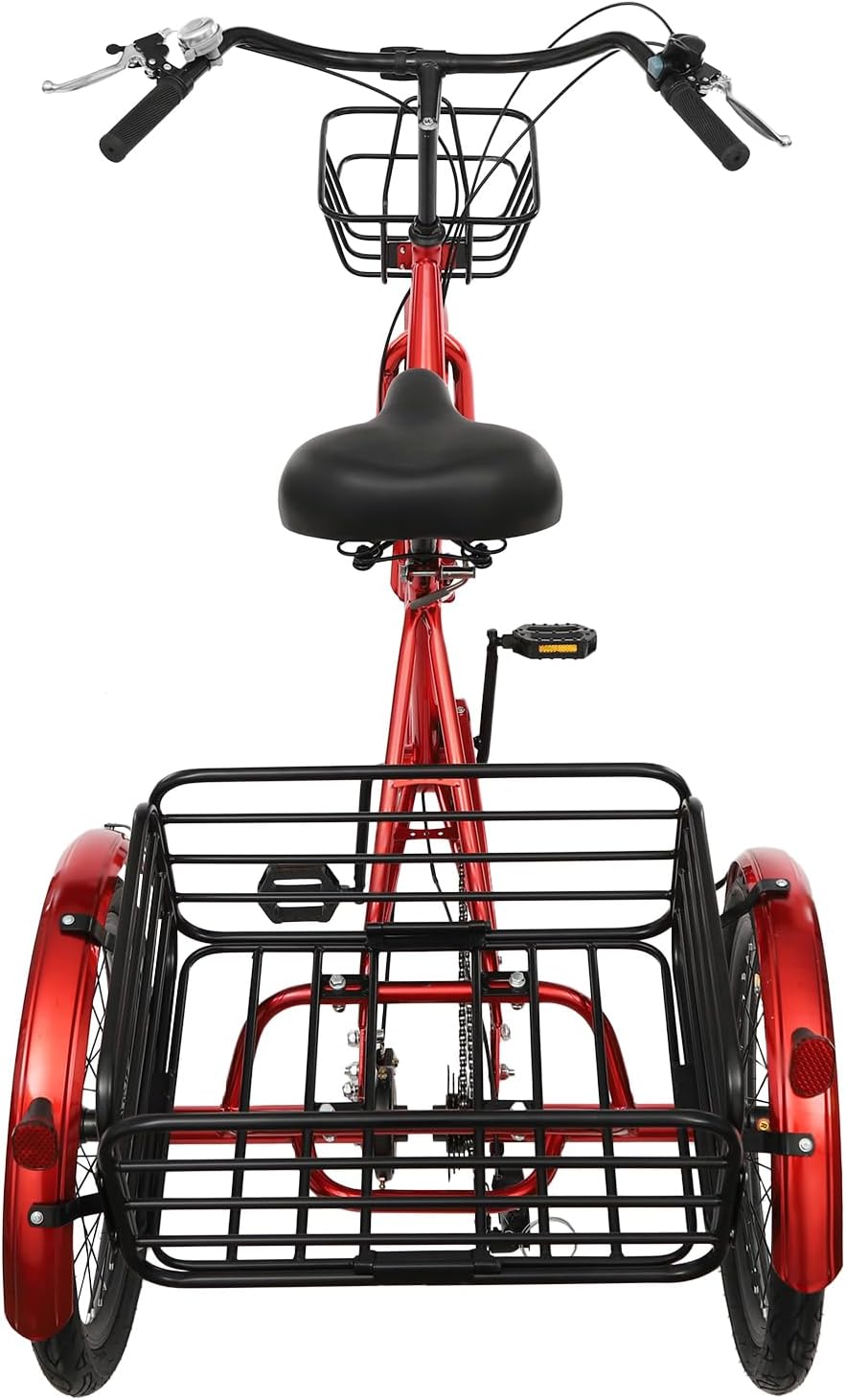 Il nostro triciclo pieghevole per adulti è realizzato in acciaio al carbonio, gomma, PVC, PU e spugna di alta qualità mediante verniciatura a forno, che è antiruggine, resistente alla corrosione, antiurto e non facilmente invecchiato o sbiadito, che può essere utilizzato in sicurezza per lungo tempo. Il freno a disco anteriore e il freno a tamburo posteriore sono molto reattivi e forniscono eccellenti prestazioni di frenata per una guida più sicura. Inoltre, il campanello e le luci di allarme possono avvisare efficacemente i passanti. La larghezza complessiva di 29,5 pollici consente un'entrata e un'uscita agevoli dall'ascensore e riduce il rischio di ribaltamento. Con il pulsante di controllo della velocità e la chiave sul manubrio, puoi regolare facilmente la velocità (7 marce) per adattarla a diversi terreni come pendenze, strade pianeggianti o tratti stradali sconnessi, rendendo la tua guida più personalizzata e risparmiando manodopera. Il design pieghevole lo rende facile da maneggiare. Il sedile è imbottito con una spugna che sostiene morbidamente i fianchi, ammortizza gli urti e rende la pedalata più confortevole. I cestini aperti posteriori e anteriori consentono di trasportare generi alimentari, forniture o altri acquisti quotidiani per i picnic o la spesa in famiglia. Il sedile può essere regolato tra 30,3 pollici e 36,6 pollici e l'altezza del manubrio può essere regolata tra 35,4 pollici e 41,3 pollici, adatta a utenti di diverse altezze. I materiali di alta qualità assicurano che il triciclo abbia una capacità di carico fino a 286,6 libbre, che può essere utilizzata dalla maggior parte degli adulti