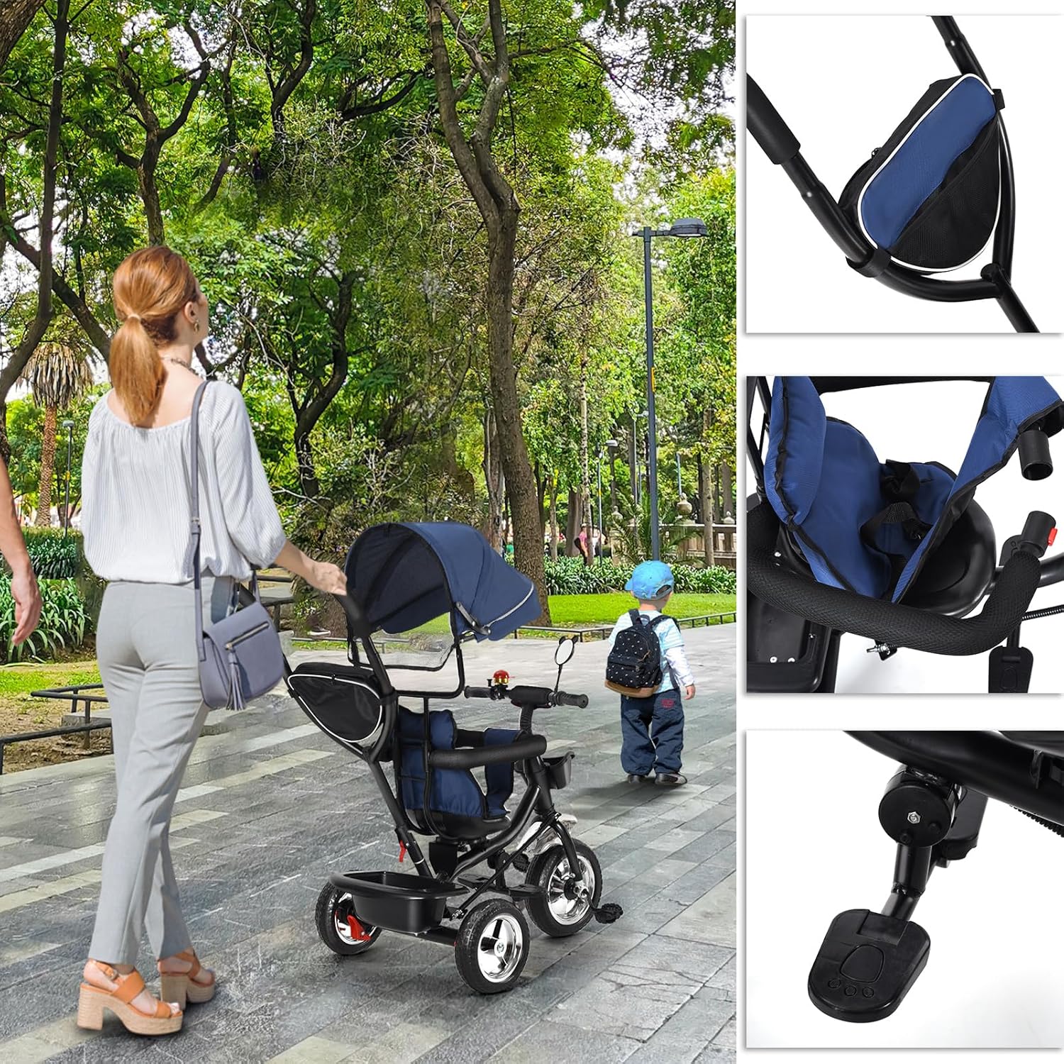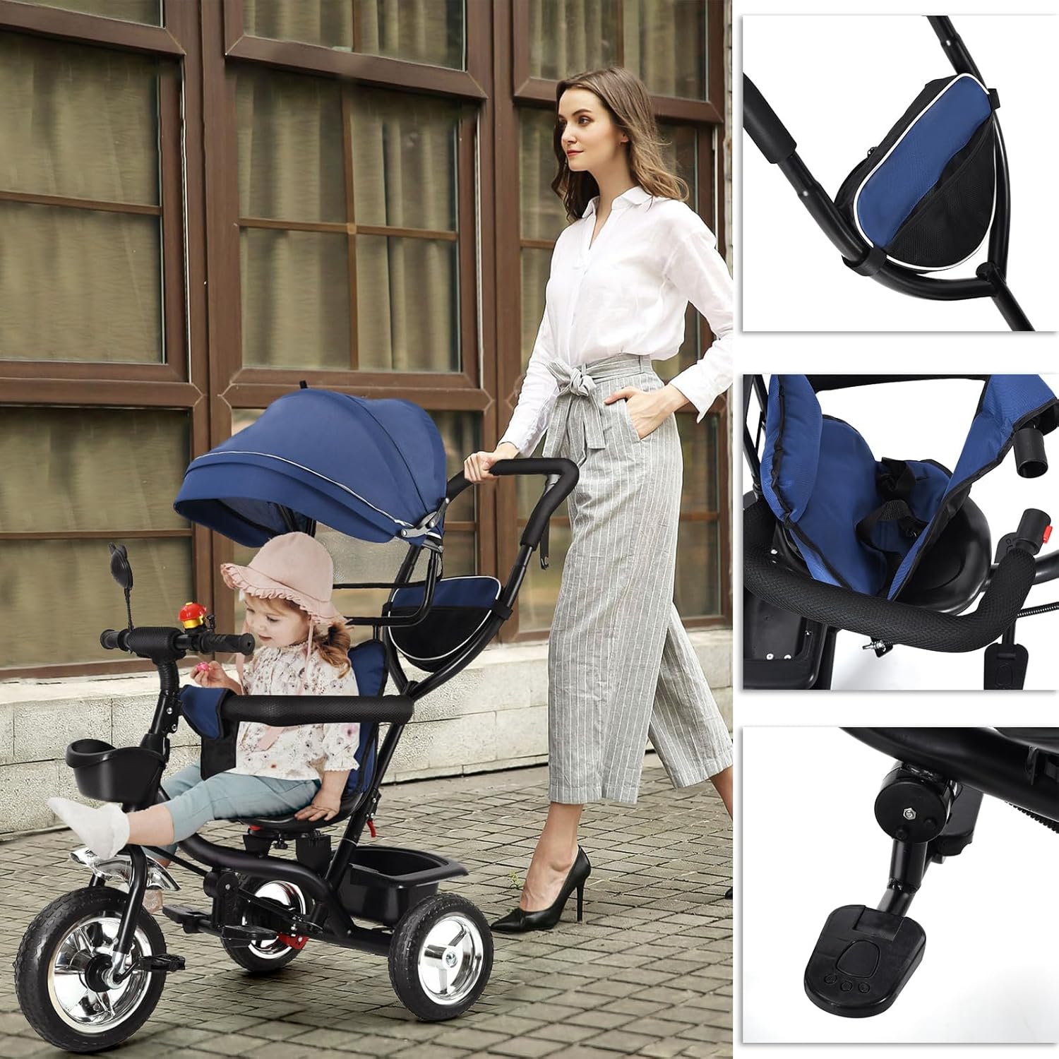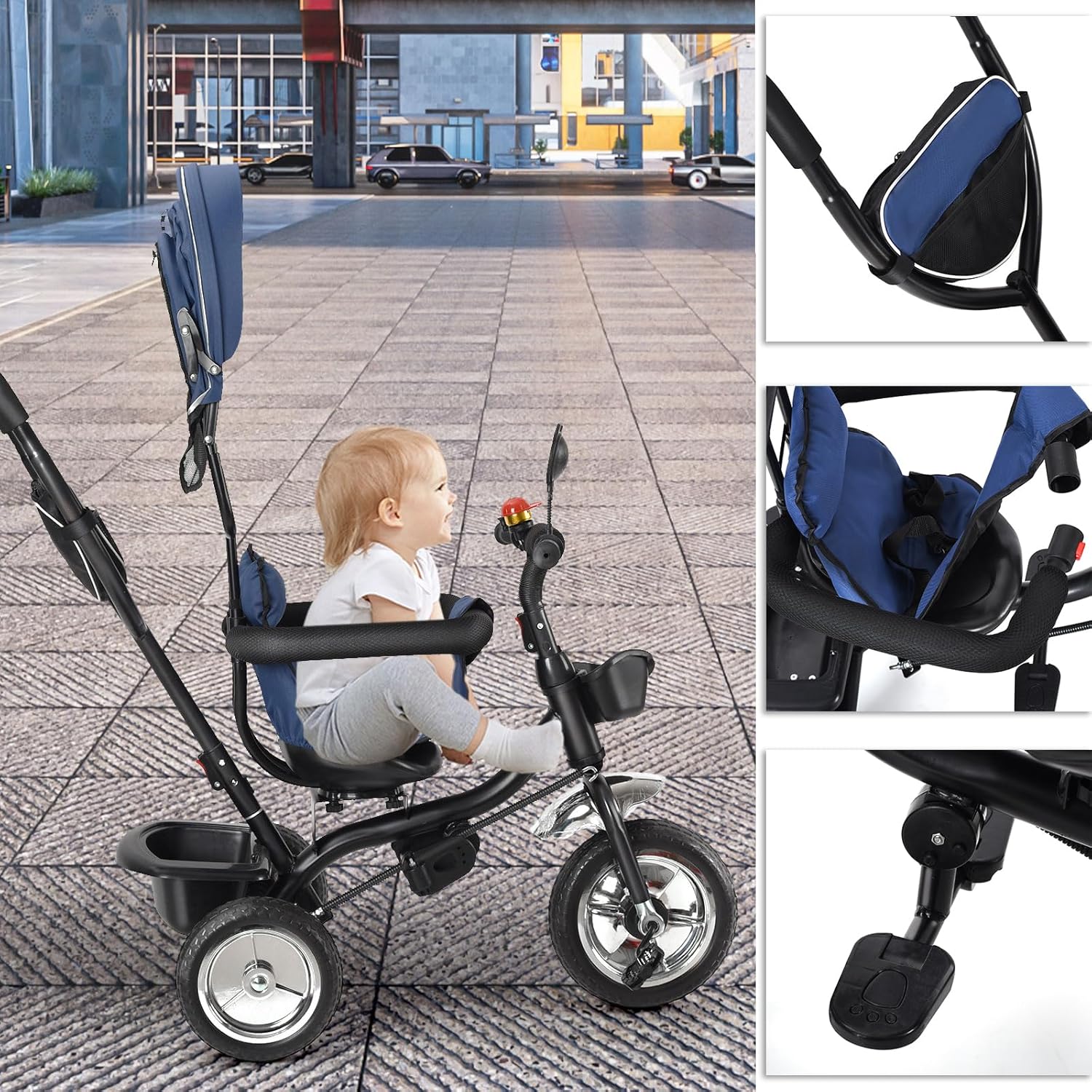 TRICICLO 4 IN 1 PER TUTTE LE ETÀ - Questo triciclo per bambini cresce con te: da 1 anno come carrello a spinta, successivamente come triciclo con barra di spinta e infine come triciclo indipendente da 2-4 anni fino a 25 kg. CON ASTA DI SPINTA E CONTROLLO GENITORE - La maniglia genitore regolabile in altezza consente il pieno controllo della direzione e della velocità. Ideale per le passeggiate quando il tuo bambino si stanca o ha bisogno di sicurezza. CONFORTEVOLE E SICURO - Il sedile girevole per il contatto visivo, l'imbracatura a 5 punti e la barra protettiva rimovibile garantiscono sicurezza. La capottina con protezione solare protegge dai raggi UV, dalla pioggia e dal vento. DESIGN COMPATTO E TANTO SPAZIO - Il triciclo è facile da piegare e si adatta a quasi tutti i bagagliai. Con cestino anteriore e ampio cestino posteriore per giocattoli, snack o spesa, perfetto per i viaggi. RUOTE ROBUSTE E QUALITÀ DUREVOLE - I pneumatici EVA per carichi pesanti sono a prova di foratura, ammortizzano e silenziosi. Insieme ad un telaio stabile, il triciclo garantisce molti anni di divertimento per bambini e genitori.