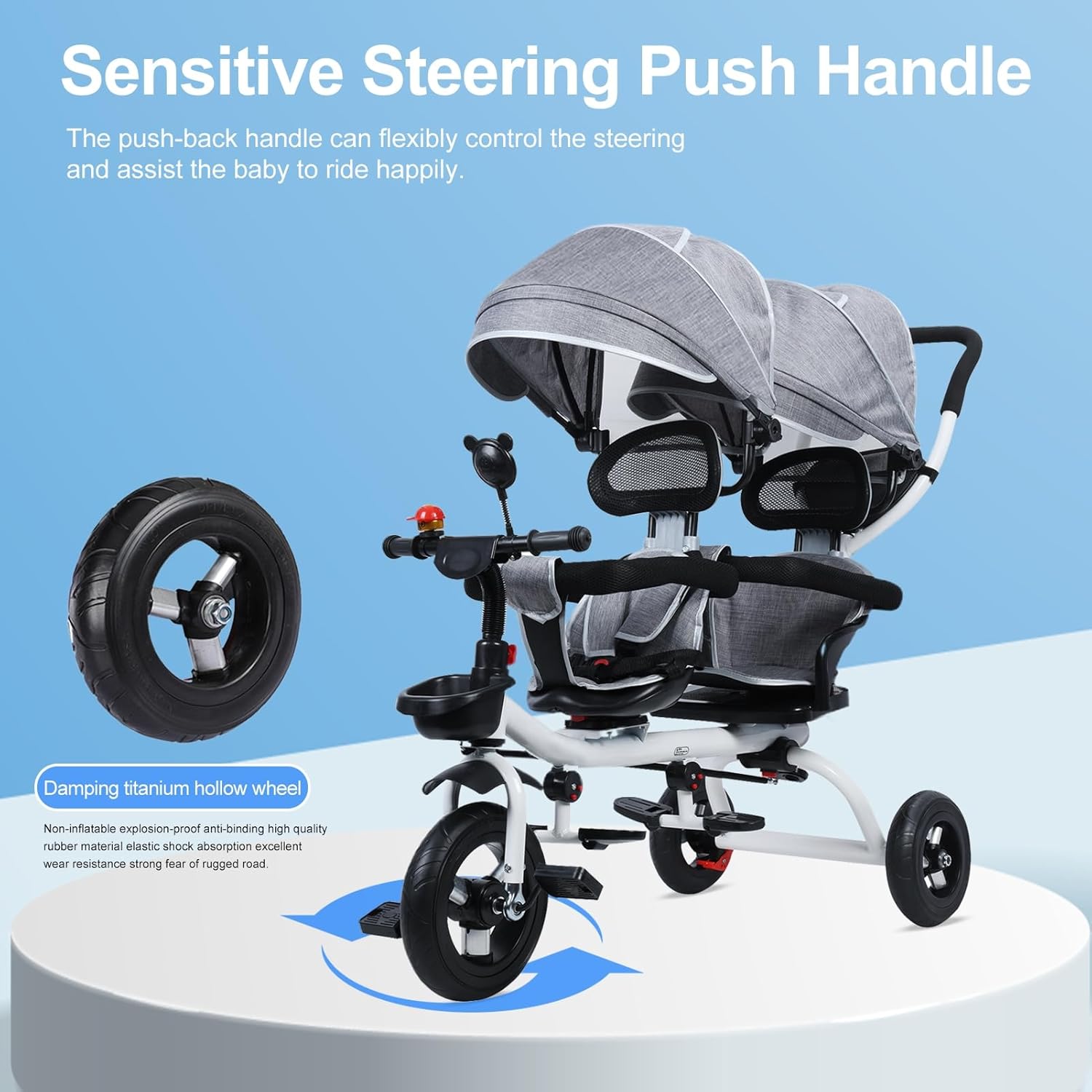 Triciclo stabile a due posti con caratteristiche di sicurezza Il telaio ad A rinforzato e la doppia seduta offrono viaggi sicuri per due bambini (fino a 220 libbre). La capottina protegge dalla luce solare e la maniglia di spinta fornisce il controllo parentale quando necessario. Facilità di montaggio con design sicuro della ruota facile da installare in pochi minuti con le istruzioni incluse. Le ruote in gomma chiuse prevengono lesioni ai piedi e forniscono trazione, mentre la ruota anteriore sovradimensionata migliora la stabilità dello sterzo. Costruzione in ferro di alta qualità per una maggiore durata Il telaio in acciaio al carbonio antiruggine resiste all'usura e agli strappi, garantendo che il gioco attivo duri per anni. La superficie liscia previene i graffi e mantiene un aspetto lucido. Spazioso per riporre e giocare con dimensioni compatte (50 x 98 x 100 cm), questo triciclo passa facilmente attraverso porte e negozi standard. Il design accurato massimizza lo spazio di seduta senza compromettere la manovrabilità. Ideale per lo sviluppo e il divertimento all'aria aperta, favorisce l'equilibrio e la coordinazione mentre i bambini pedalano insieme. Adatto per asili nido, parchi o passeggiate di quartiere, è un regalo pratico per vacanze, compleanni o occasioni speciali.