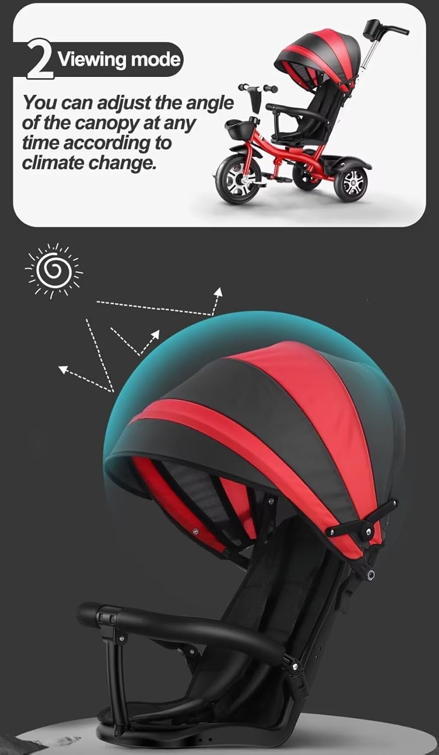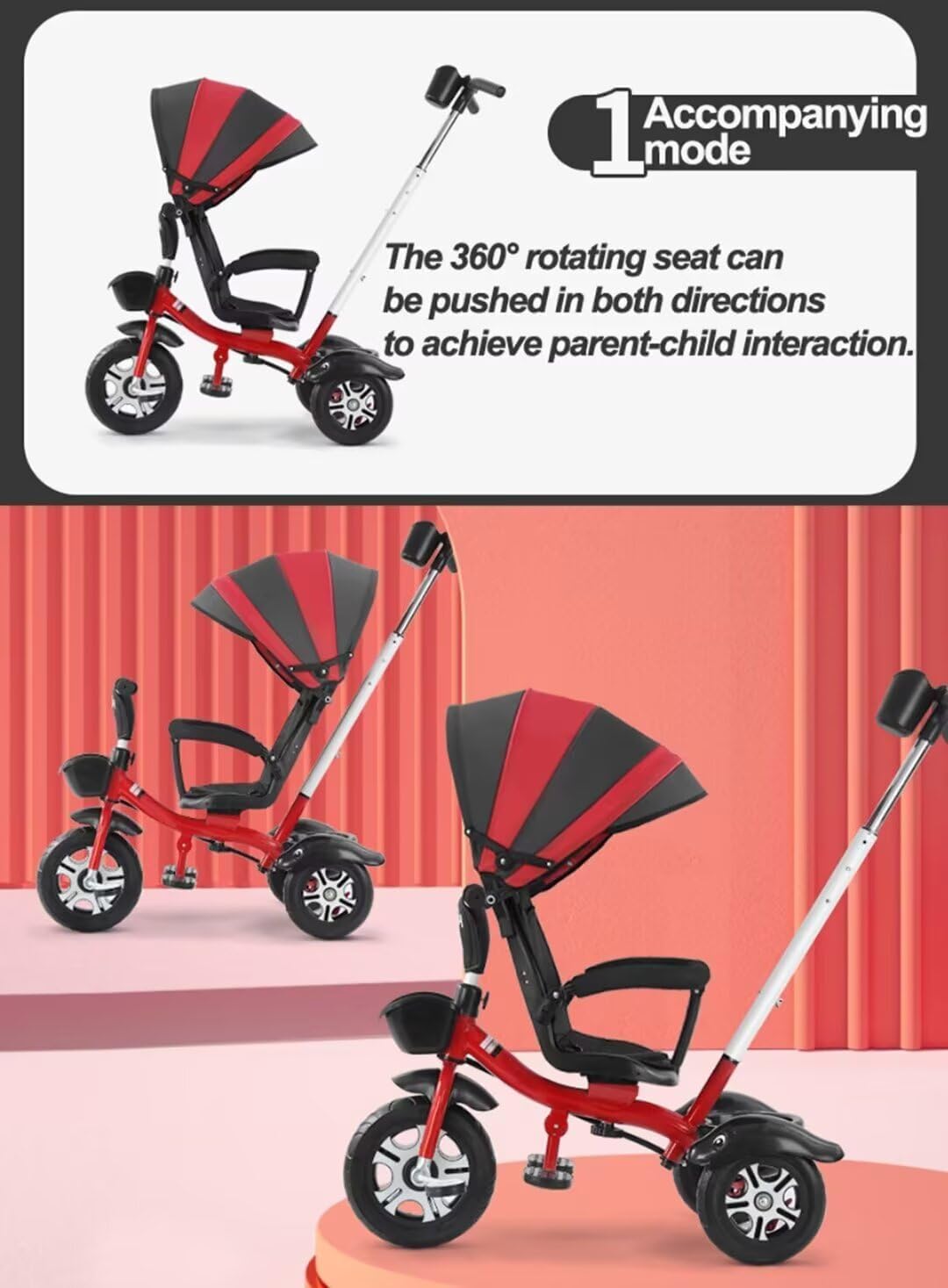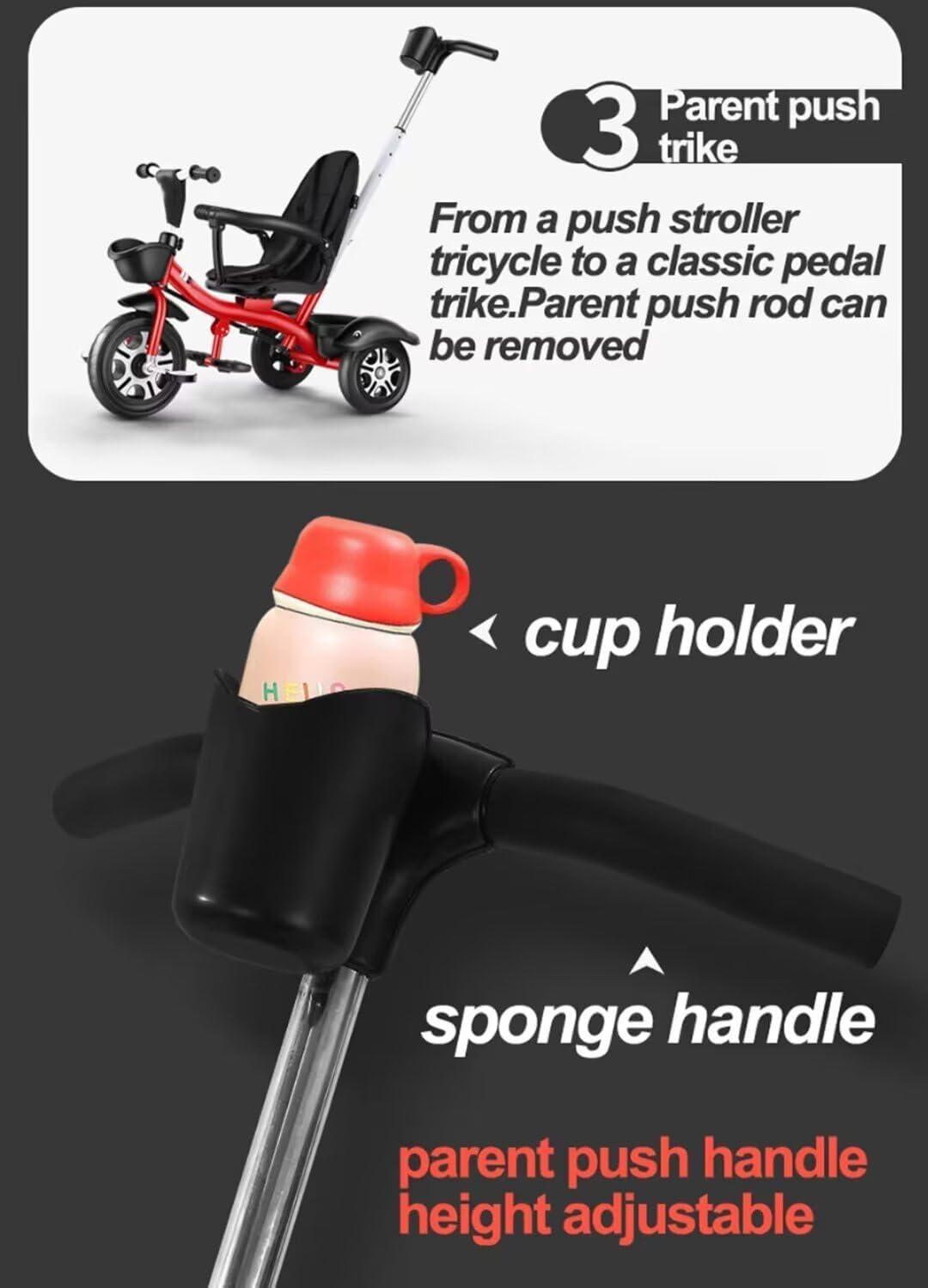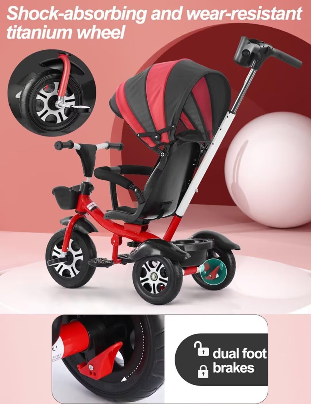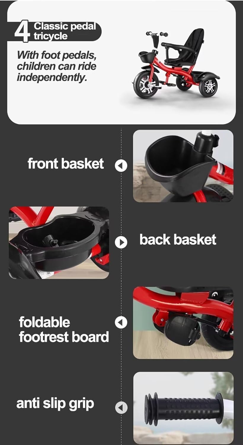 【Triciclo per bambini piccoli】 I pedali sulla ruota anteriore, che possono ruotare le ruote pedalando, allenano la forza delle gambe del bambino. Il manubrio può essere ruotato in modo flessibile per allenare in anticipo la capacità di sterzata del bambino. 【Triciclo a spinta】 Dotato di maniglie per genitori rimovibili, questo triciclo consente ai genitori di guidare e spingere facilmente il loro piccolo. 【Materiale di alta qualità】 Realizzato in acciaio al carbonio ad alta resistenza, garantisce stabilità ed elevata capacità di carico. Gli pneumatici airless offrono un'eccellente resistenza allo scivolamento e all'usura, rendendoli adatti a vari tipi di superfici stradali. 【Freni a pedale】 Questo triciclo per bambini ha ruote in titanio, la parte posteriore del triciclo ha 2 freni. Puoi fermare e bloccare la bici con un leggero calcio. 【Sedile comodo】 Il sedile girevole con schienale alto/cintura di sicurezza/parapetto. Sotto c'è un poggiapiedi pieghevole sul quale i piedi dei bambini possono essere posizionati in sicurezza quando i genitori sono in modalità spinta.