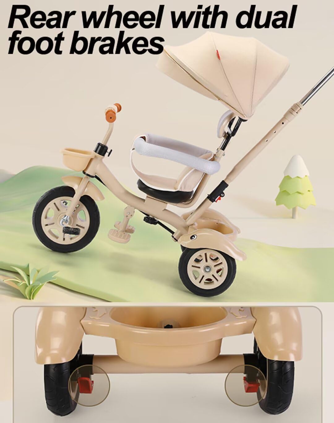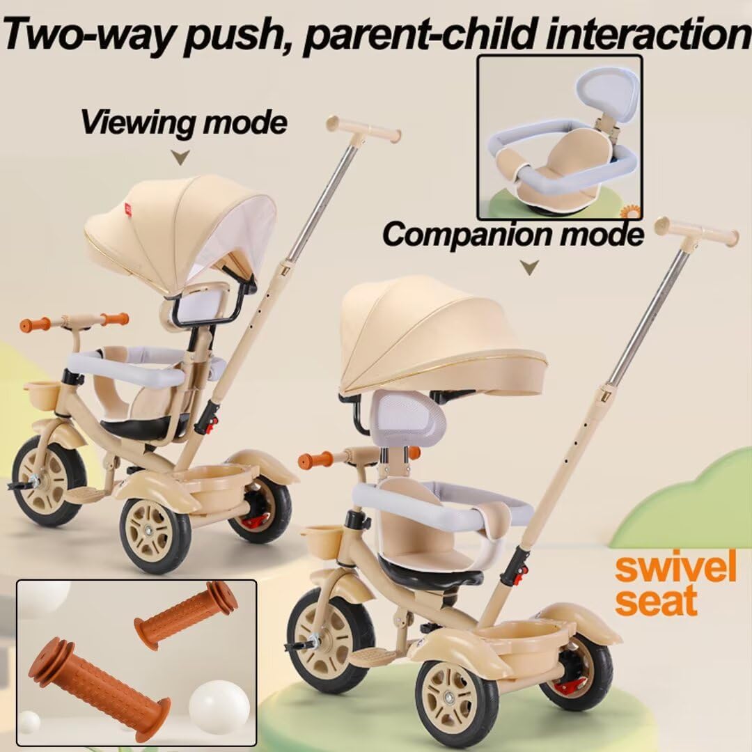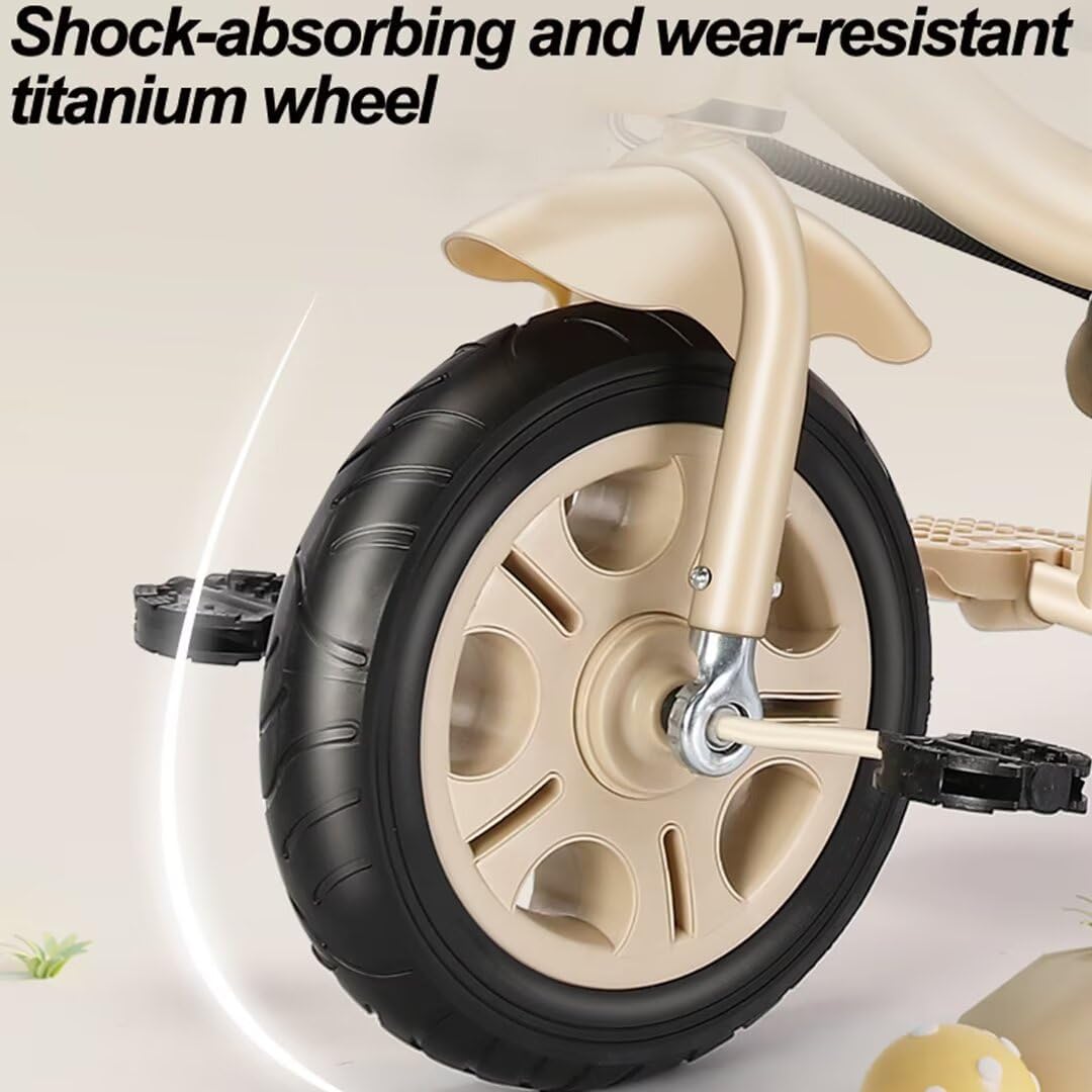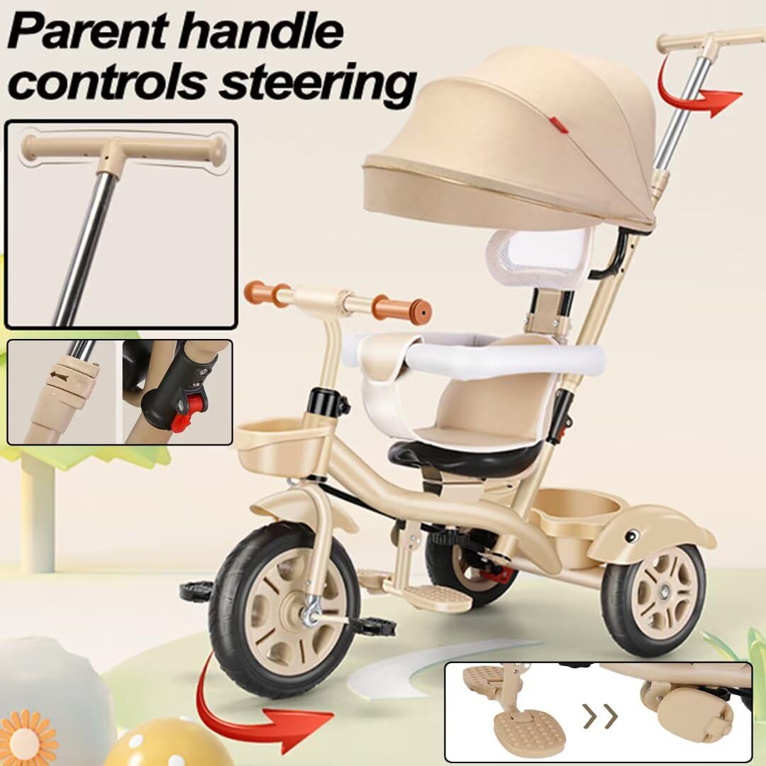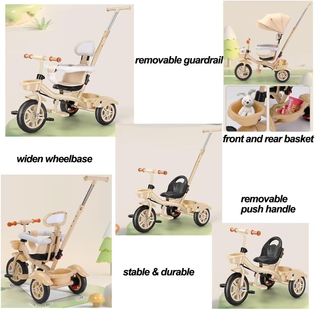 【Triciclo a 3 ruote】Sedile girevole con poggiatesta/guardrail. Nella modalità di spinta dei genitori i piedi del bambino possono essere posizionati in modo sicuro sul poggiapiedi. 【Passeggino robusto】 Il telaio del triciclo è realizzato in acciaio al carbonio di alta qualità, con una struttura triangolare estremamente stabile e una saldatura fine avanzata e può supportare un peso di 30 kg. 【Passeggino con assistenza parentale e triciclo con pedali】 Modalità passeggino con assistenza parentale: il collegamento dell'asta di spinta posteriore alla ruota anteriore, la direzione è completamente controllata dai genitori. Modalità triciclo con pedali - Con i pedali sulla ruota anteriore, il tuo bambino potrà esercitarsi a pedalare e guidare il triciclo in modo indipendente. 【Ruota in titanio】 Questo triciclo per bambini è dotato di ruote in titanio, che ti consentono di spingere facilmente il triciclo per bambini sul lungomare, sulla strada in cemento, sulla strada asfaltata o sulla strada asfaltata. Le ruote posteriori con doppi freni ti aiutano a mantenere il triciclo in posizione. [Utente applicabile] Questo triciclo può trasportare un carico massimo di 30 kg. La fascia d'età approssimativa è 2-5 anni, altezza adatta 80-125 cm, ordinala in base all'effettivo sviluppo del bambino.