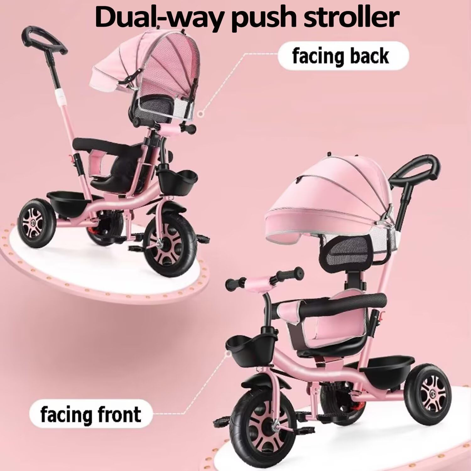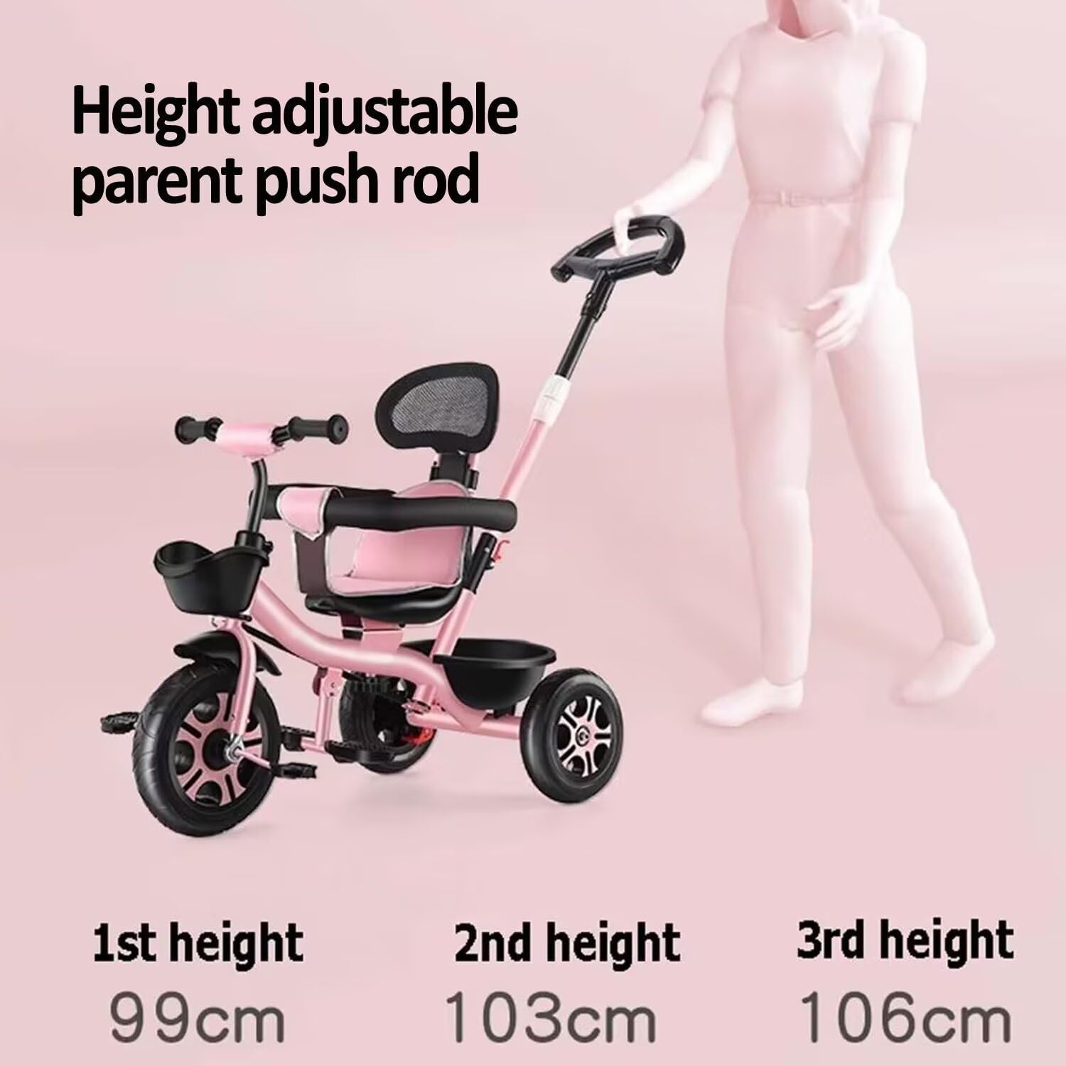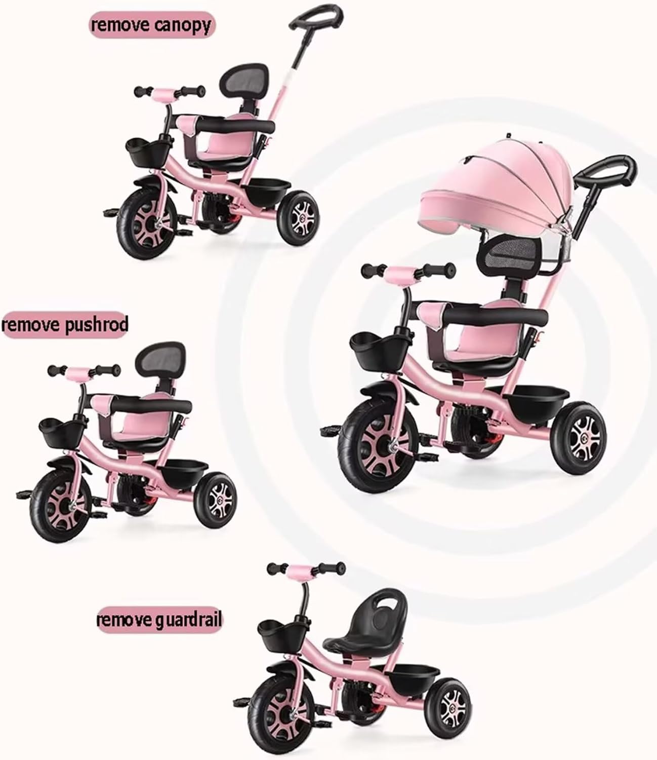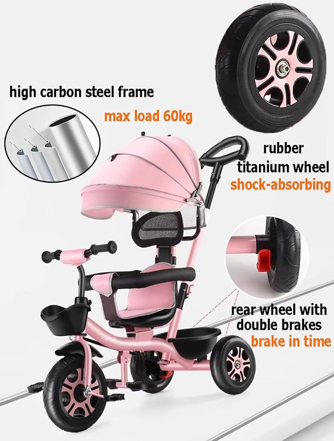 【Triciclo 5 in 1】 È adatto a bambini dai 18 mesi ai 5 anni. Questo passeggino può essere utilizzato come passeggino, triciclo con sterzo per genitori, triciclo per l'apprendimento della guida e triciclo classico per adattarsi ai bambini nelle diverse fasi. È possibile smontare la capottina, la ringhiera protettiva e la barra di spinta posteriore in base all'altezza del bambino. 【Passeggino Resistente per Bambini Piccoli】 Il telaio del triciclo è realizzato in acciaio al carbonio di alta qualità con struttura triangolare estremamente stabile e saldatura fine avanzata e può supportare un peso di 60 kg. 【Carrello a spinta e triciclo a pedali dell'Assistente Genitore】Modalità carrello a spinta dell'Assistente Genitore - La barra di spinta posteriore è collegata alla ruota anteriore, la direzione è completamente controllata dai genitori e la barra di spinta regolabile è adatta a genitori di diverse altezze. Modalità triciclo a pedali – Con i pedali sulla ruota anteriore, il tuo bambino può esercitarsi a pedalare e guidare il triciclo in modo indipendente. 【Ruota in titanio ammortizzante】 Questo triciclo è dotato di ruote in titanio ammortizzanti, le ruote hanno una buona elasticità e resistenza all'usura. Il forte assorbimento degli urti rende gli pneumatici adatti a varie strade e hanno una lunga durata. Le ruote posteriori con doppi freni ti aiutano a fermare il triciclo in posizione. 【Sedile regolabile】 Il sedile con schienale alto con ringhiera offre protezione per il tuo bambino. Pedana pieghevole sotto il sedile su cui possono essere posizionati in sicurezza i piedi dei bambini in modalità spinta del genitore.